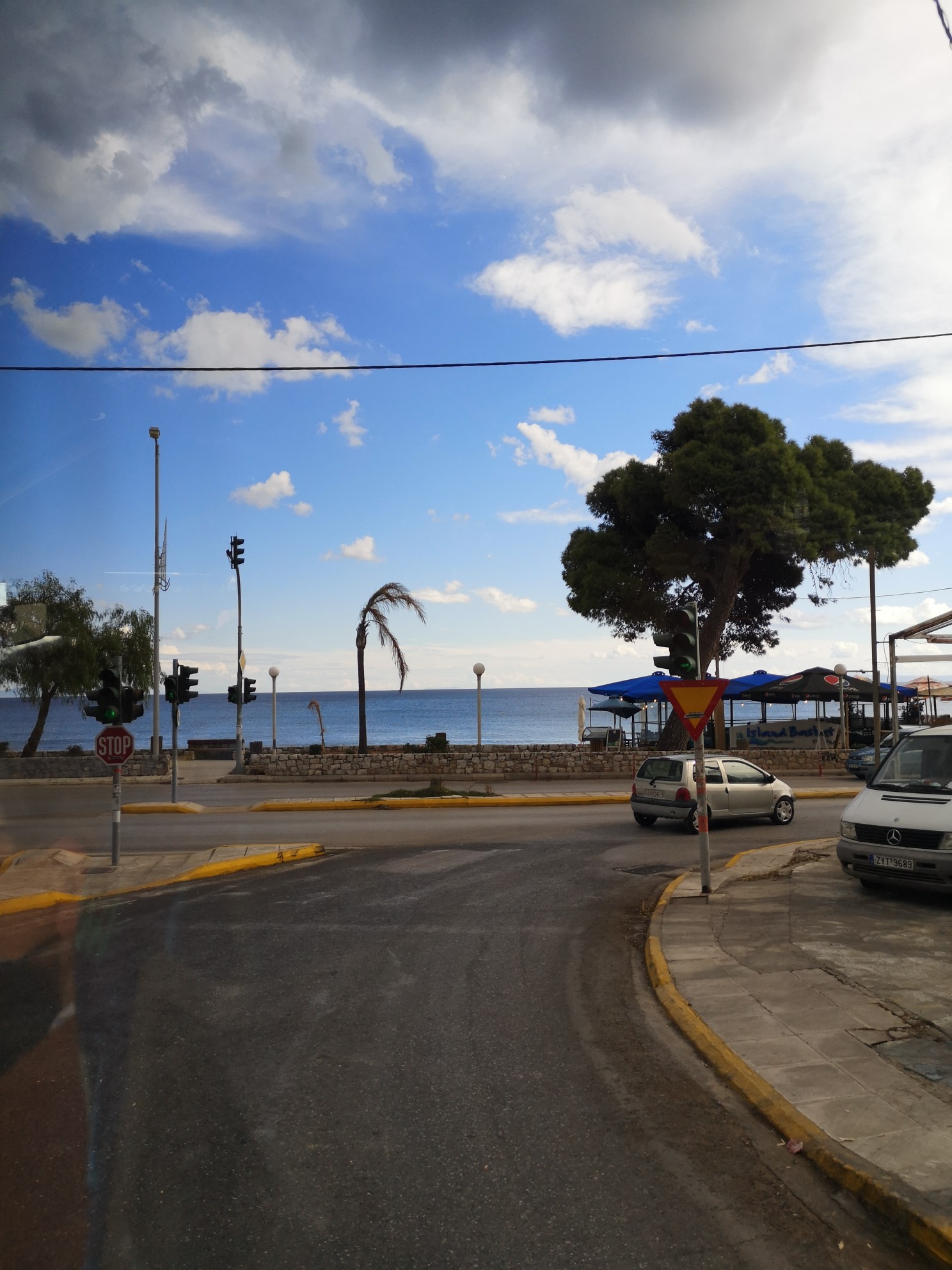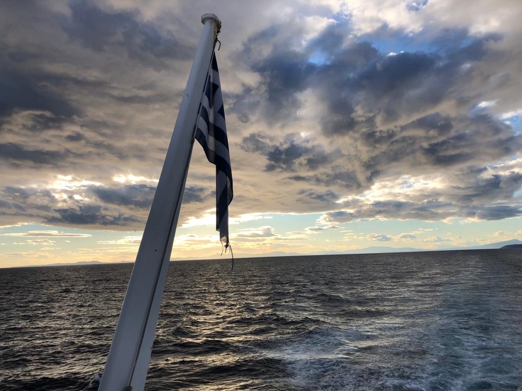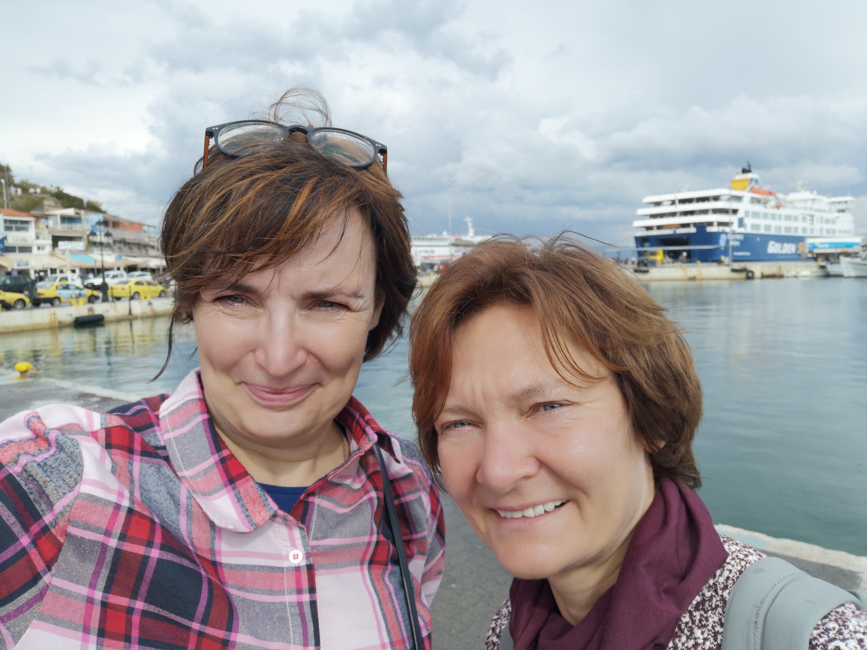 After 1 1/2 years, this was my first flight with a mask – the new fashion accessory. We took off from Berlin in bad weather, rain. Outlook for Greece: cloudy, rainy. We arrive there after a 2 1/2 hour flight in sunshine. But thunderclouds came up. By bus we went to Rafina, to the ferry port, at 2.10 pm. There we had an hour to get something to eat. Preferably take away, but that’s not so easy in Greece. We found a small restaurant that packed us calamari and white wine for 10 euros, which we then ate on the ferry.