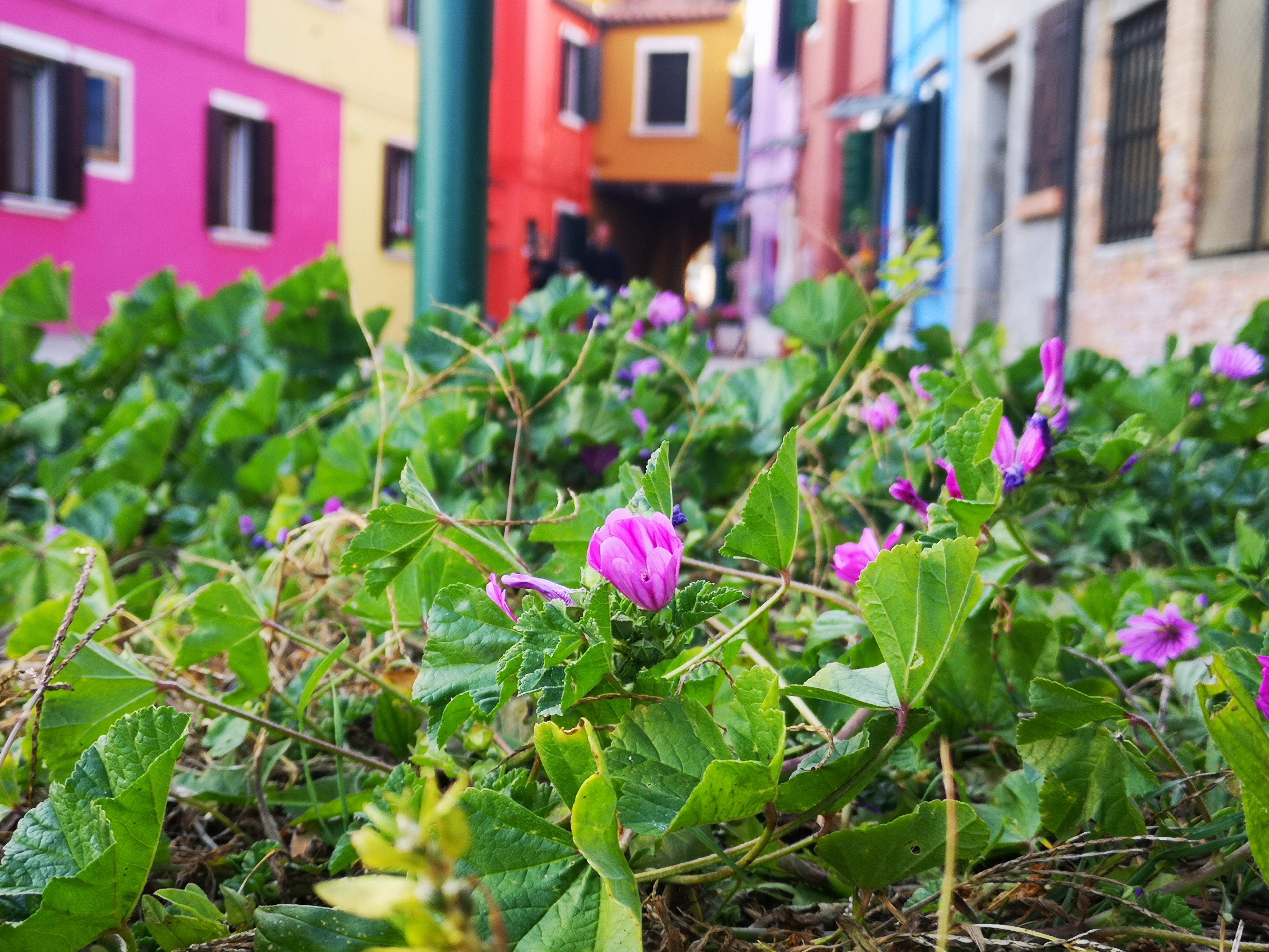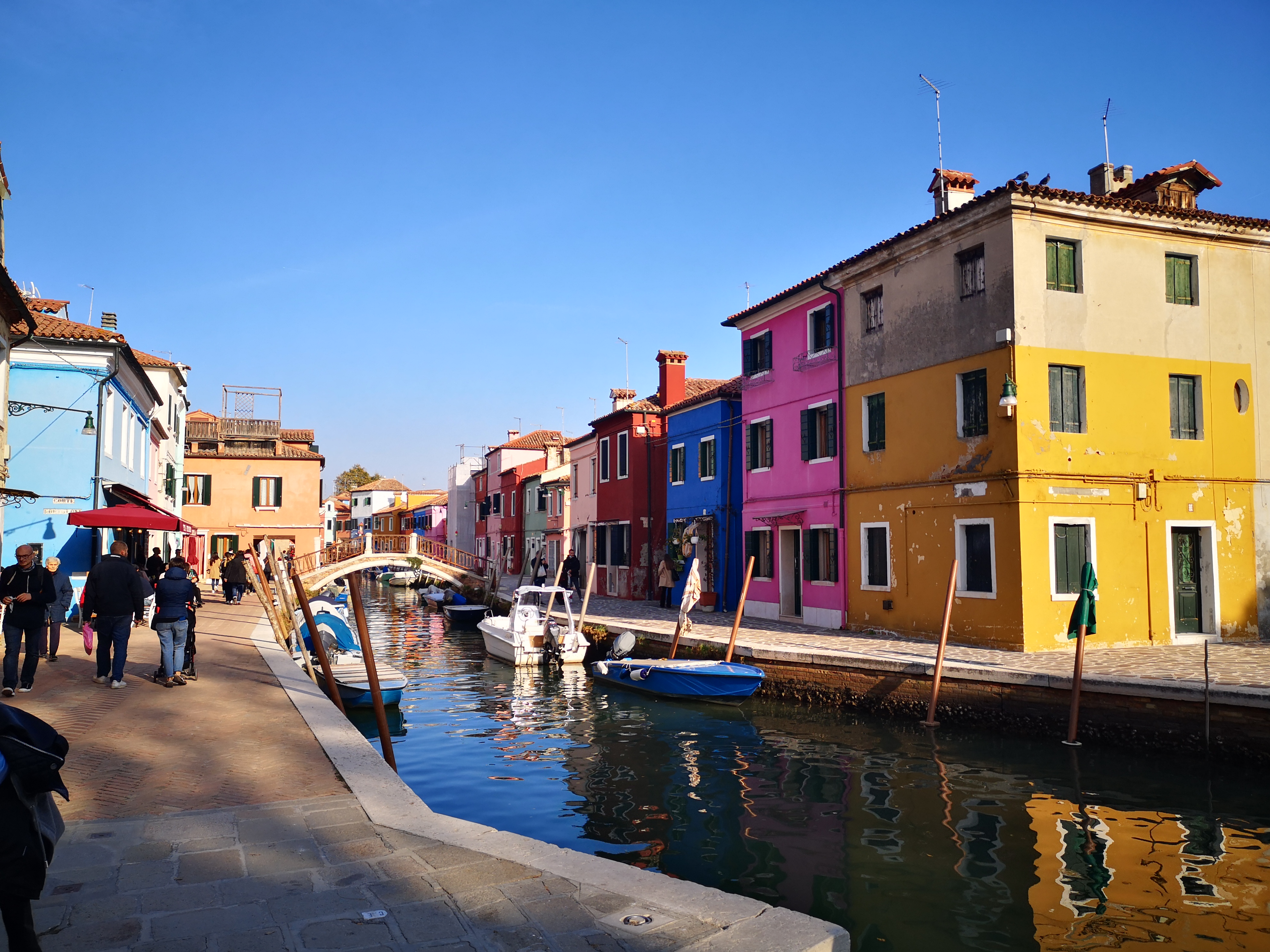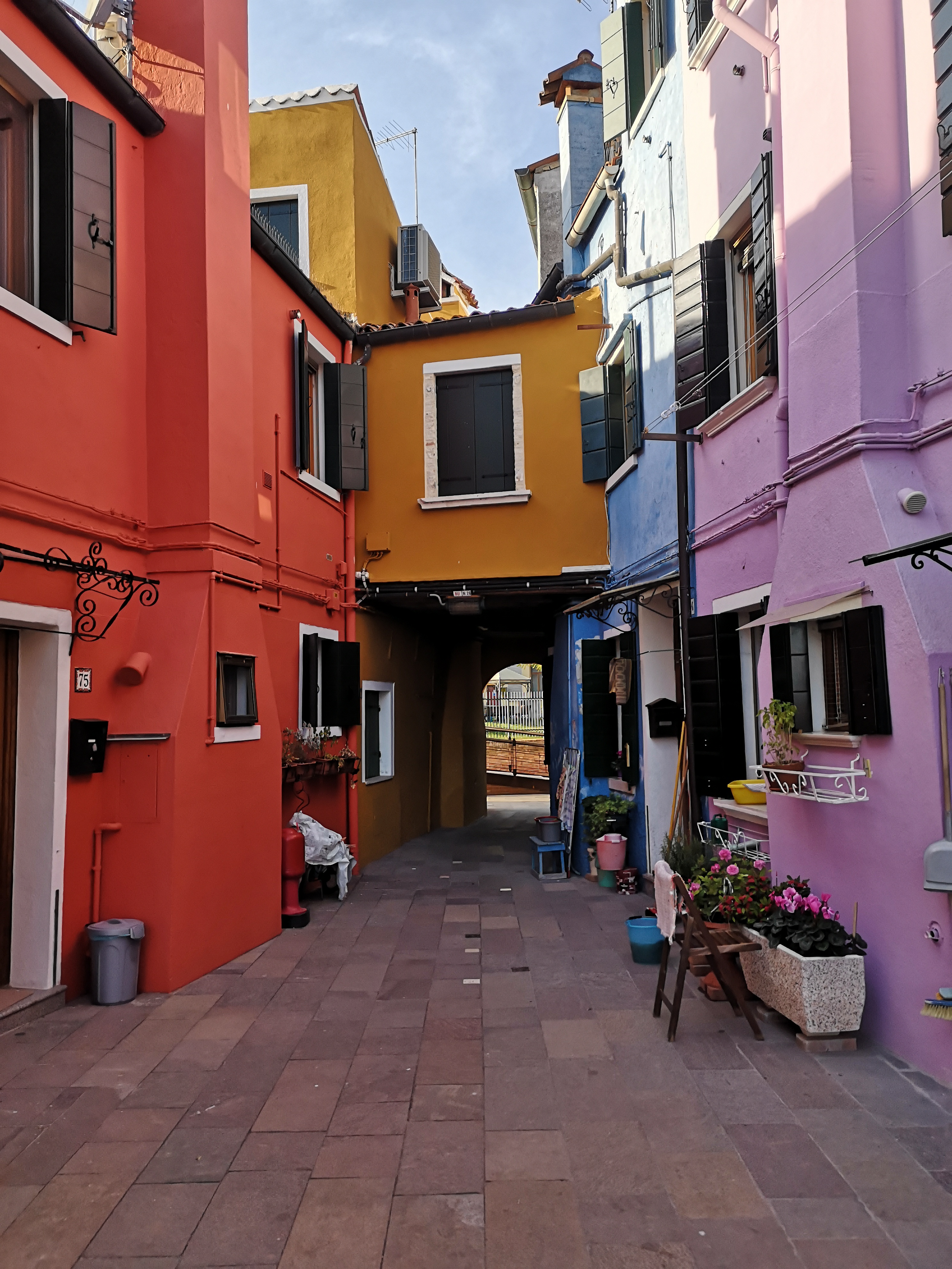 Am Samstag / Sonntag sah es dann schon ganz anders aus in der Stadt der Gondeln, Brückchen, Rollerkoffer. Die Italiener hatten ein langes Wochenende. Am Montag (1. November) wird auch Allerheiligen begangen. Und das spürte man. Im Vergleich zum Freitag war die Stadt wesentlich voller. In einigen engen Gassen ging es ganz langsam voran, eng auf eng. Vorsichtshalber setzte ich mir meine Mascherina auf. Da das Wetter laut App nur am Samstag schön sein sollte, entschieden wir uns, am Samstag alles draußen zu machen und am Sonntag Museen zu besuchen. Wir gingen den gesamten Weg vom Vortag ab, diesmal bis zum Markusplatz und fuhren mit der Vaporette (Boot) Nr. 12 nach Burano – einer Insel in allen Farben. Auch hier waren eine ganze Menge Menschen. Und wir suchten uns die Seitenwege, weg von den Touristenshops, genossen die farbigen Häuser – pink, lila, gelb, grün, blau, rot, die im Sonnenlicht so richtig schön leuchteten. Und hier gönnte ich mir den obligatorischen Apporol Sprizz, den in Venedig alle Touris trinken müssen. Überall sieht man dieses Orange auf den Tischen. Und ich dachte mir, in der bunten Stadt passt das doch ganz gut.
