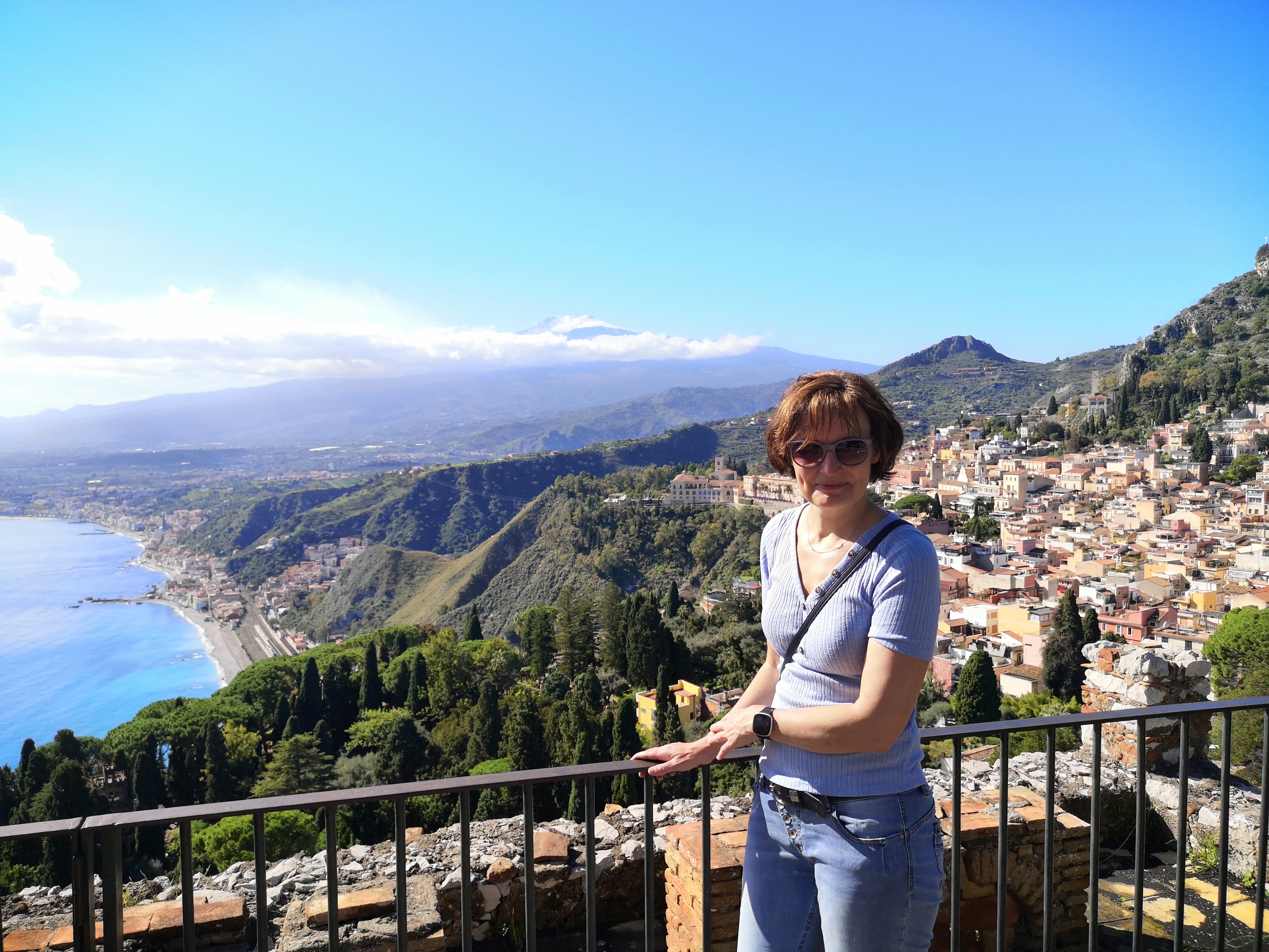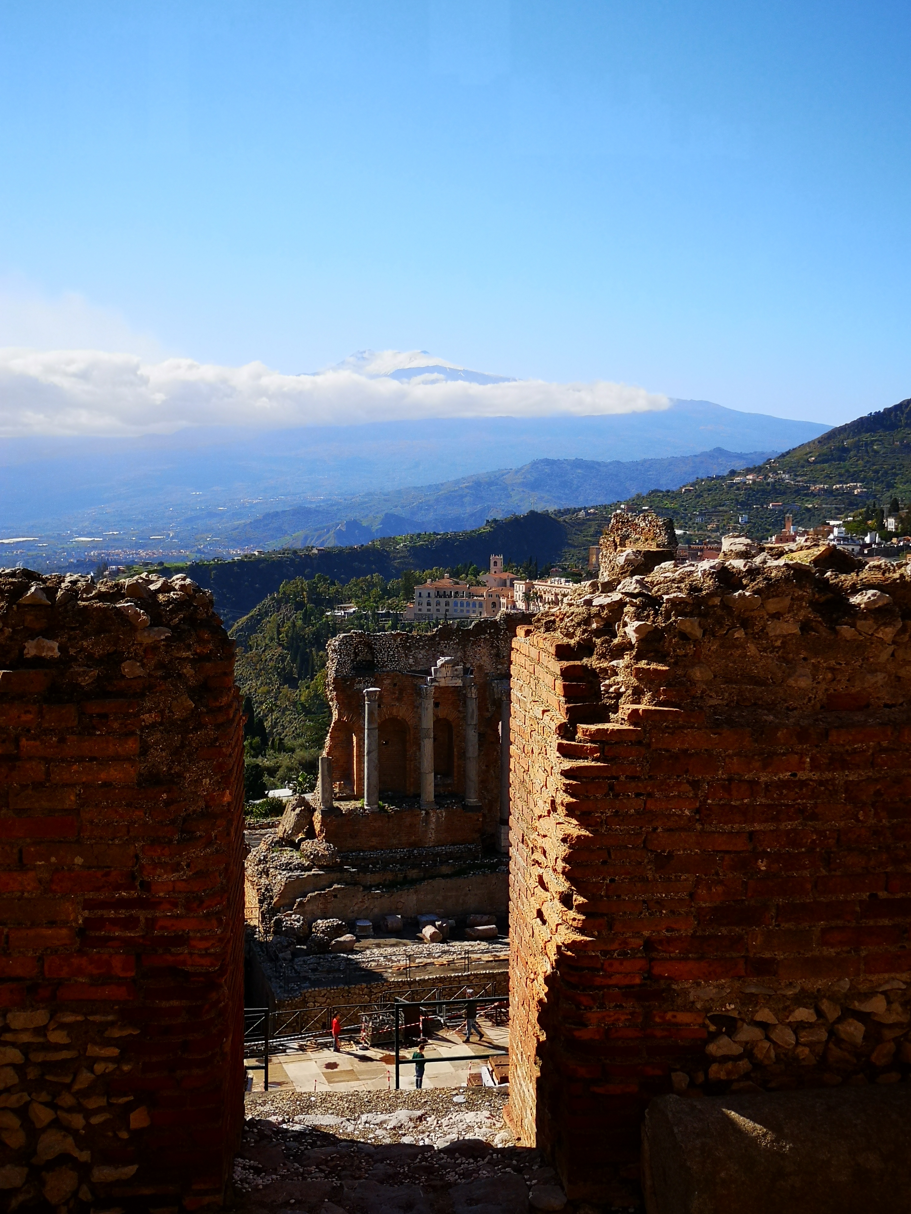 Im sonnenverwöhnten Taormina verbrachte ich meinen ersten Tag und genoss den Blick auf den Ätna von allen möglichen Plätzen. Unglaublich, da steht ein tatsächlich noch aktiver Vulkan, der erst letzte Woche ausgebrochen war. Im Sommer gab es sogar ca 30 Eruptionen. Davon zeugen die Ascheberge in den Straßen entlang der Küste. Was für eine gebeutelte Region: Vulkanausbrüche, Brände im Sommer und der Hurrikan letzte Woche.