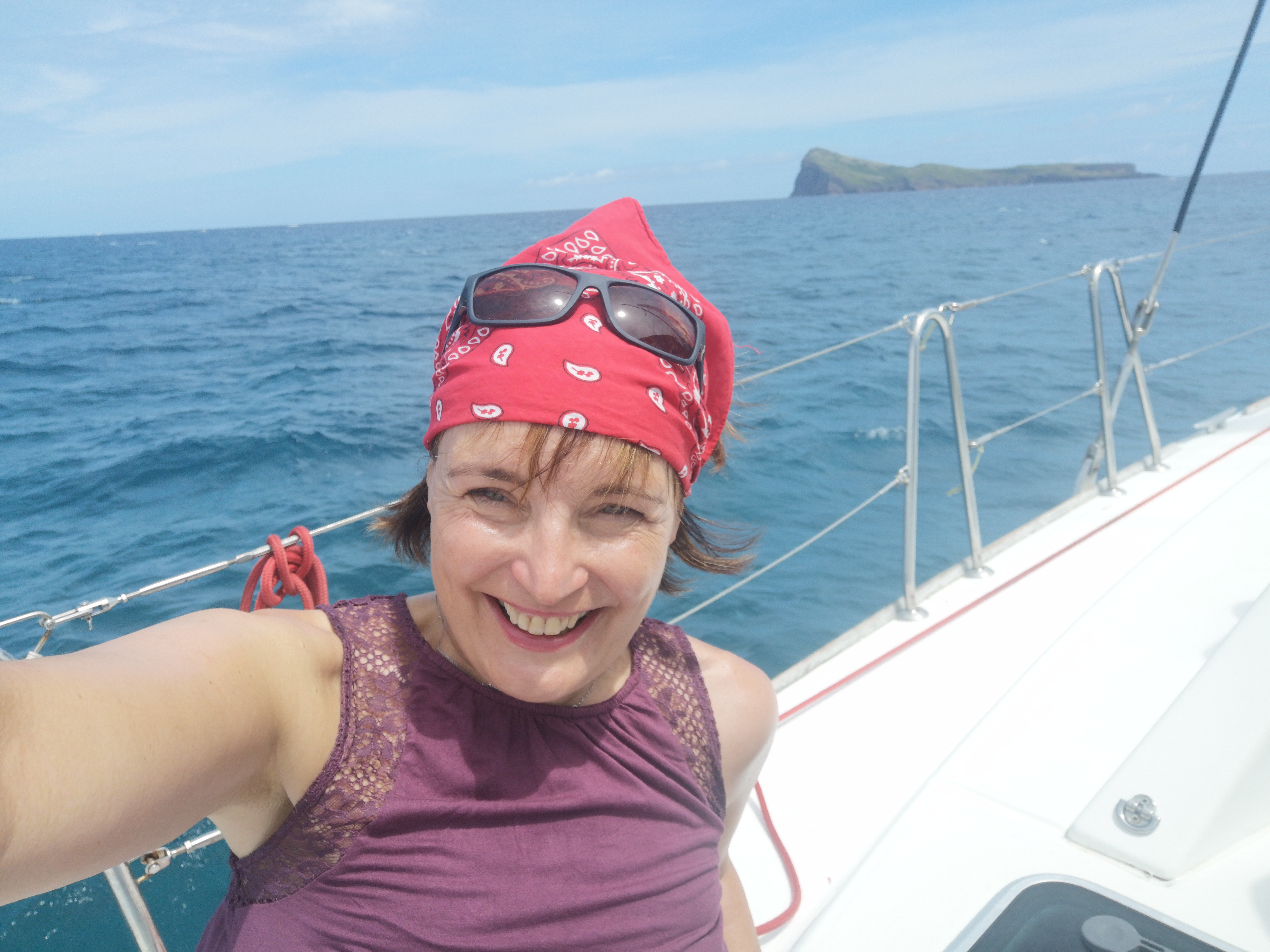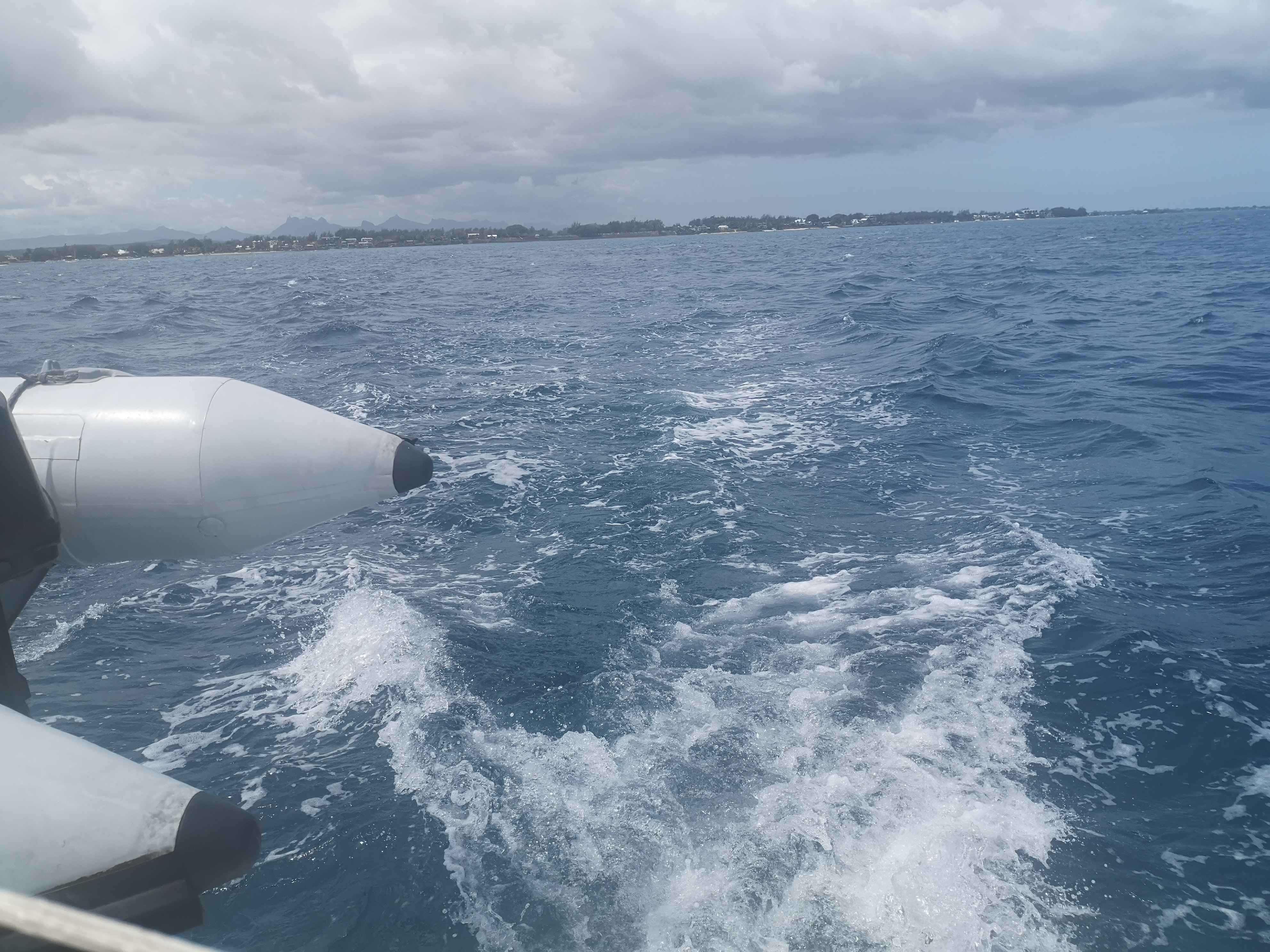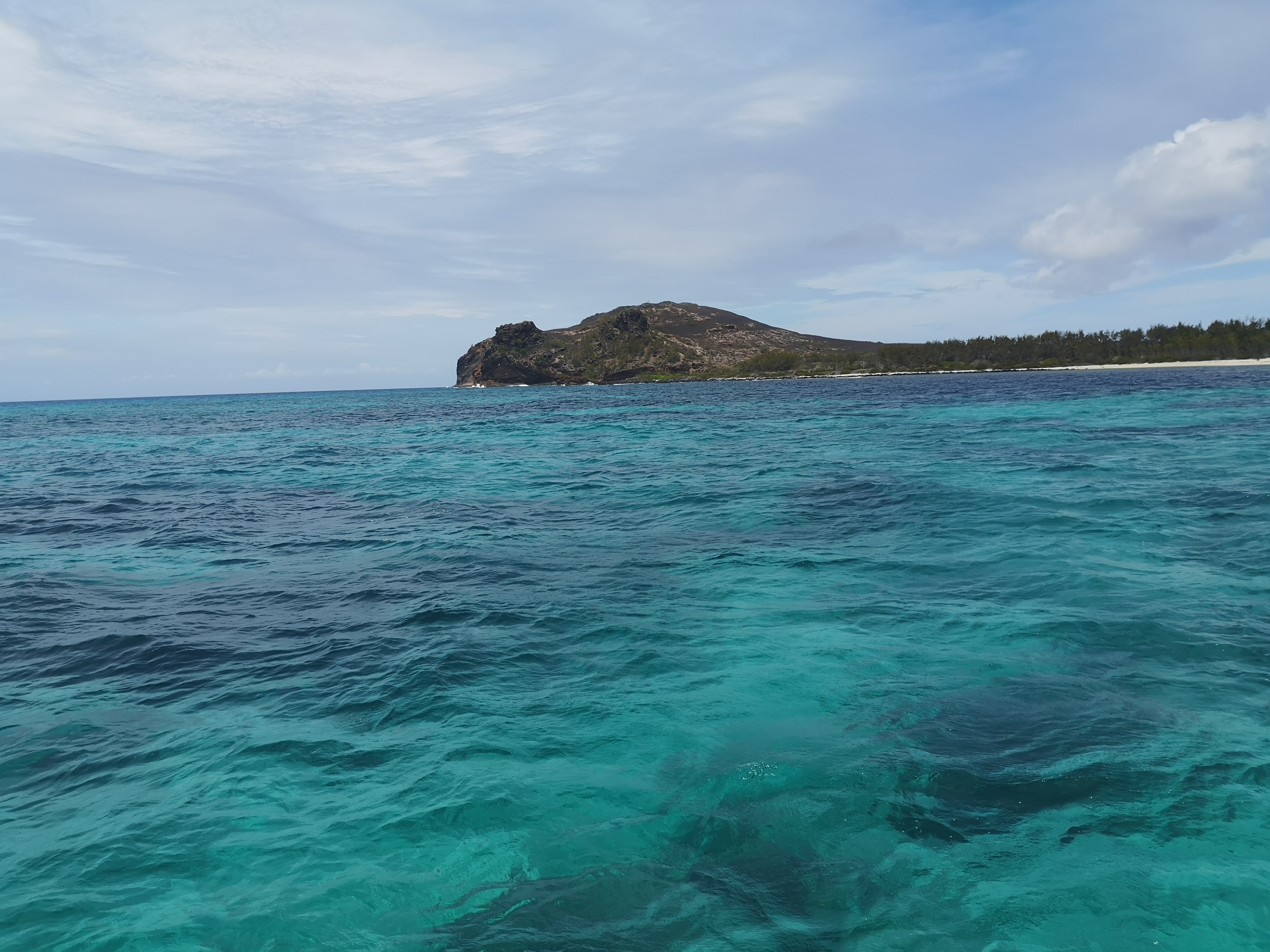 Los ging es in Pereybère am Strand Bain Boeuf, dort wo mich der Strandverkäufer ansprach. Und er erkannte mich sogar wieder, mit Namen. Auf unserem Cruise waren wir zu sechst: eine Mauritierin mit ihrer Nichte aus London, ein Paar aus der Schweiz / Litauen und wir. Also ideal in COVID Zeiten. Wir wurden mit einer Art Selbstbaufloß- Fähre zum Katamaran gebracht und dort vom Skipper und Entertainer begrüßt. Und auf ging es 1 1/2 h bis zu den Inseln Gabriel und Flat island. Es war etwas windig, Wellen recht hoch und der Katamaran schaukelte so, dass man nicht in den vorderen Netzen sitzen konnte. Die wurden nur freigegeben, wenn wir vor Anker gingen. Die Fahrt selbst war ein Genuss: frische Meeresbrise, azurblaues Meer, ein bisschen bedeckt. Segamusik im Hintergrund. Wir versuchten, an der Seite des Bootes zu sitzen, was nicht ganz so gefährlich war, wie vorn in den Netzen. Trotz des Wellenganges wurde uns auch nicht schlecht.
