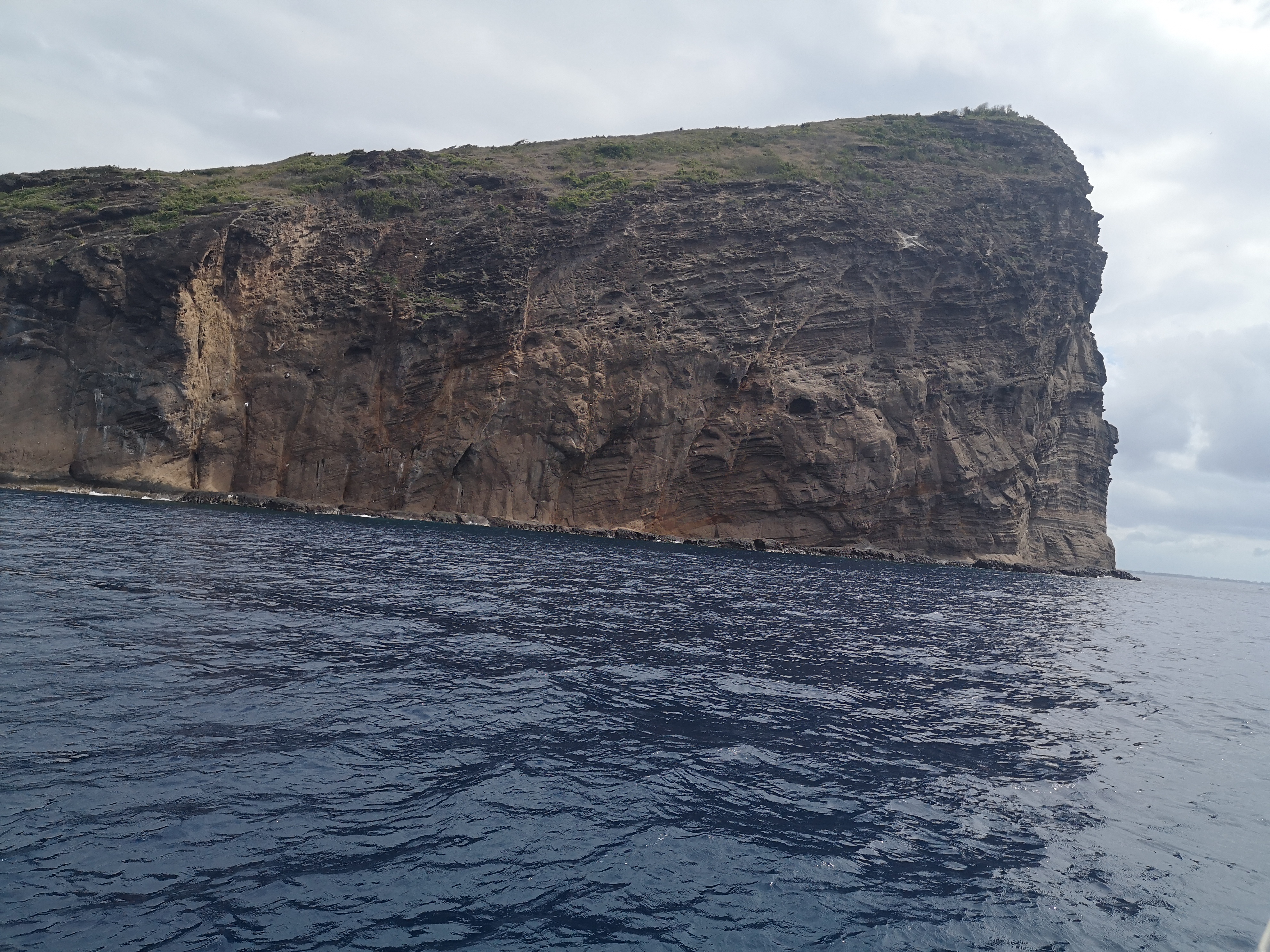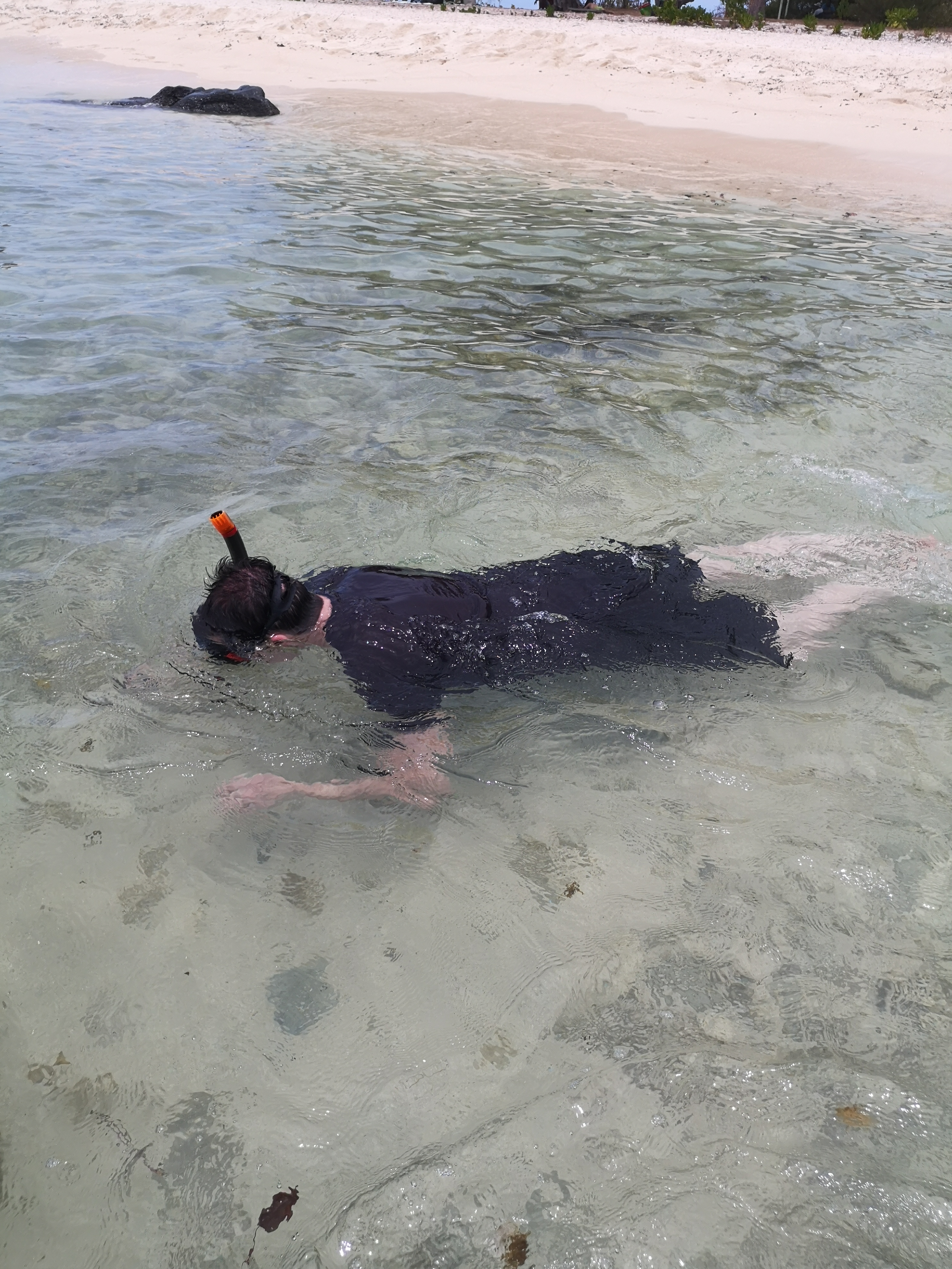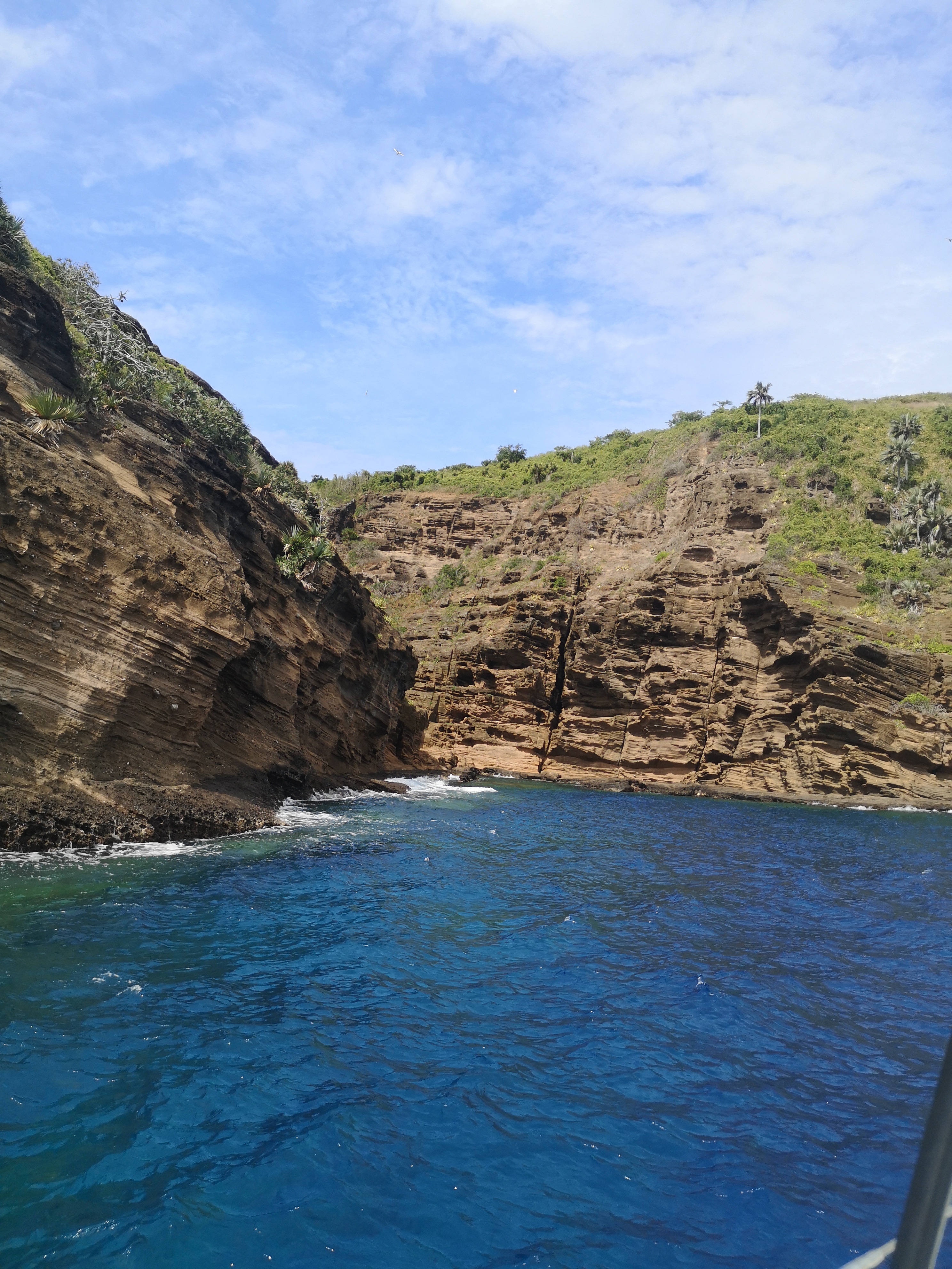 We went on to the next snorkelling round at Coin de Mire, along the rock island to a quiet spot where it was easy to dive into the water. These birds were nesting on the rock face and the formation of the rocks was again very impressive and imagination inspiring. The colours of the water made it tempting to jump in. The Mauritian woman put on some kind of neoprene. She thought it was too cold. How!? Just right, wonderfully refreshing. I even got goosebumps, but not because of the cold. A wonderful underwater world revealed itself to us. Schools of fish, colourful, patterned, small and large. I even saw two conger eels. As we were diving close to the rock, we had to be very careful not to be thrown against it by the waves.