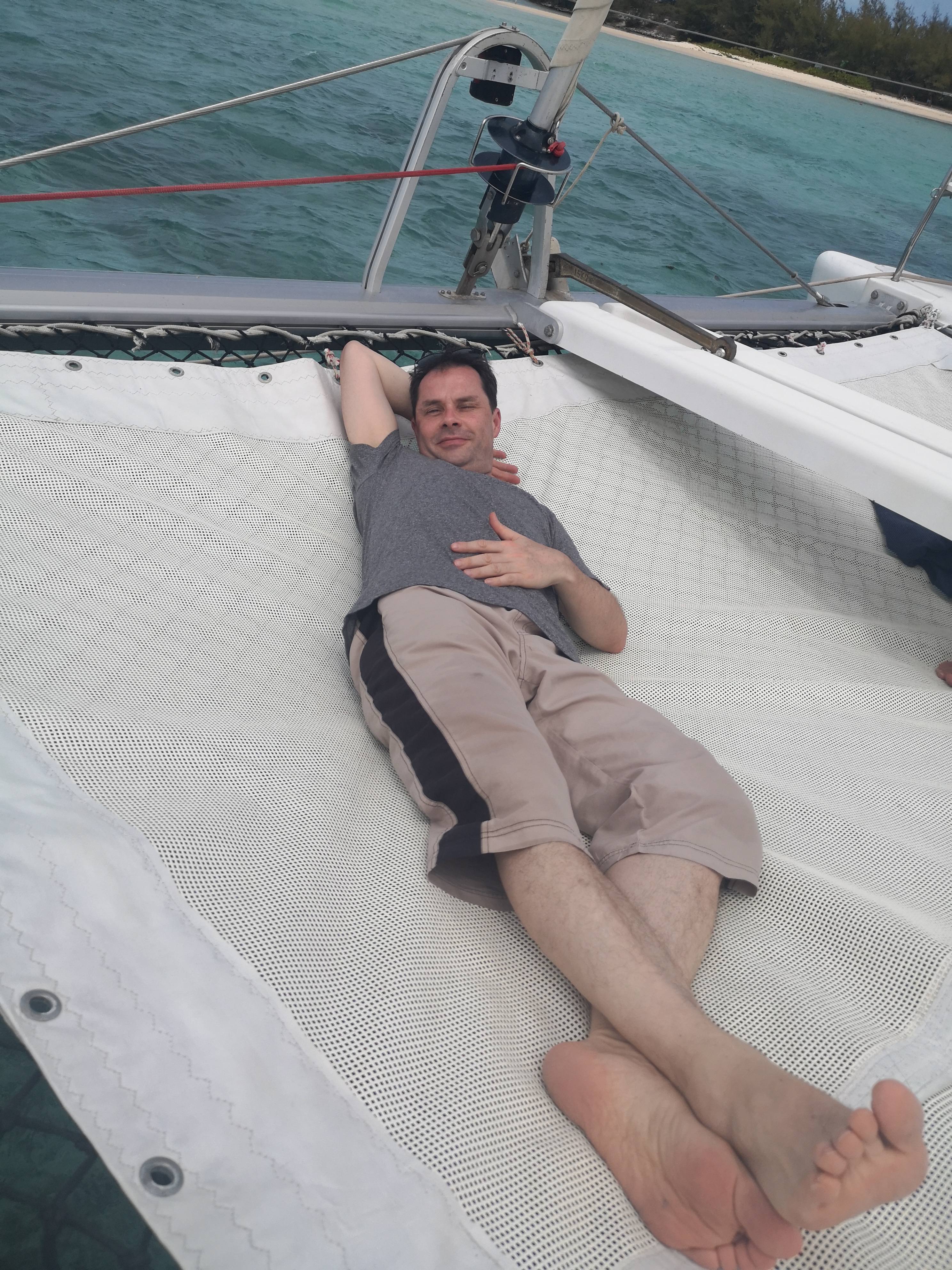 In the meantime, the crew prepared our lunch: Chicken, fish, salads, rice, vegetables. It was very delicious and we just enjoyed to much of it. Tired with full bellies, we could finally hang in the nets.