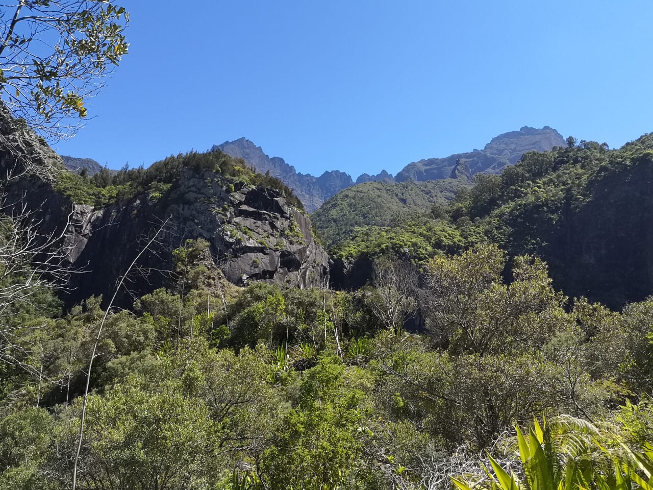 In Cilaos angekommen hätte ich eigentlich schon wieder umdrehen können. Es ist einfach so unglaublich! Und es sollte noch unglaublicher werden. Vielleicht kann man verstehen, wenn ich jetzt sage: Ich kann nicht mehr! Nachdem wir uns mit Frühstück und Mittagspicknick in der Boulangerie versorgten, begann die Tour zur Chapelle. Das erste Stück ging nur bergab, erst glatte langweilige Straße und dann einen steinigen Pfad. Renaud erklärte die Entstehung der Cirques, Botanik und Geologie. Es rauschte in meinem Kopf. Alles war so schnell. Die ganzen Begriffe, die ich nicht ins Deutsche übersetzen konnte. Gibt es dafür überhaupt eine Übersetzung? Das ist doch alles so exotisch und findet man in Mitteleuropa eh nicht. Wir liefen durch einen Wald entlang eines Baches unter Filaobäumen, Palmen und anderen exotischen Pflanzen, die zum größten Teil alle endemisch sind. Thomas pflückte ein paar Früchte von einem Baum. Wenn ich mich recht erinnere, hießen die Giambase oder so. Ich habe die noch nie gesehen. Patricia und ich waren etwas skeptisch. Doch, könnt ihr essen. Tatsächlich, so lecker und nicht vergiftet. Sind wir etwa im Garten Eden? Langsam kommt es mir so vor, dass die ganze Insel aus der Bibel abgekupfert wurde.