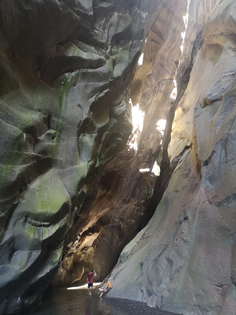 My head was still buzzing. I didn’t even notice that we had to go up to the Chapelle. Suddenly we were at the top and the shoes should be changed. We must cross the stream, about four times at least. What should I do now? Can’t I leave my hiking shoes on? No, we must cross the stream not only ankle deep. I put on my bathing shoes, skeptical. I was afraid of slipping with them. We also had to climb over huge boulders. In those kicks? My ankle?! I kept the bandage on. It can get wet. And off we went through the river. Shortly before the goal the backpacks were hidden behind a rock and then it got wet up to the butt. Oh just good that we are only two and everyone could take the help of the two. And in principle, the climbing was also fun. We were rewarded with: LA CHAPELLE – a huge grotto in which a waterfall rushed. We went up to it. Actually, we should have taken bathing suits. But that would have become too much perhaps. We ‚romped‘ ourselves also in such a way. Or so: I just stood there again with my mouth wide open.
