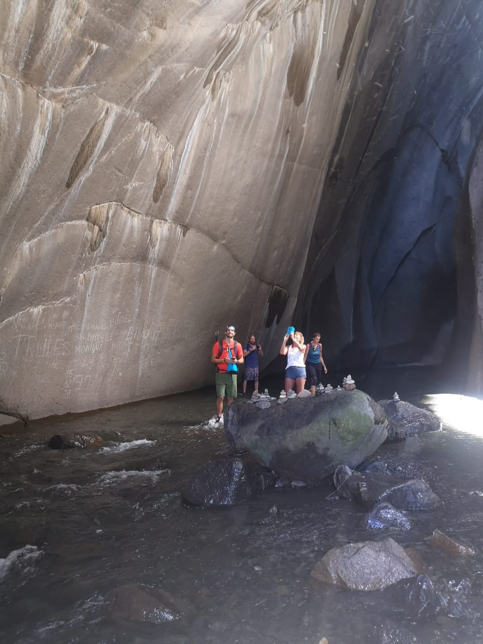 In meinem Kopf rauschte es noch immer. Ich merkte gar nicht, dass wir zur Chapelle hinauf mussten. Plötzlich waren wir oben und die Schuhe sollten gewechselt werden. Es geht durch den Bach, ca vier Mal. Was soll ich jetzt machen? Kann ich meine Wanderschuhe nicht anlassen? Nein, es geht durch Wasser nicht nur knöcheltief. Ich zog meine Badeschuhe an, skeptisch. Ich hatte Angst, damit auszurutschen. Wir mussten auch über riesige Felsbrocken klettern. In diesen Tretern? Mein Knöchel?! Ich behielt die Bandage um. Die kann ja nass werden. Und auf gings durch den Fluss. Kurz vor dem Ziel wurden die Rucksäcke hinter einem Felsen versteckt und dann wurde es bis zum Popo nass. Ach bloß gut, dass wir nur zu zweit sind und jeder die Hilfe der beiden in Anspruch nehmen konnten. Und im Prinzip hat die Kletterei auch Spaß gemacht. Belohnt wurden wir mit: LA CHAPELLE – eine riesige Grotte in der ein Wasserfall rauschte. Wir gingen bis ran. Eigentlich hätte man Badesachen mitnehmen sollen. Aber das wäre dann vielleicht doch zu viel geworden. Wir ‚tobten‘ uns auch so aus. Oder so: ich stand einfach nur wieder da mit offenem Mund.