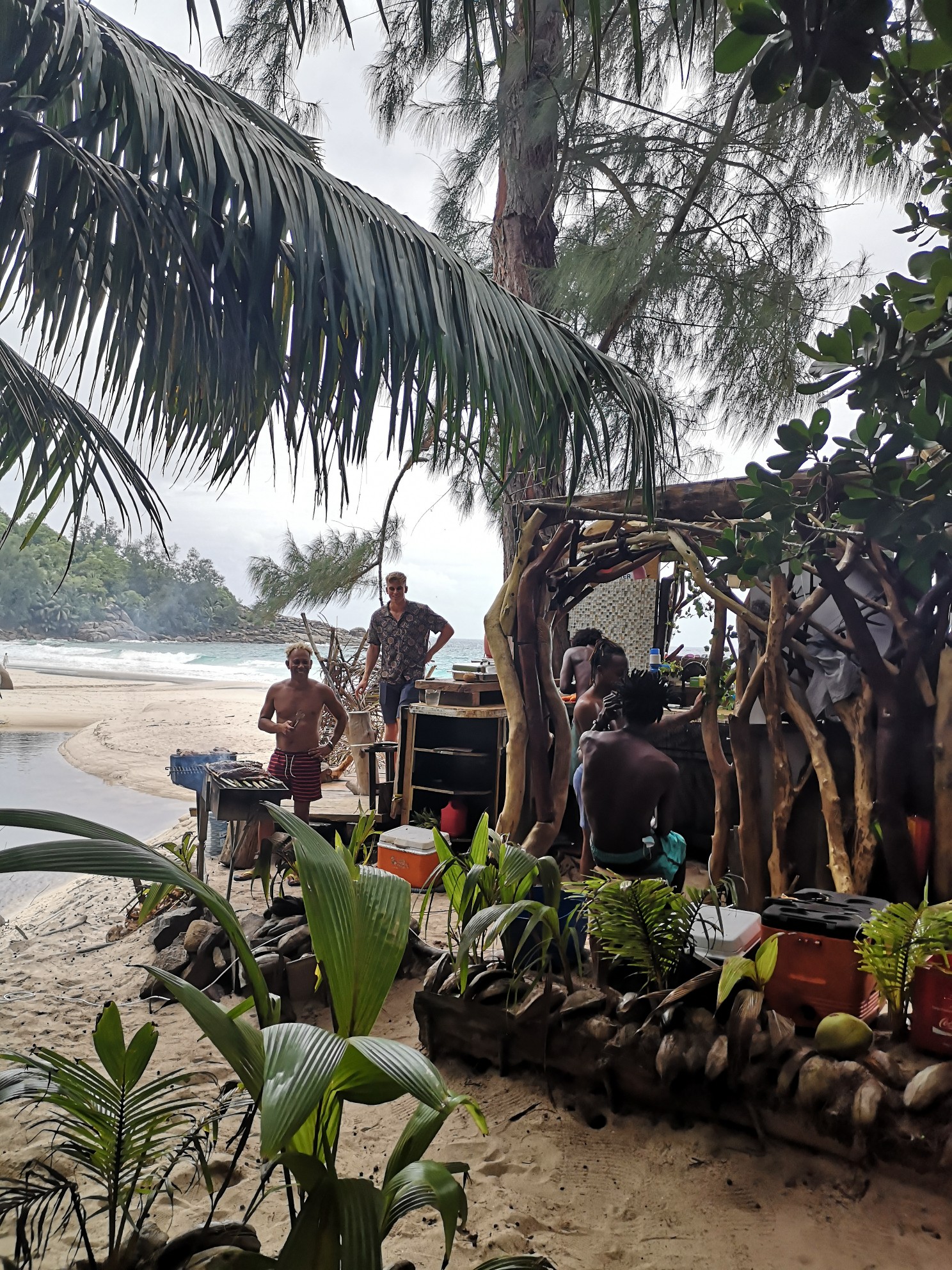 Bevor ich hier jeden einzelnen Strand beschreibe und euch damit langweile, werde ich mich vor allem auf die zwischenmenschlichen Erlebnisse konzentrieren, die mir in dieser Woche widerfahren sind. Ich bin sehr froh, dass mich Lise, meine Vermieterin, mit Ana bekannt gemacht hat. Ana aus Italien / Bulgarien ist auch so eine Alleinreisende und kennt sich sehr gut auf den Seychellen aus. Sie braucht kein Navi, sie weiß, wo welcher Strand ist. Man braucht ihr nur hinterher fahren und ist dort, wo man hin will. Sie zeigte mir Anse Incendente – das Paradies, dort wo geheiratet wird. Mit ziemlich starken und hohen Wellen und einer Strömung nicht gerade von schlechten Eltern findet man dort vor allem Ruhe. Es ist so weit und menschenleer. Vielleicht gibt es ein paar Honeymooner. Beeindruckt hat mich dort eine kleine Strandbar, die von drei einheimischen Brüdern geschmissen wird. Vor ein paar Jahren haben sie dort die Flagge der Seychellen aufgestellt und das Gebiet als ihr Strandbar-Territorium deklariert. Sie grillen für die Strandbesucher Fisch, Hühnchen, Würstchen. Es gibt einige Cocktails und alles schön arrangiert mit Hammocks zum Chillen und kleinen Tischchen und Hockern. Der Fisch wird im Teich direkt daneben geangelt. Dazu läuft karibische Musik, Reggae. Man ist in einer anderen Welt.