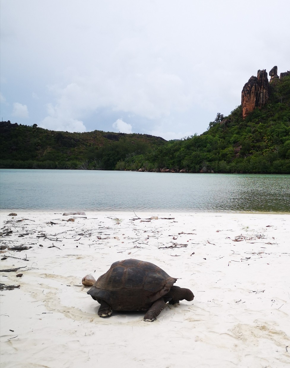 On the 3rd day I took a water taxi to Curieuse, the turtle island. And for a short time I had company from Mika from Germany. A young woman who was also travelling alone. We explored this island together. We were let out at the turtle hotspot. The big, adult ones moved freely on the island. But only at this one spot. Smaller ones and babies are in enclosures, protected from tourists.