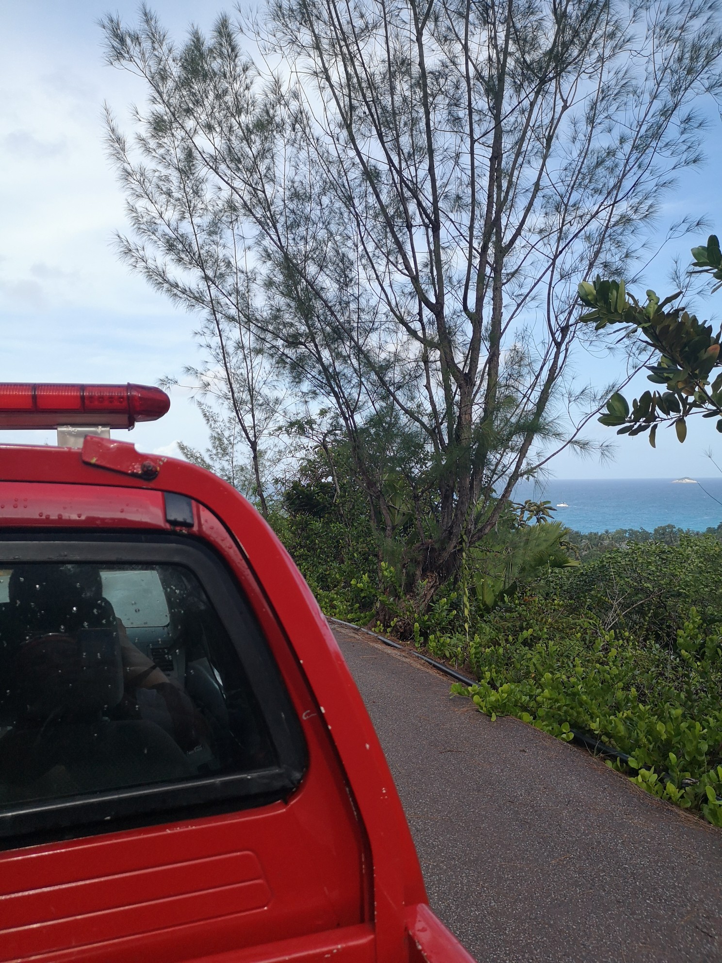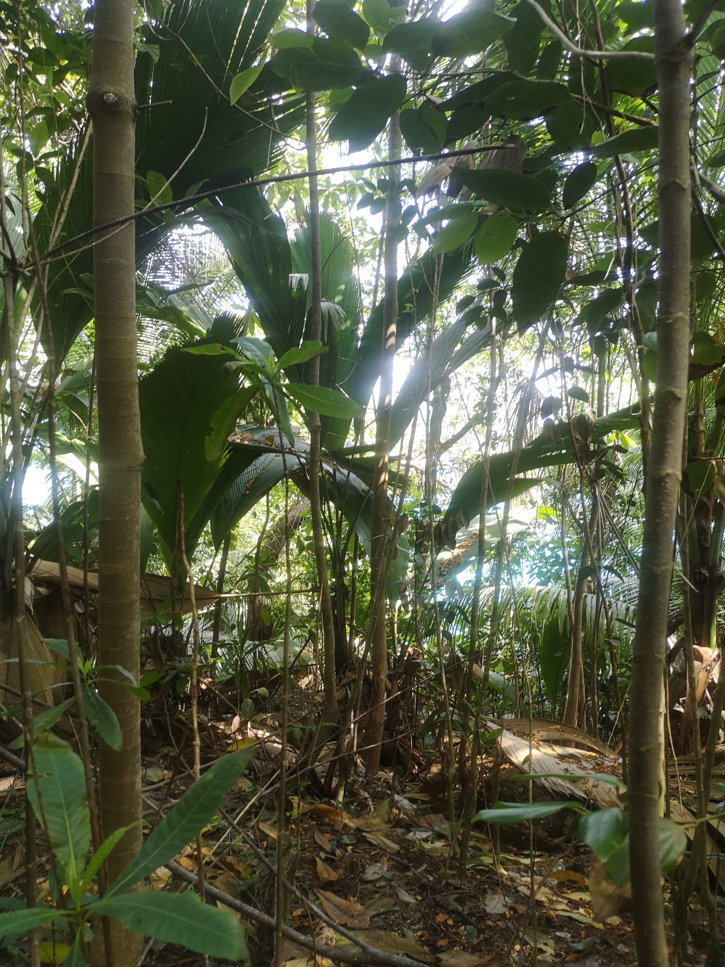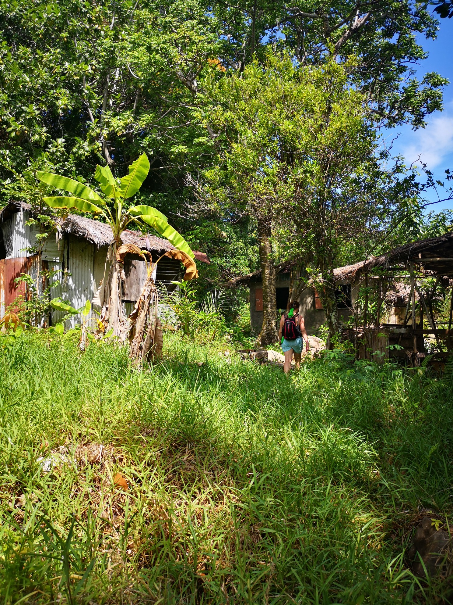 The beach at Grand Anse was just as empty as all the beaches. Where are all the tourists? In their hotels? The sun was getting quite aggressive. We looked for a bus stop and waited for the bus to the other coast. It went via Vallée de Mai, a national park in the middle of the island where you can see the famous Seychelles palm tree. The ride with the rumble bus through this park was already enough to get an impression. I already felt like I was on a safari. And since Mika warned me about the rip-off (300 SR entrance fee for not much), I will take the bus through this area again if necessary.