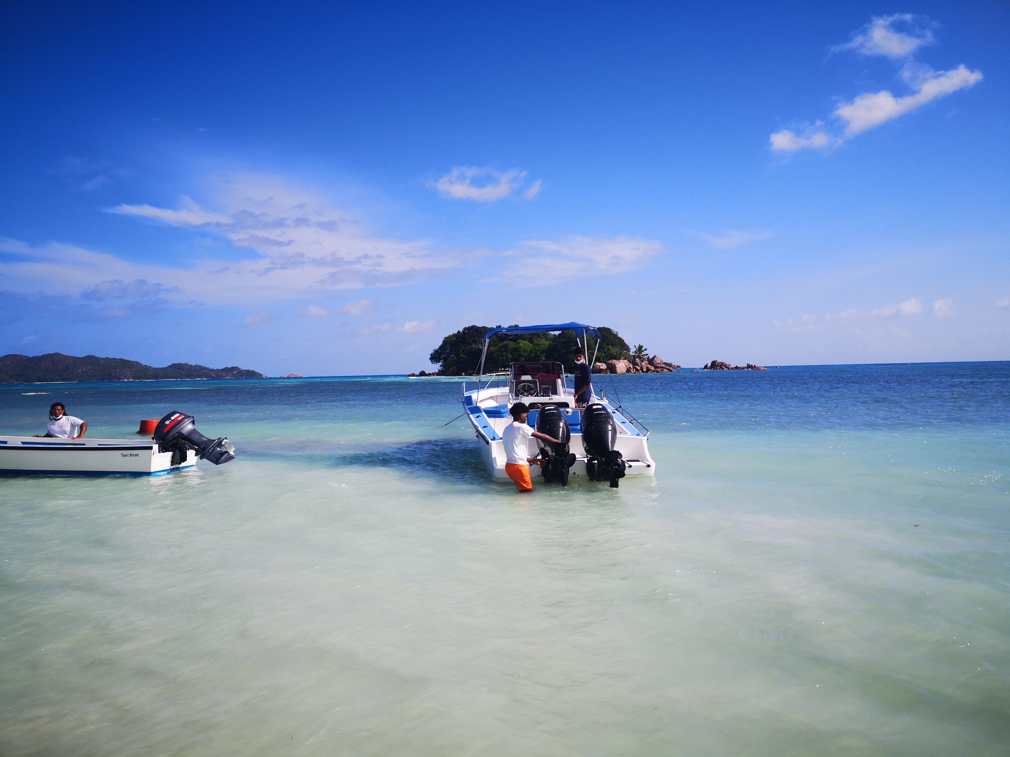 Coco Island buchte ich mit der Organisation Sagittarius, die hier vor Ort ein kleines Open-air Büro am Strand haben und diverse kleine Bootsausflüge organisieren. Ich war über Sagittarius bereits auf Curieuse. Auf Coco und Co musste ich mich etwas gedulden. Das Wetter war sehr windig, das Meer sehr unruhig. Und für eine Tour benötigt man auch ein paar Leute, damit sich das überhaupt lohnt. Ich hatte Glück, am Samstag war es noch recht windig, aber die Sonne schien und es gesellte sich noch ein französisches Pärchen hinzu. Nichts gegen Franzosen, aber mit ihnen brauche ich immer etwas länger, um warm zu werden. Doch mit Sandrine verstand ich mich sofort, wir beide im gleichen Alter und gleicher Berufserfahrung. Ihr Mann, dessen Namen ich leider nicht behalten habe, war der Fotograf an Bord und erinnerte mich in seiner Sorgfältigkeit sehr an meinen Alexander. Unser Skipper José sprach auch Deutsch. Er hat mehrere Jahre in Deutschland gelebt und hatte solche Sehnsucht nach seinen Fischen. Außerdem wollte seine Frau ‚frei‘ sein, was auch immer das bedeutet. Ich spürte schon, dass das wieder ein kleines Abenteuer wird.