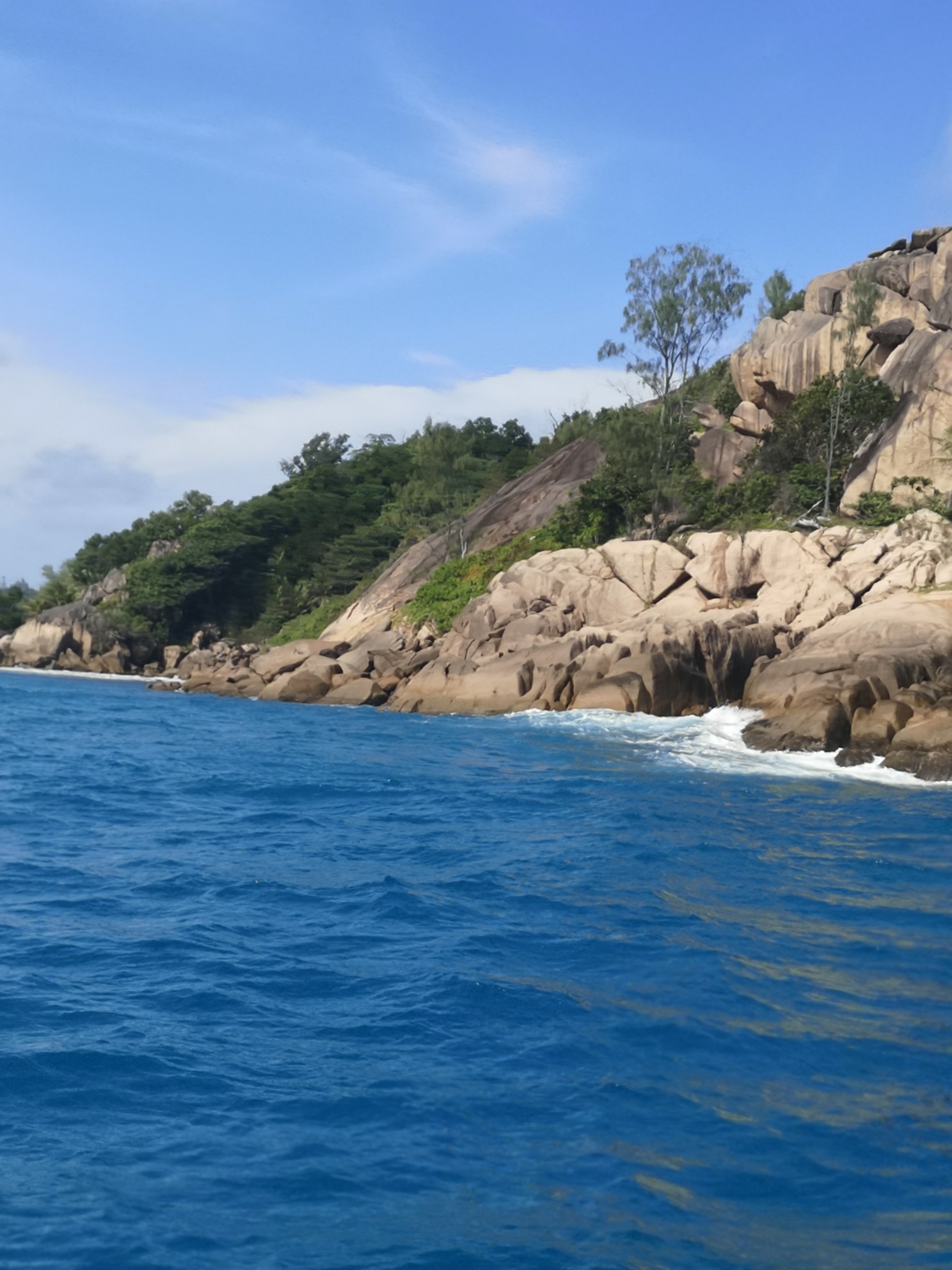Next snorkelling stop: Coco Island. On the way there, we passed bizarre rock formations. What nature can do! I ask myself: How is that possible? So this really exists. It’s not just in the advertising catalogue. The French couple noticed my humility, shaking my head at it all. More moments like that, I start to cry. They told me where it was supposed to be even more beautiful. I should go there and there first. Stop!!!! I have to let this go sometime. I only have two weeks left. Coco Island is a nature reserve, which means we had to pay extra tax again. The rangers collected from the boat. José let us out at one tip of the island. I was a bit afraid of the thick boulders and the rather high waves. We made out a sign and I looked up with my head from time to time so that I wouldn’t lose my way. Especially at the rocks there was so much to see. We snorkelled to the shore of the island, which is really very small and one can take a short breather, climb onto a rock and swim on again. I let the waves wash me ashore, like Robinson. Sandrine tried to help me out. The wave was faster. A tree was full of flying bats. A bit scary. We moved on. José had already steered the boat to the other side of the island. And he sent us to another interesting spot. A trench full of underwater life. I must have snorkelled along it ten times. Looking for … ? A turtle perhaps? But it’s time to call it a day. If I was right, I saw a small shark in front of Félicité.