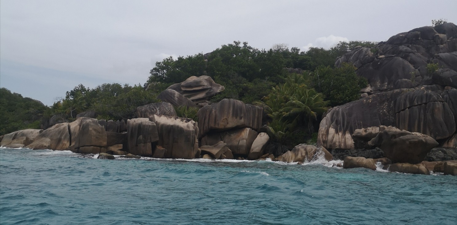 Nächste Schnorchelhaltestelle: Coco-Island. Auf dem Weg dorthin ging es an bizarre Felsenformationen vorbei. Was die Natur doch alles zustande bringt! Ich frage mich: Wie geht das? Das gibt es also wirklich. Das ist nicht nur so im Werbekatalog. Das französische Pärchen bemerkte meine Demut, mein Kopfschütteln über das alles. Noch weitere solche Momente, ich fange an zu heulen. Sie erzählten mir, wo es noch viel schöner sein soll. Ich sollte doch erstmal dorthin und dahin fahren. Aufhören!!!! Ich muss das irgendwann loslassen. Ich habe nur noch zwei Wochen. Coco Island ist ein Naturschutzgebiet, was so viel heißt, dass wir noch einmal Extra Tax bezahlen mussten. Die Ranger kassierten vom Boot aus ab. José ließ uns an der einen Spitze der Insel raus. Ich hatte ein bisschen Angst vor den dicken Felsbrocken und den doch recht hohen Wellen. Wir machten ein Zeichen aus, und ich schaute mit dem Kopf öfter mal hoch, so dass ich nicht den Weg verliere. Gerade an den Felsen gab es so viel zu sehen. Wir schnorchelten bis zum Ufer der Insel, die wirklich sehr klein ist und man mal kurz verschnauft, auf einen Felsen klettert und wieder weiter schwimmt. Ich ließ mich von den Wellen ans Land spülen, wie Robinson. Sandrine wollte mir raushelfen. Die Welle war schneller. Ein Baum war voller Flughunde. Ein bisschen gruselig. Wir zogen weiter. José hatte das Boot schon zur anderen Seite der Insel gesteuert. Und er schickte uns noch an eine andere interessante Stelle. Ein Graben voller Unterwasserleben. Ich bin diesen bestimmt zehnmal entlang geschnorchelt. Auf der Suche nach … ? Einer Schildkröte vielleicht? Aber nun muss auch mal gut sein. Wenn ich richtig lag, habe ich vor Félicité einen kleinen Hai gesehen.