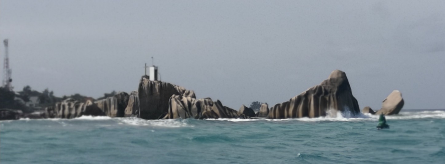 We first went over to La Digue to drop off a couple who wanted to do a day trip there. In the lee of the Praslin coast, I enjoyed the scenery from the seaside before heading out to sea over high waves. It was splashing. Our first snorkelling round took place at the island of Félicité. The water was blue. Pure and always along the reef. I had a few problems finding my way around at first. It was all blue around me. José helped me to find the ‚right snorkelling path‘. And then I was in the middle of the aquarium for the first time: zebra fish, field weaver fish, surgeon fish in all variations – blue stripes, white throats, white lips, perches, anemone fish, parrot fish… In all colours: yellow, blue, green, purple, orange…. Under water I have to shut up, otherwise I swallow water and I did that already enough by the high waves sloshing into the snorkel.