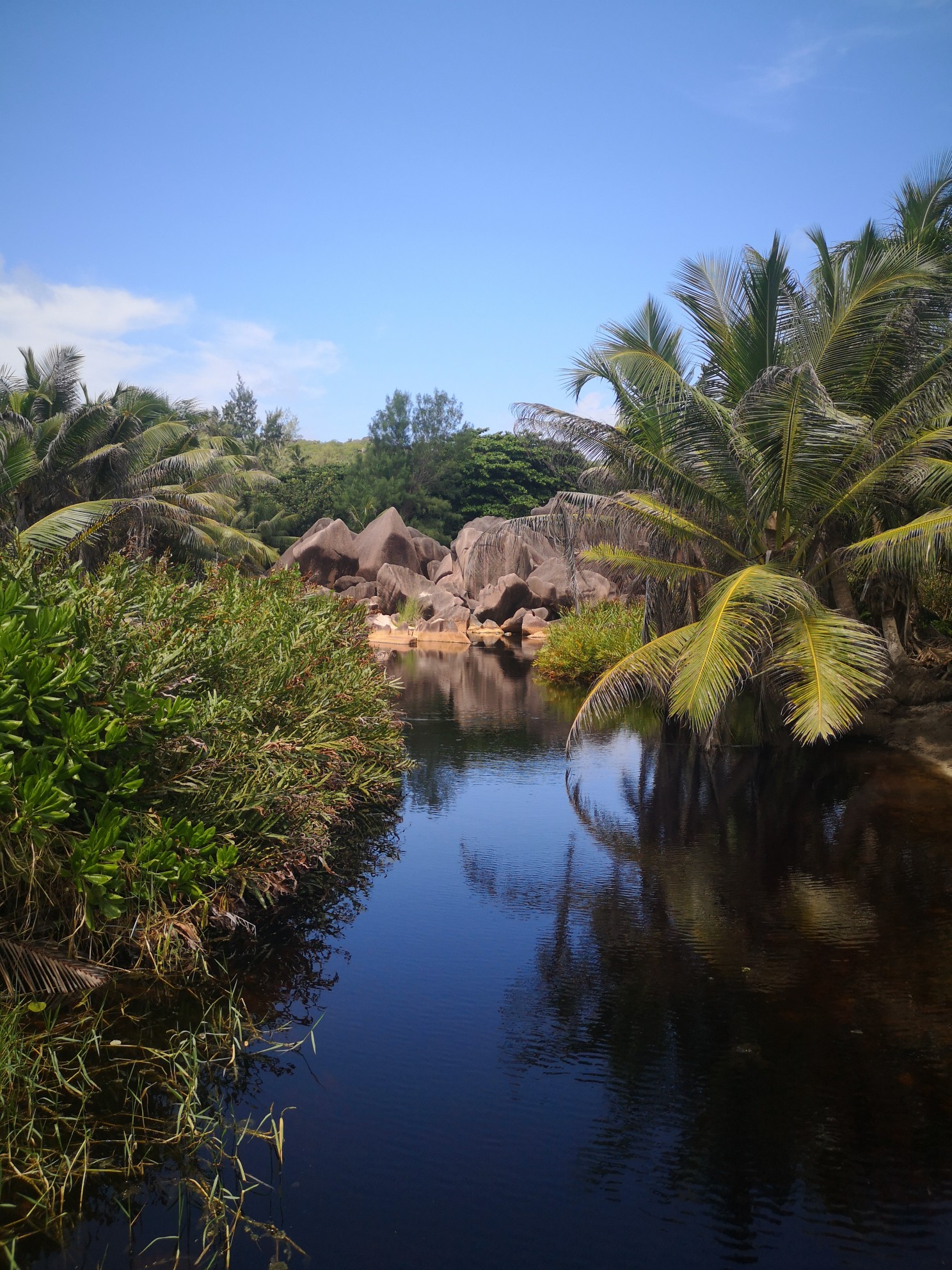 This is as far as I wanted to go. This is just as beautiful as Anse Source d’Argent. Also a wide beach, but with more shady spots. Since I was already a bit exhausted from all the exertion and my knees were shaking a bit, I stayed sitting under a palm tree, lying down. It was filling up and by now you could compare the beach with Baltic Sea beaches in high summer. I enjoyed the view of the diverse rock formations, the green of the jungle, the bright azure of the sea. I didn’t have all that much longer. I was a bit annoyed that I didn’t take snorkelling gear. So I’ll have to come again, better equipped in trainers and with a backpack. I tried to make a little progress along the edge through the pools. The water was crystal clear and you could see lots of colourful fish. And also a small shark. Whoo! I was hooked. I have to come again. On Friday! Kayaking tomorrow, jungle trekking on Thursday.d
