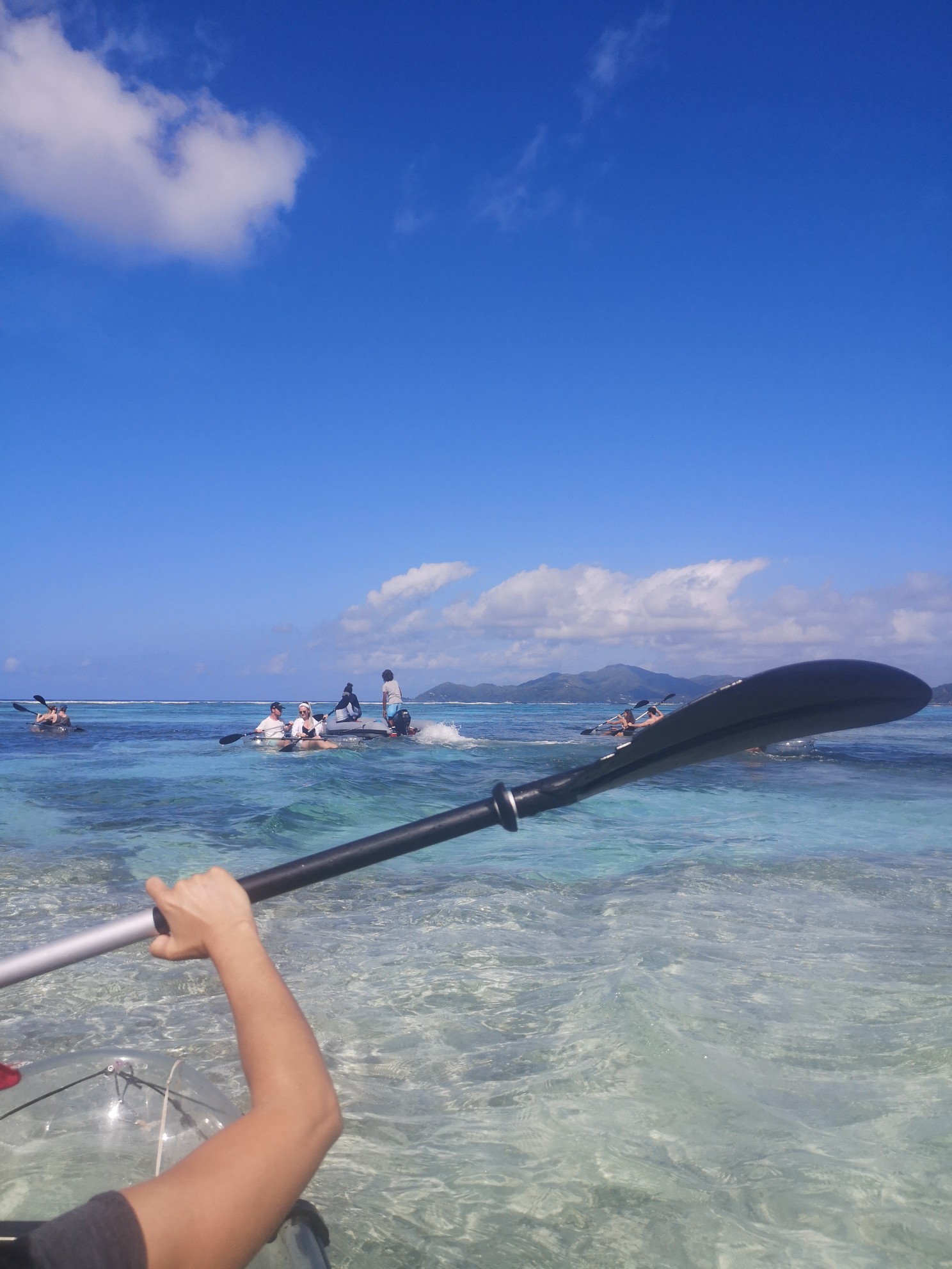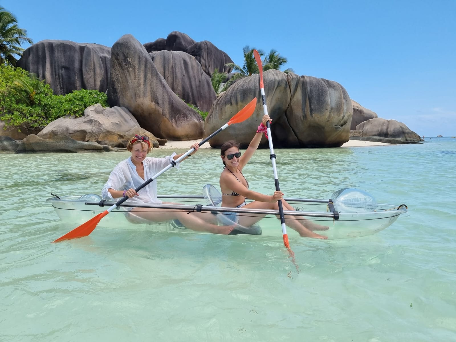 The Crystalwater Kayaks team (Anis – the owner, Jude, Leo – the captain, and Karl – the coconut champion) was already busy organising and preparing for the tour. The crystal clear kayaks were ready to go and the participants from all countries arrived. Team Germany was represented by Vivienne and me. Other teams came from USA, Sweden, Romania, Poland, Slovenia, Ukraine (!!!!), Portugal. About 10 kayaks started. Our guide was Jude, an entertainer in the true sense of the word. He showed us the ropes in a funny and relaxed way and his team helped us into the boats. They themselves accompanied us in an inflatable boat and pointed us in the right direction. First out into the lagoon and then along the beach Anse Source d’Argent, with the whole beach in view. What a view! Now all the rock formations really come into view and you can also make out various figures: the shark, Kissing Rock, Coco de mer Rock and Elephant Rock. Jude jumped into the water and vividly described what was building up in front of us. And suddenly there was a giant turtle swimming between the boats. What a unique moment!