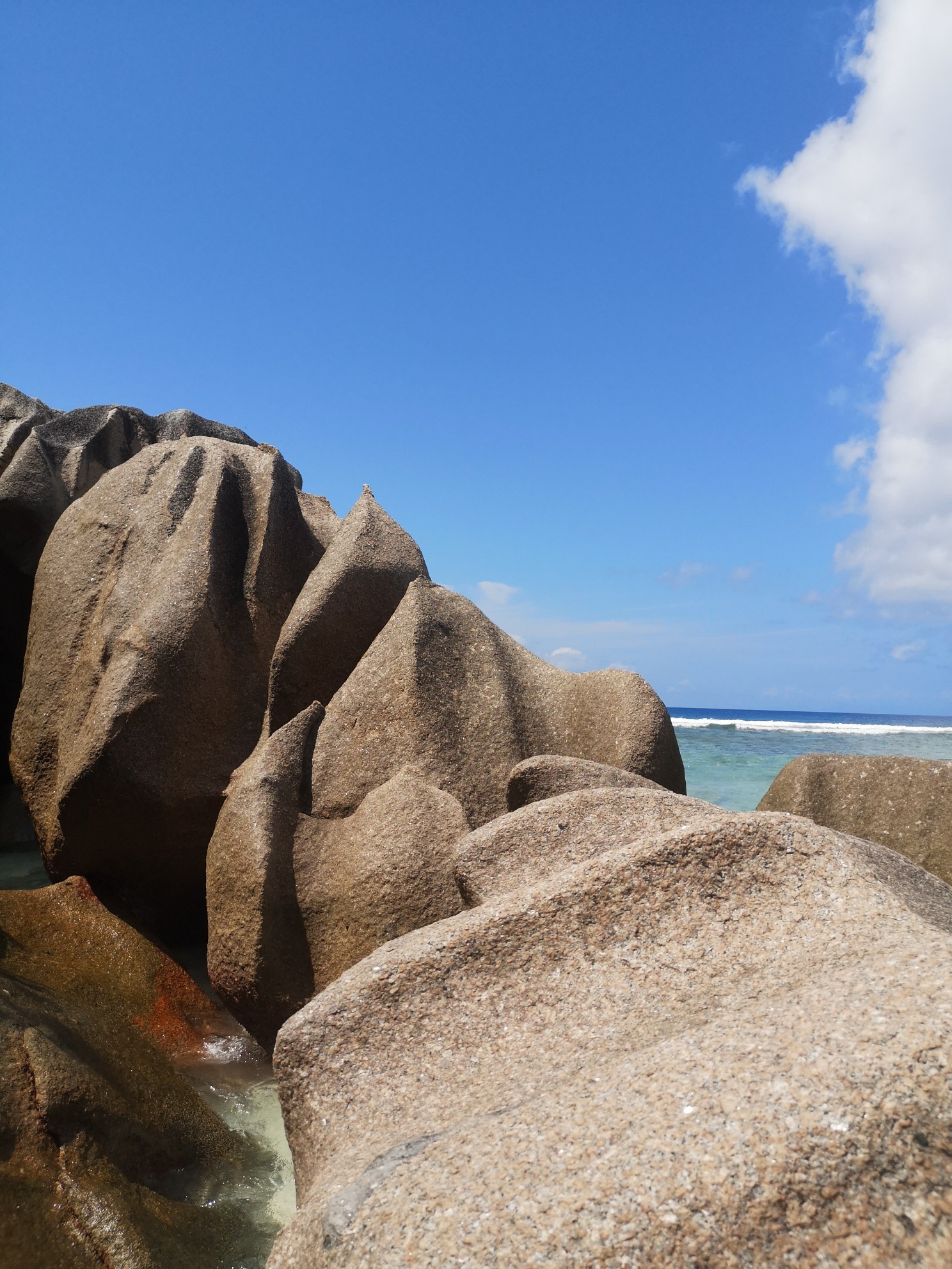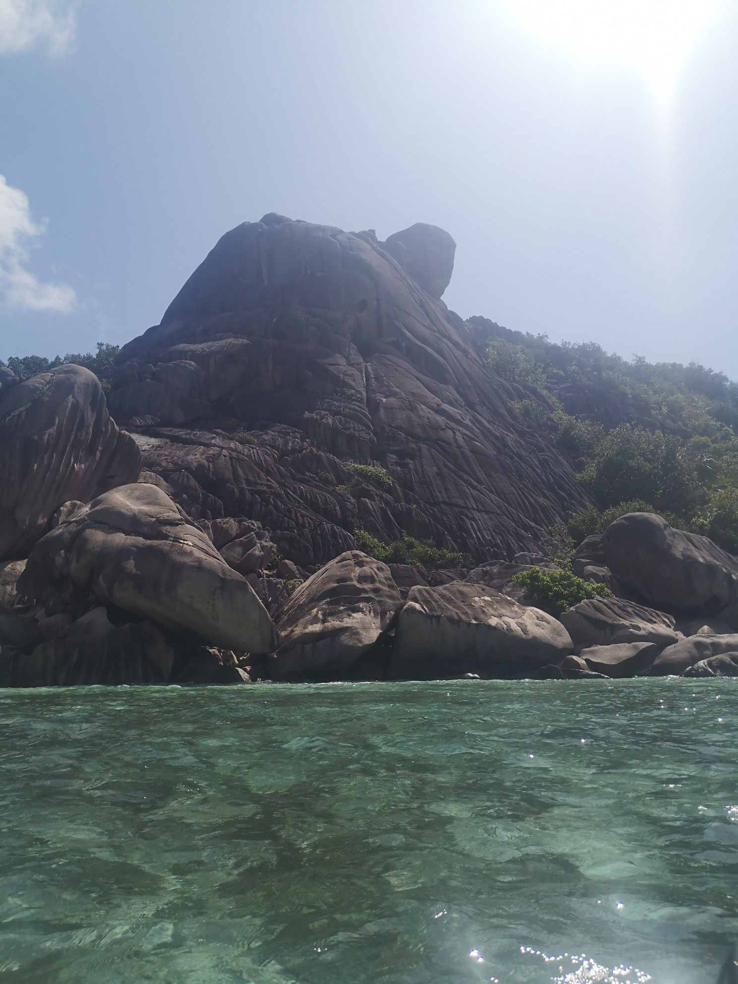 Der Bildungsteil begann. Es ging vor allem um die Korallen, die im El Ninhjo 2016 fast vollständig zerstört wurden. Jude zeigte uns einige Exemplare von solchen und machte darauf aufmerksam, alles dafür zu tun, den Klimawandel aufzuhalten. Eine Kayaktour mit eigener Muskelkraft statt eines Catamarans, der die Riffe zerstört ist schon mal ein Anfang. Es begann der Posing Teil für das Update der sozialen Medien: auf Stein, am Stein, im Stein… Und da das Wasser sich langsam zurückzog, wurde es Zeit, den Rückweg zur Kayakstation anzutreten. Es wurde zu gefährlich und da man nicht riskieren wollte, dass noch mehr Korallen draufgehen, wurden alle Boote in Schlepptau genommen und nach Hause gebracht. Vorsichtig fuhr man über noch ein paar intakte Korallen und erklärte uns diese. Da der Boden durchsichtig war – glassbottom kayaks – konnte man diese sehr gut sehen: Mushroom oder auch Brain Coral, Feuerkoralle und viele kleine Fische. Zum Abschluss gab es noch ein Foto im Kayak mit Anse Source d’Argent im Hintergrund, was Jude übernahm. Danke, Jude für dein Engagement und deinen Enthusiasmus, mit dem du uns durch diesen halben Tag gebracht hast. Ich hatte sehr viel Spaß und war richtig froh, dass du mir diese Tour vorgeschlagen hast.