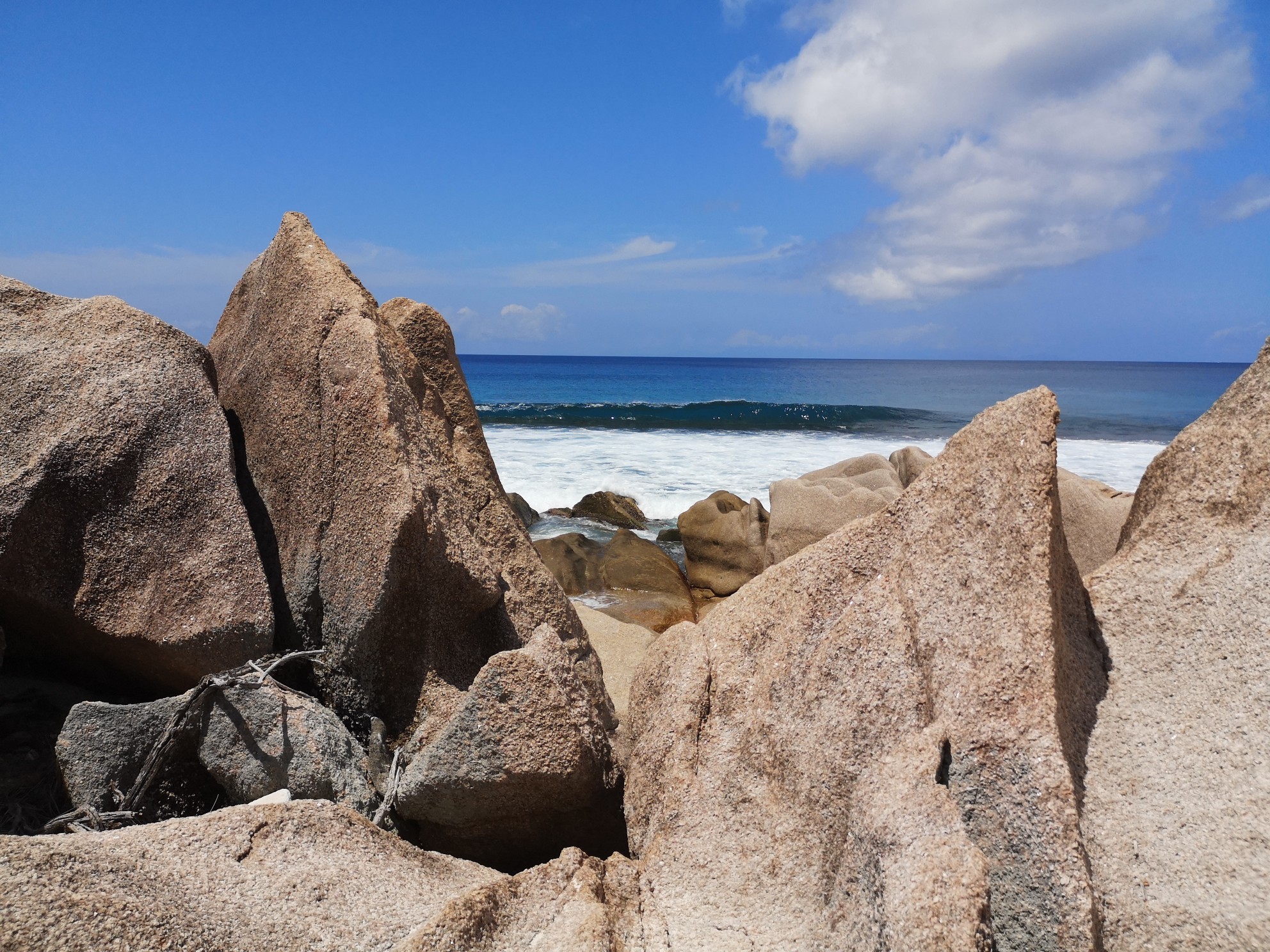 Und weiter ging es zum Anse Pierrot, oder auch Robinson Island. Dort soll 1988 der Film Robinson Crusoe entstanden sein. Der Strand sieht auch genauso aus und wir konnten uns an Land davon überzeugen. Jude ließ uns durch die ‚Filmkulissen‘ krabbeln: Höhlen, Dschungel, Pools. Ich kam mir wirklich vor wie im Film. Mal wieder. Und als es dann noch ans Survival Training ging: Wie öffne ich eine Kokosnuss? , kam ich mir wirklich vor wie Robinson. Die Teams mussten gegeneinander antreten und ein Mitglied versuchen, die Kokosnuss zu öffnen. Wir hatten einen Spaß mit einem älteren Herren aus Rumänien, der die Kokosnuss mit dem Kopf öffnen wollte. Für uns ging Vivi an den Start, da ich keine Kraft in den Händen habe und die auch sehr klein sind. Ich würde als Robinson ohne Freitag nicht überleben. Vivi schlug sich recht tapfer und sie bekam die Nuss auch geknackt. Es floß das Kokoswasser heraus.