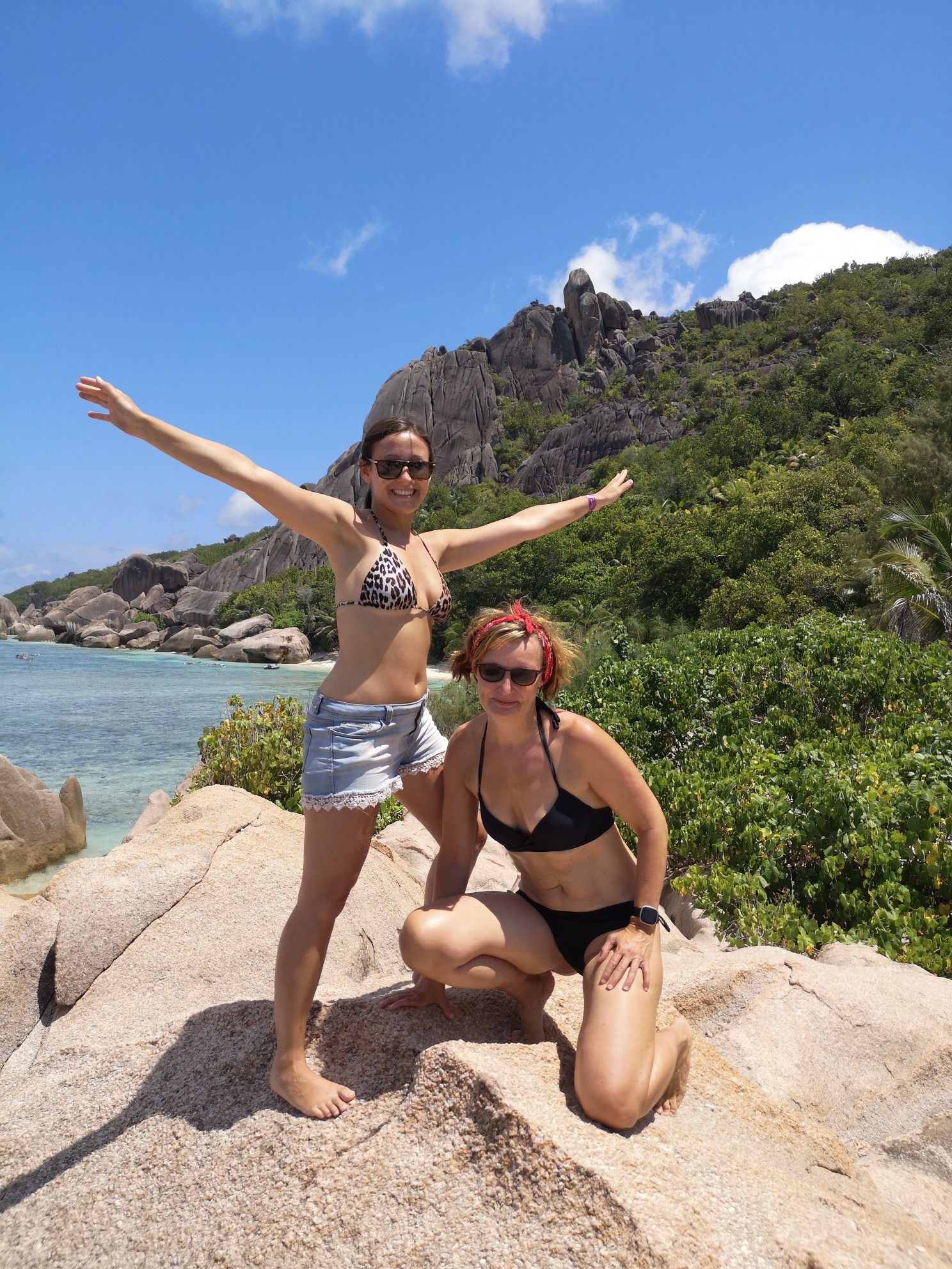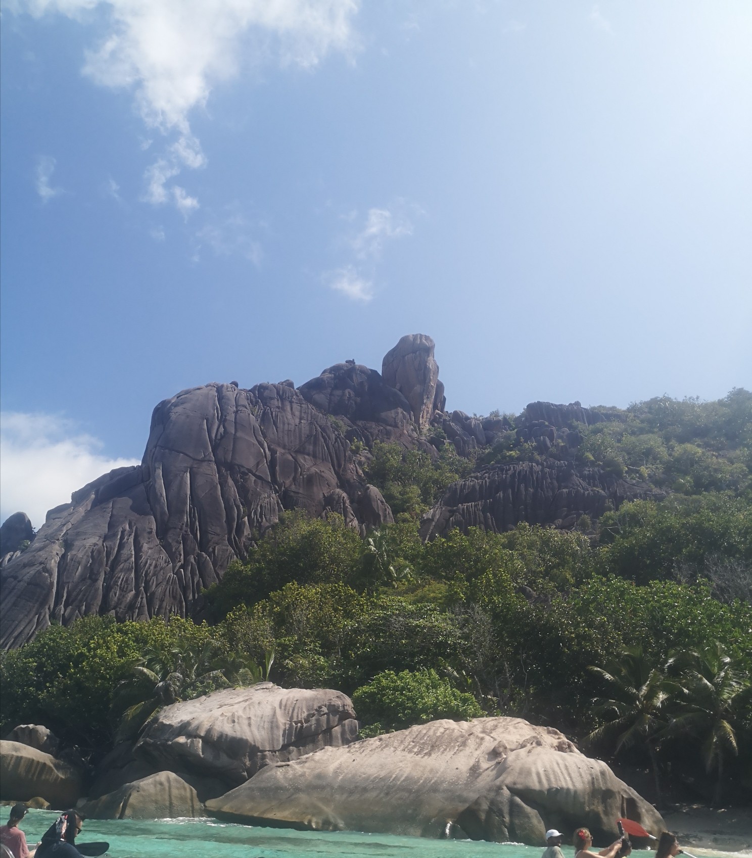 And then we went on to Anse Pierrot, or Robinson Island. The film Robinson Crusoe is said to have been made there in 1988. The beach looks exactly the same and we were able to see it for ourselves on land. Jude made us crawl through the ‚film sets‘: caves, jungle, pools. I really felt like I was in a film. Again. And when it came to survival training: How do I open a coconut? I really felt like Robinson. The teams had to compete against each other and one member had to try to open the coconut. We had some fun with an elderly gentleman from Romania who tried to open the coconut with his head. Vivi competed for us, as I have no strength in my hands and they are also very small. I would not survive as a Robinson without Friday. Vivi did quite well and got the nut cracked. The coconut water flowed out.