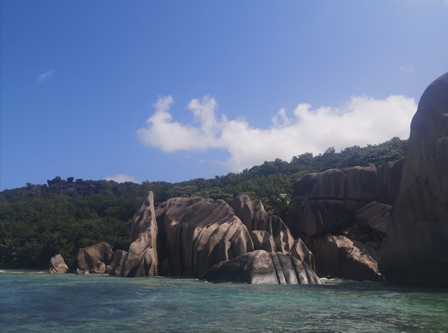 Das Team von Crystalwater Kayaks (Anis- der Besitzer, Jude, Leo-der Kapitän, und Karl – der Kokosnuss Champion) war bereits fleißig am Organisieren und Vorbereiten der Tour. Die glasklaren Kayaks lagen startbereit, die Teilnehmer aus allen Ländern trafen ein. Team Deutschland wurde vertreten durch Vivienne und mich. Weitere Teams kamen aus USA, Schweden, Rumänien, Polen, Slowenien, Ukraine (!!!!), Portugal. Ca 10 Kayaks gingen an den Start. Unser Guide war Jude, ein Entertainer im wahrsten Sinne des Wortes. Er wies uns ein auf eine lustige und entspannte Art und sein Team half uns in die Boote. Sie selbst begleiteten uns in einem Schlauchboot und wiesen uns die Richtung. Zuerst hinaus in die Lagune und dann am Strand Anse Source d’Argent entlang, den ganzen Strand im Blick. Was für eine Aussicht! Jetzt kommen die gesamten Felsformationen erst richtig zum Vorschein und man kann auch diverse Figuren erkennen: den Hai, den Kissing Rock, Coco de mer Rock und Elephant Rock. Jude sprang ins Wasser und beschrieb in anschaulicher Art das, was sich da vor uns aufbaute. Und plötzlich schwimmt da eine Riesenschildkröte zwischen den Booten. Was für ein einzigartiger Moment!
