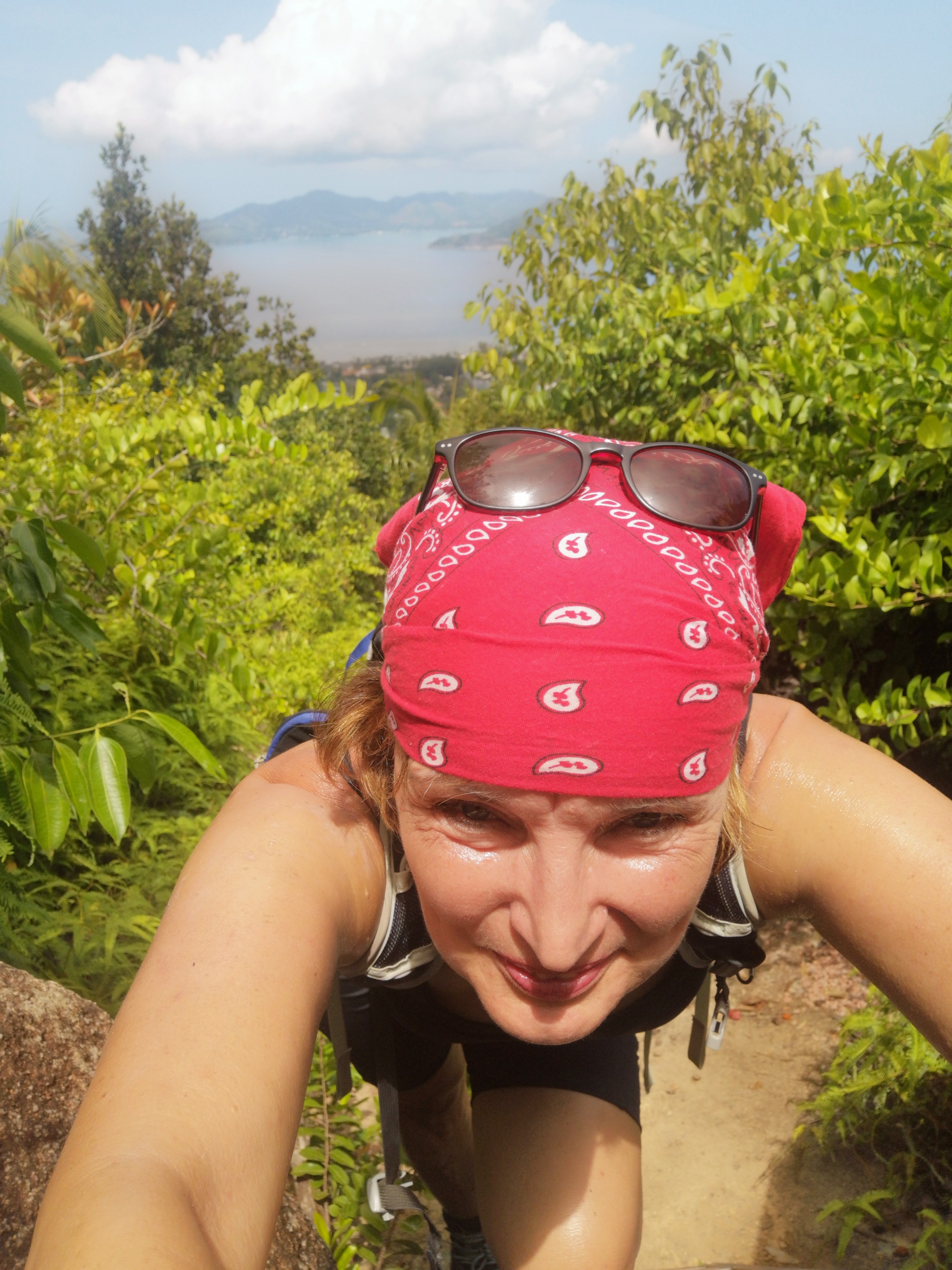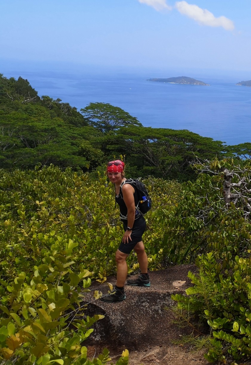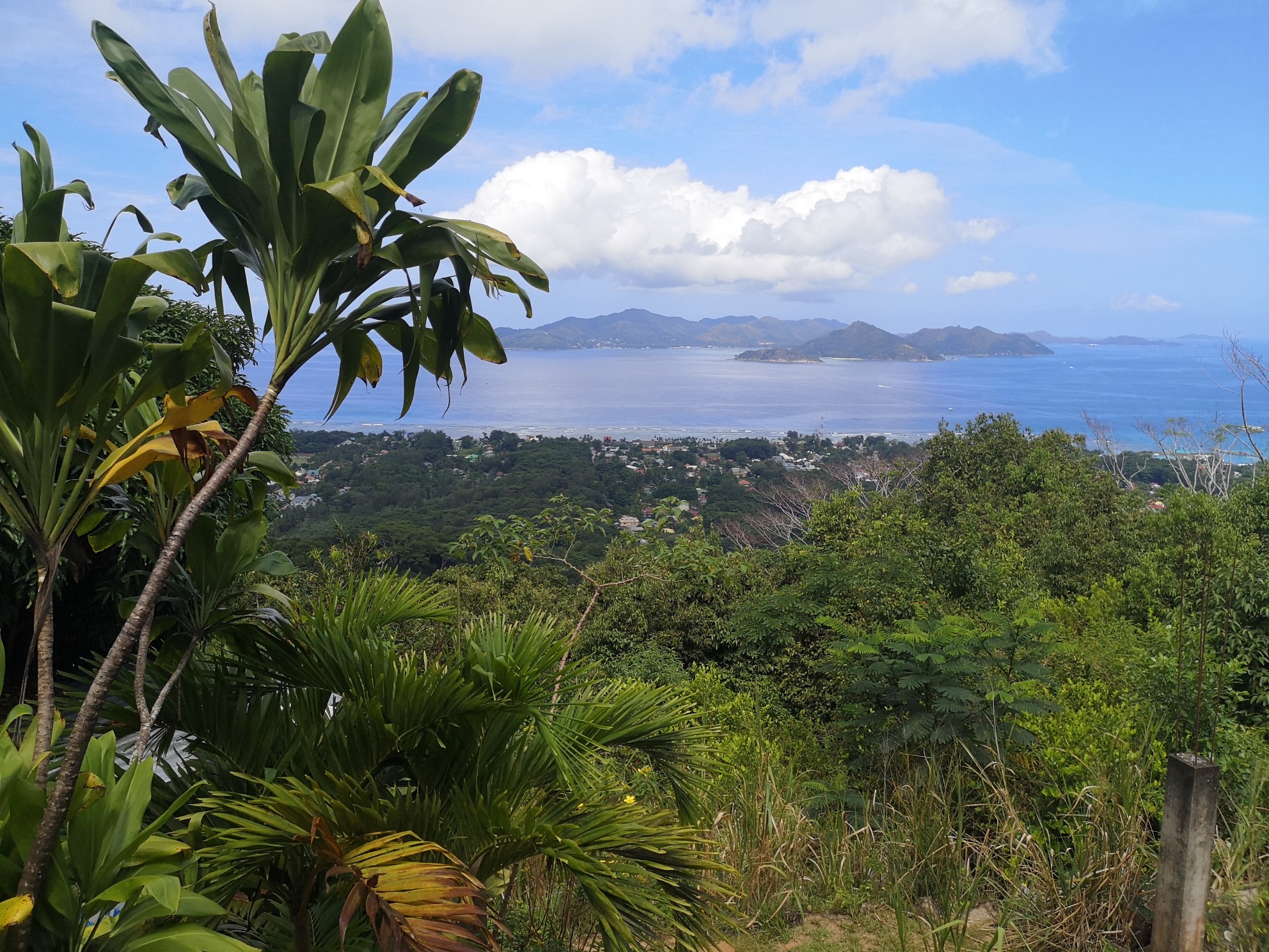 Bloß gut, dass ich die richtigen Schuhe anhatte. Auf dem Gipfel traf ich dann auf Menschen, die mir mitteilten, dass es da oben nicht weitergeht. Ach nö, den gleichen Weg zurück? Ich genoss erst einmal die Aussicht auf alle Strände und Inseln von da oben. Das Wetter war fantastisch, eine herrliche Sicht fast bis Mahé. Ich sah nochmal alle Inseln, auf und an denen ich in den letzten Tagen war. Die Sonne brannte und on top ist kein Schatten. Die Leute, die ich traf, warteten auf mich. Sie versuchten, über Google herauszubekommen, wo wir lang müssen und waren aber auch nicht erfolgreich in ihrer Suche. Es führte ein Weg hinab an den Strand. Wir suchten einen Aussichtspunkt und traten dann wohl oder übel denselben Rückweg wieder an. Ich war sichtlich erleichtert, dass ich diese Challenge nicht allein durchziehen musste.