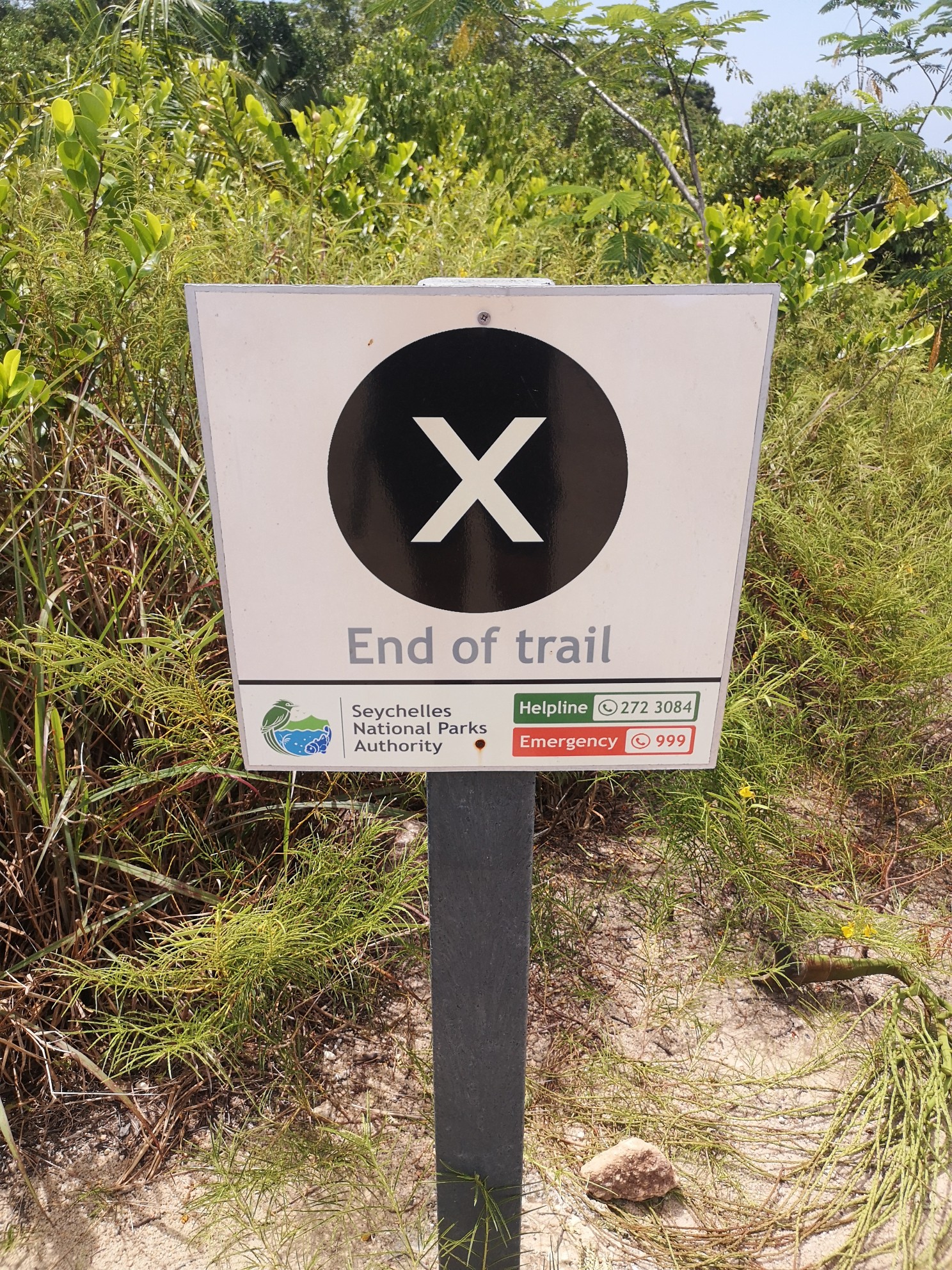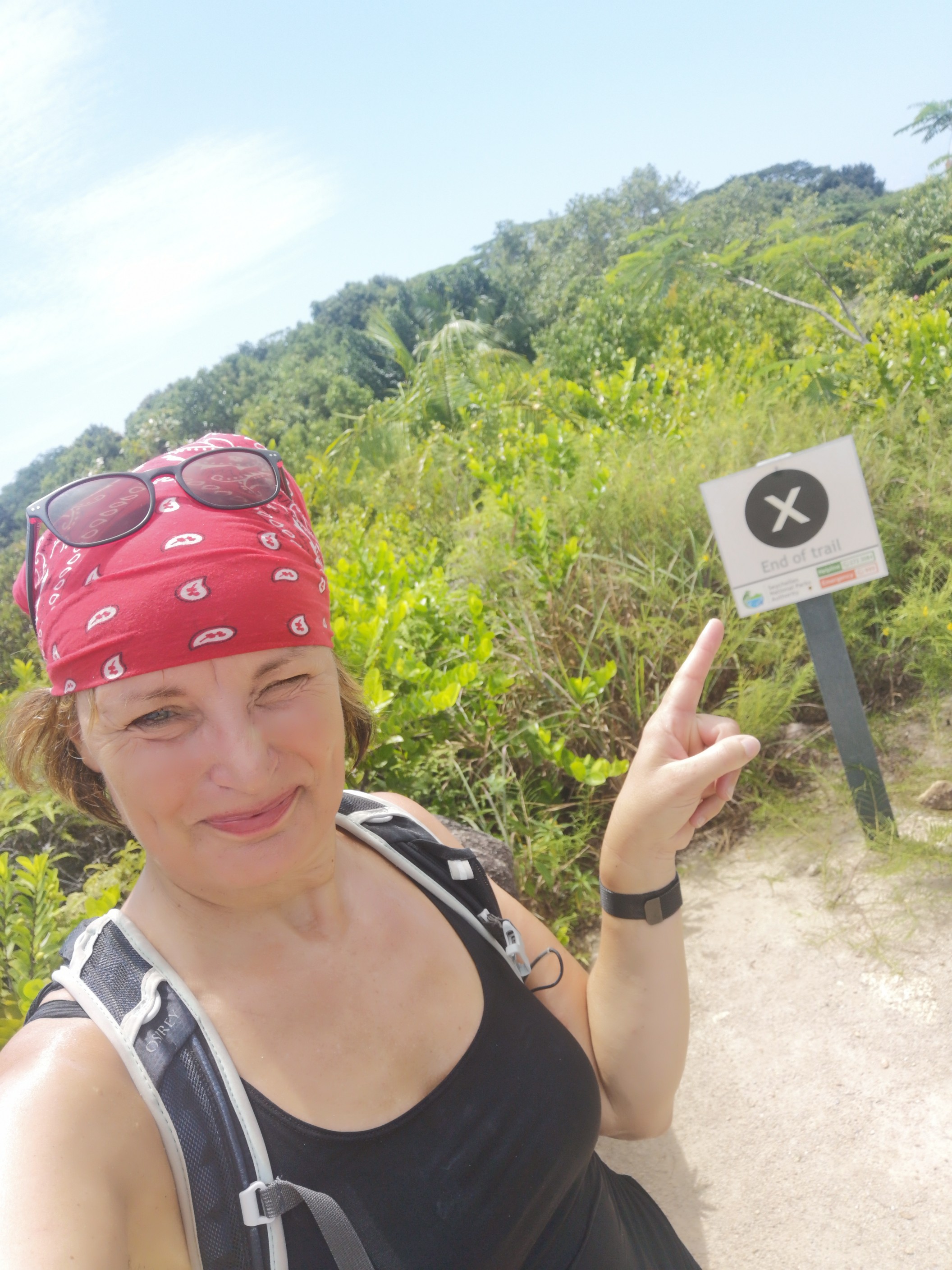 Just as well that I had the right shoes on. At the summit, I met people who told me that I couldn’t go any further up there. Oh no, the same way back? I first enjoyed the view of all the beaches and islands from up there. The weather was fantastic, a wonderful view almost all the way to Mahé. I saw all the islands I had been on and around in the last few days. The sun was burning and there is no shade on top. The people I met were waiting for me. They tried to find out via Google where we had to go and were not successful in their search either. There was a path leading down to the beach. We looked for a vantage point and then, willy-nilly, started the same way back. I was visibly relieved that I didn’t have to go through this challenge alone.