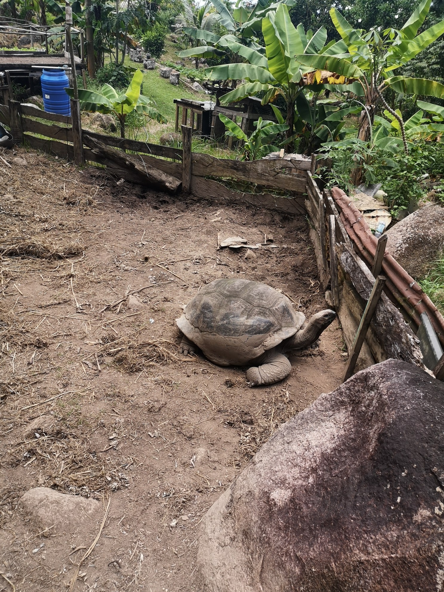 I didn’t want to spend this day testing the various beaches and instead wanted to explore the jungle. How about a hike up to the highest point of the island, Nid d’Aigle, at a whopping 315 metres. As an ‚experienced‘ mountain hiker with a diploma in ankle-breaking, I reckoned on about 1.5 h for this climb. Up to the Belle Vue point the road went up and that, I thought, I could ride my bike up or push it to let me roll down after the hike. After a few metres of pushing up a 20-30% incline, I gave up and left the bike at the next fence. I don’t let myself roll down here with these brakes either.
