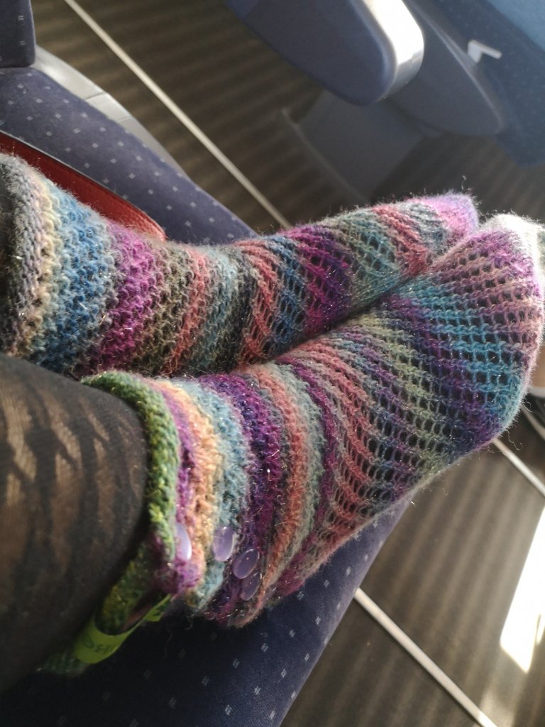 Und so strickte ich wieder drauf los. Peace Sox #2. Wieder sehr bunt, aber eine Frühjahrsvariante mit Lochmuster und Knopfleiste am Rand. Tragbar nur in Sneakern. Der März war sehr sonnig, fast 20 Grad. Man konnte schon denken, dass der Winter vorbei ist.