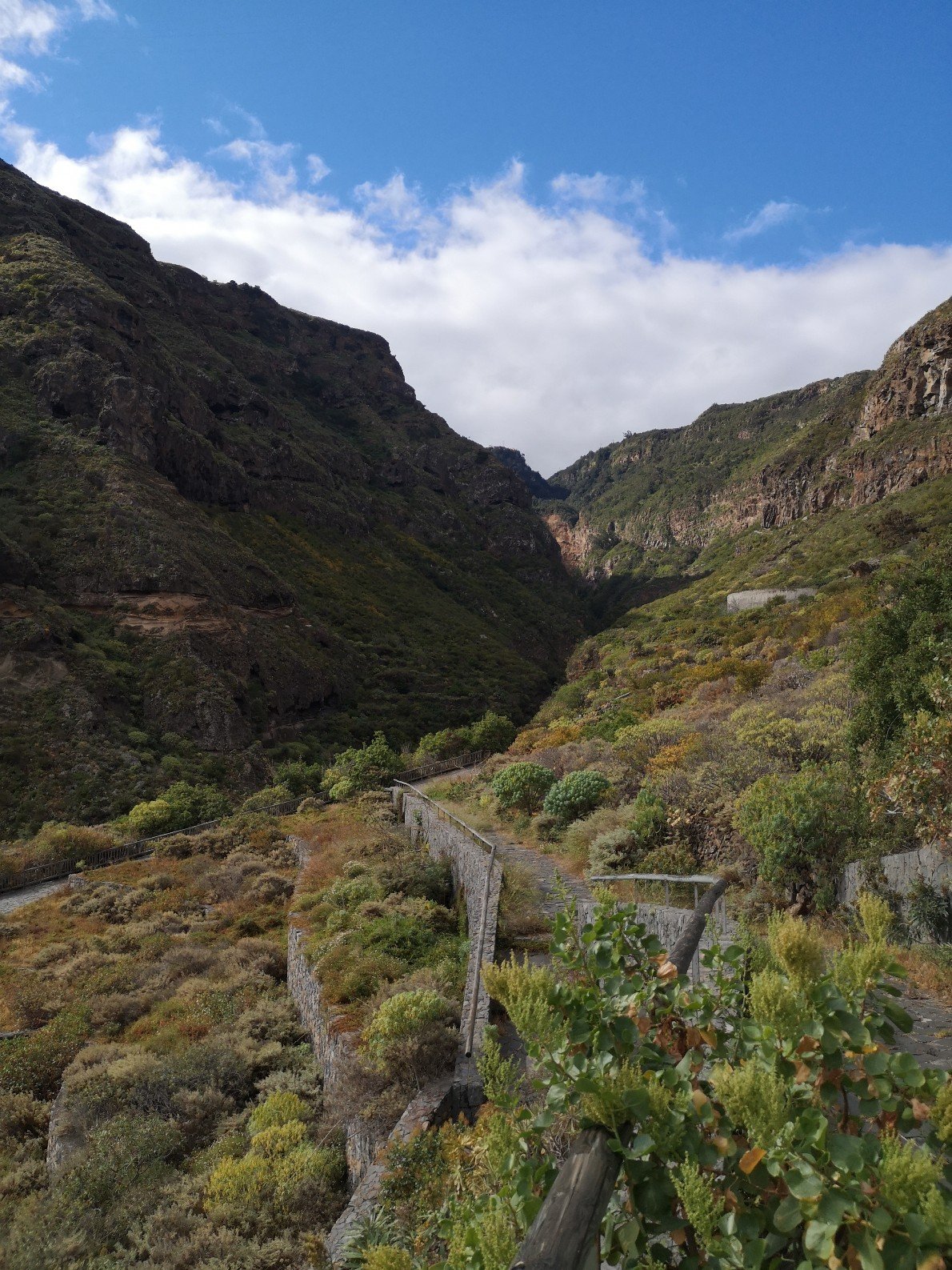 The next barranco to be crossed had no name. You are casually led to it in the guidebook. There are no signs for it. And again, completely unaware, I blundered into the next adventure. The book says: ‚beautiful hiking trail‘. What do they mean by ‚beautiful‘? Beautiful in the sense of nicely developed, or beautiful in the sense of scenically beautiful. Probably the latter, because at some points I didn’t know what to do. I was afraid I’d have to go all the way back again because I couldn’t find the exit. And then it was downhill. If I had known beforehand what I was getting myself into, I wouldn’t have taken this route. At some point, yellow arrows appeared to guide the blue-eyed hikers to the exit. My concentration was already beginning to wane and I almost panicked when I suddenly found myself facing a precipice and no longer knew how to get back. I found the yellowm arrows again and finally landed in the garden of a house in San Juan.