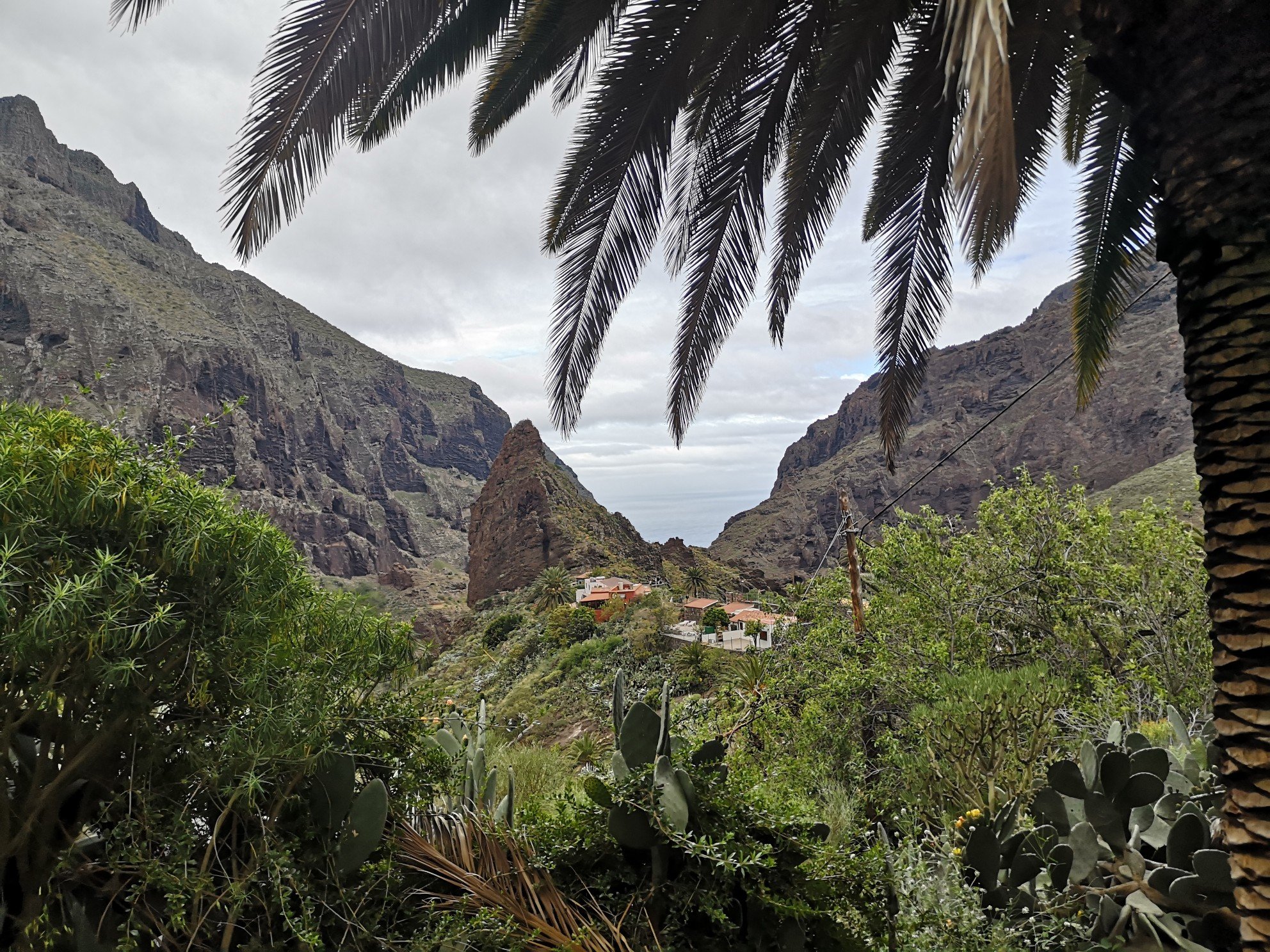 The landscape and the weather changed abruptly when we got out of the national park. It became greener and there was more and more blue to be seen between the clouds. I was starting to get restless. Sitting still for so long is not for me. But it was still a long way to Masca. The bus drove down a serpentine narrow road and back up to Masca. There were several buses on the road and a lot of cars. Vehicles were piling up at every viewpoint. Everyone wanted to enjoy the view, take photos. I first enjoyed the view from the bus, filmed with the Gopro and absorbed everything. It’s an impressive mountain range (Teno). But I wouldn’t even want to go by car. It would be too strenuous for me. In Masca, we were given a little more time to explore the village. As already assumed, completely overcrowded tourist-wise. There was hardly anything natural, original left. It was madness. Fifty years ago, this valley could only be reached by donkey. There was no road yet. And even such a narrow road – so crowded. I now understand why you need a permit for the gorge. After what I have seen now, I will probably not conquer the gorge itself. For me, the view from above was enough for the moment.