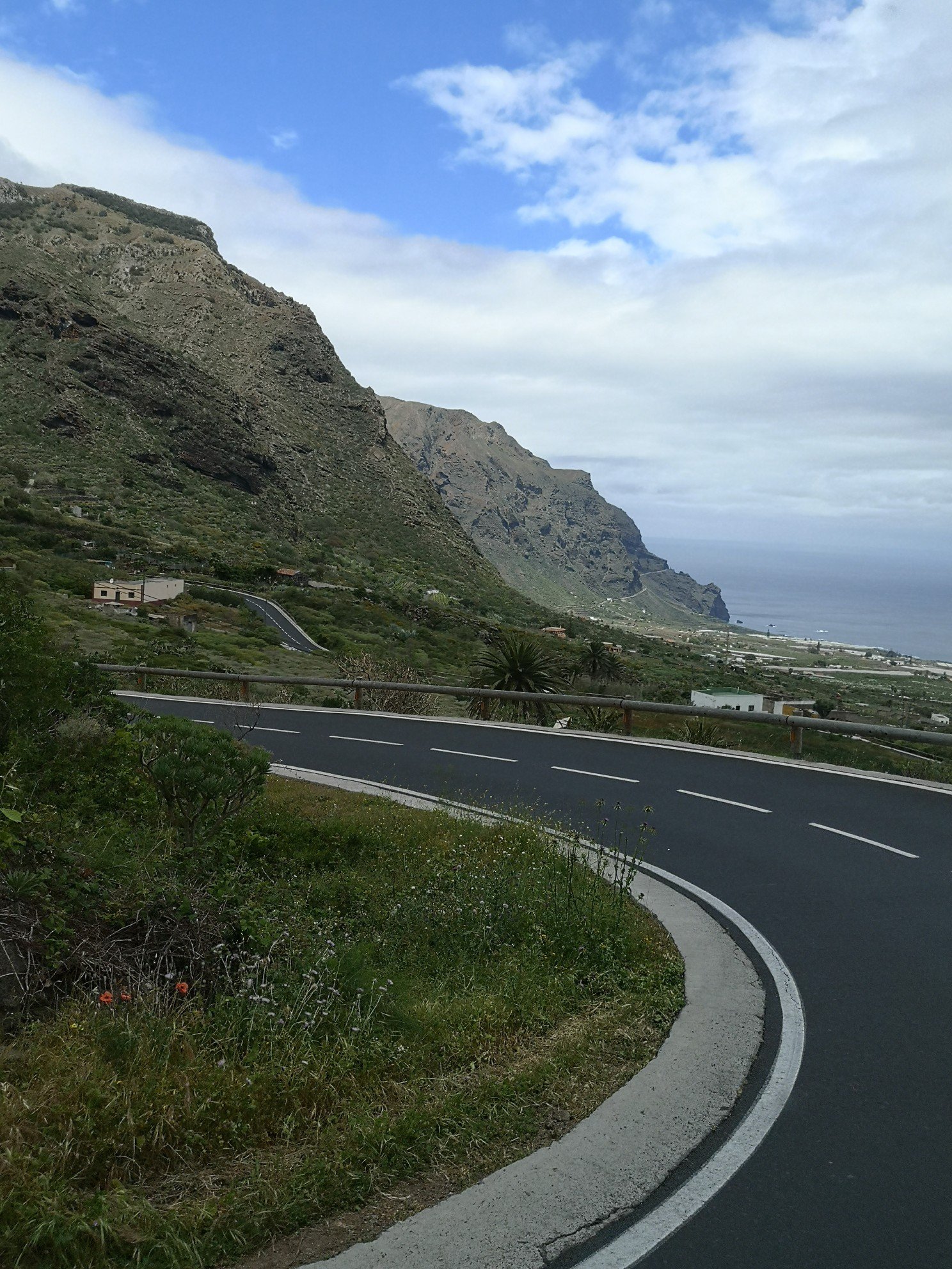 Die Landschaft und das Wetter änderten sich schlagartig, als wir aus dem Nationalpark herauskamen. Es wurde grüner und es gab immer mehr Blau zwischen den Wolken zu sehen. Ich wurde langsam unruhig. So lange still sitzen ist nichts für mich. Doch bis Masca war es noch ein Stück. Der Bus fuhr eine Serpentinen-reiche enge Straße hinunter und wieder hinauf nach Masca. Es waren einige Busse unterwegs und eine Menge Autos. An jedem Aussichtspunkt stapelten sich die Fahrzeuge. Jeder wollte den Ausblick genießen, Fotos machen. Ich genoss erst einmal den Ausblick aus dem Bus, filmte mit der Gopro und sog alles auf. Das ist schon ein imposantes Gebirge (Teno). Aber selbst mit dem Auto würde ich nicht fahren wollen. Das wäre mir zu anstrengend. In Masca gab man uns etwas mehr Zeit, um das Dorf zu erkunden. Wie bereits angenommen, touristisch völlig überfüllt. Da war kaum noch etwas Natürliches, Ursprüngliches. Schon ein Wahnsinn. Vor 50 Jahren konnte man dieses Tal nur mit Esel erreichen. Eine Straße gab es noch nicht. Und selbst so eine enge Straße – so überfüllt. Ich verstehe jetzt, warum man für die Schlucht eine Erlaubnis benötigt. Nachdem was ich jetzt gesehen habe, werde ich wohl die Schlucht selbst nicht erobern. Mir reichte für den Moment der Blick von oben hinunter.