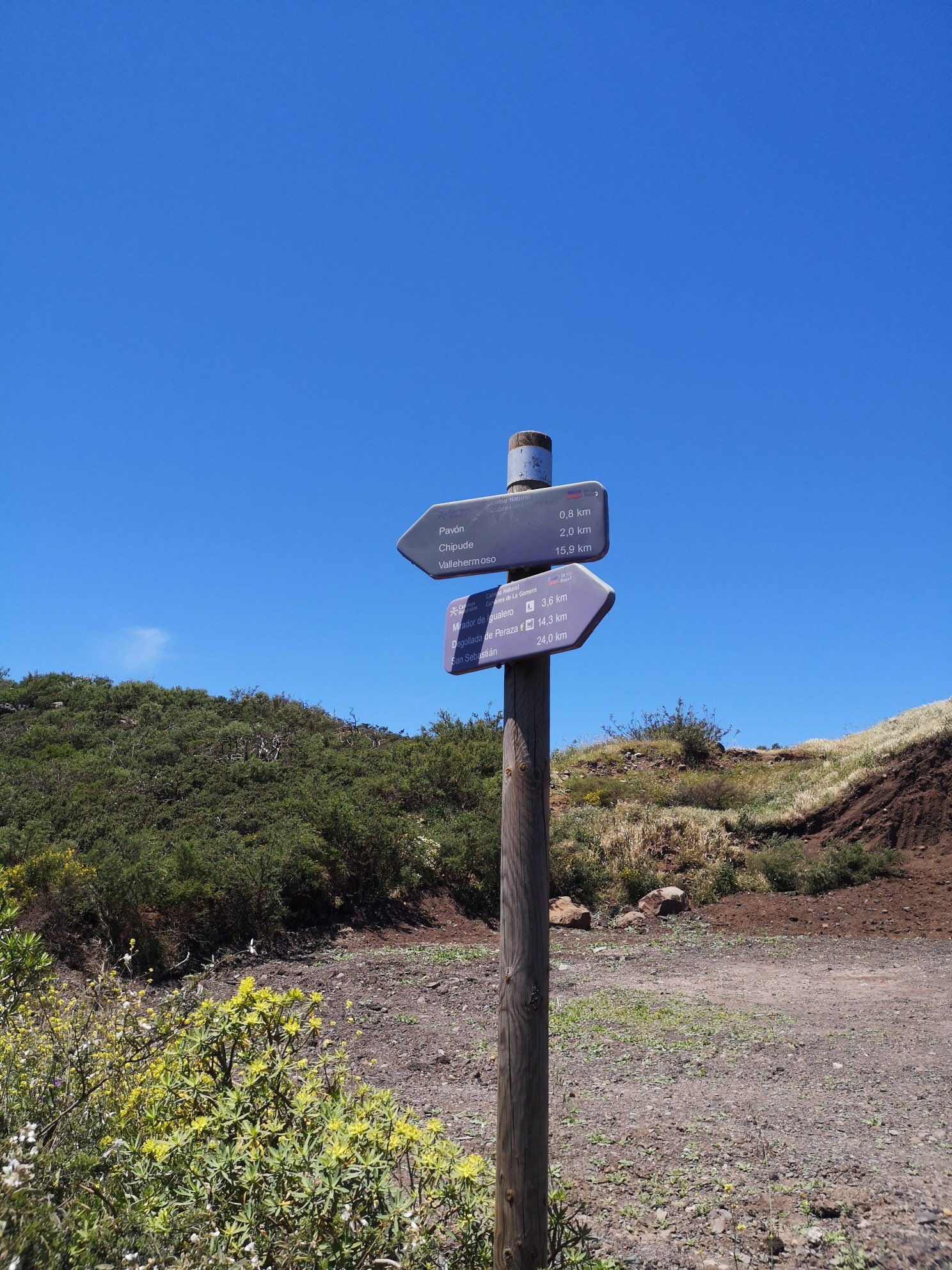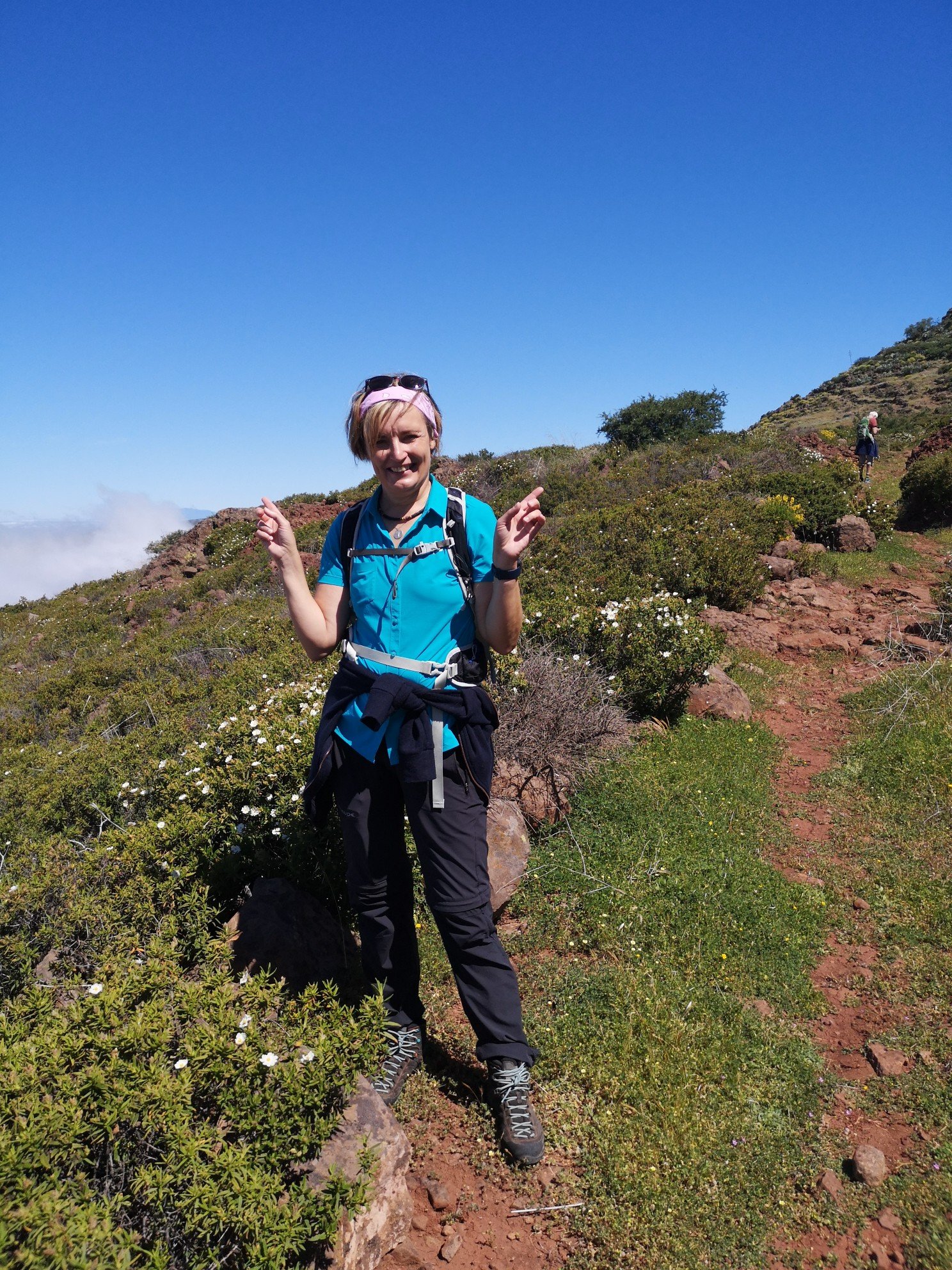 And I can’t write much more than that, except that at the beginning we climbed a few metres in altitude, then comfortably along a shepherd’s path to the so-called Table Mountain / Fortaleza. At the beginning, we were still walking in the fog, but the higher we got, the bluer the sky became and the sun + physical exertion made us sweat. Our hiking guide Carlo explained various plants and their purpose for the indigenous people of the island. We walked along the meadows and sniffed the scent of fennel, camomile, wild pepper, peppermint. And again and again we could see El Hierro and La Palma on the horizon. What luck we had with the weather!