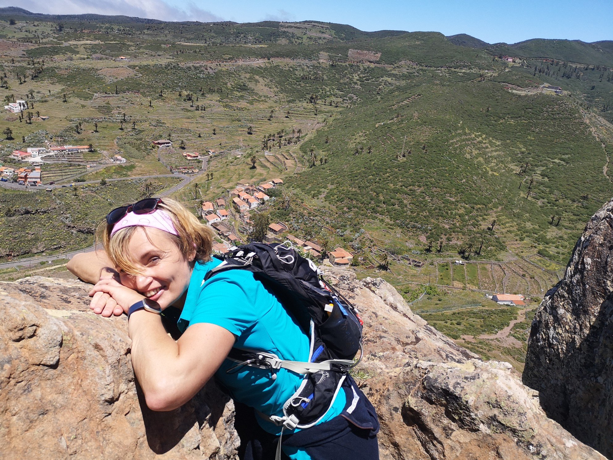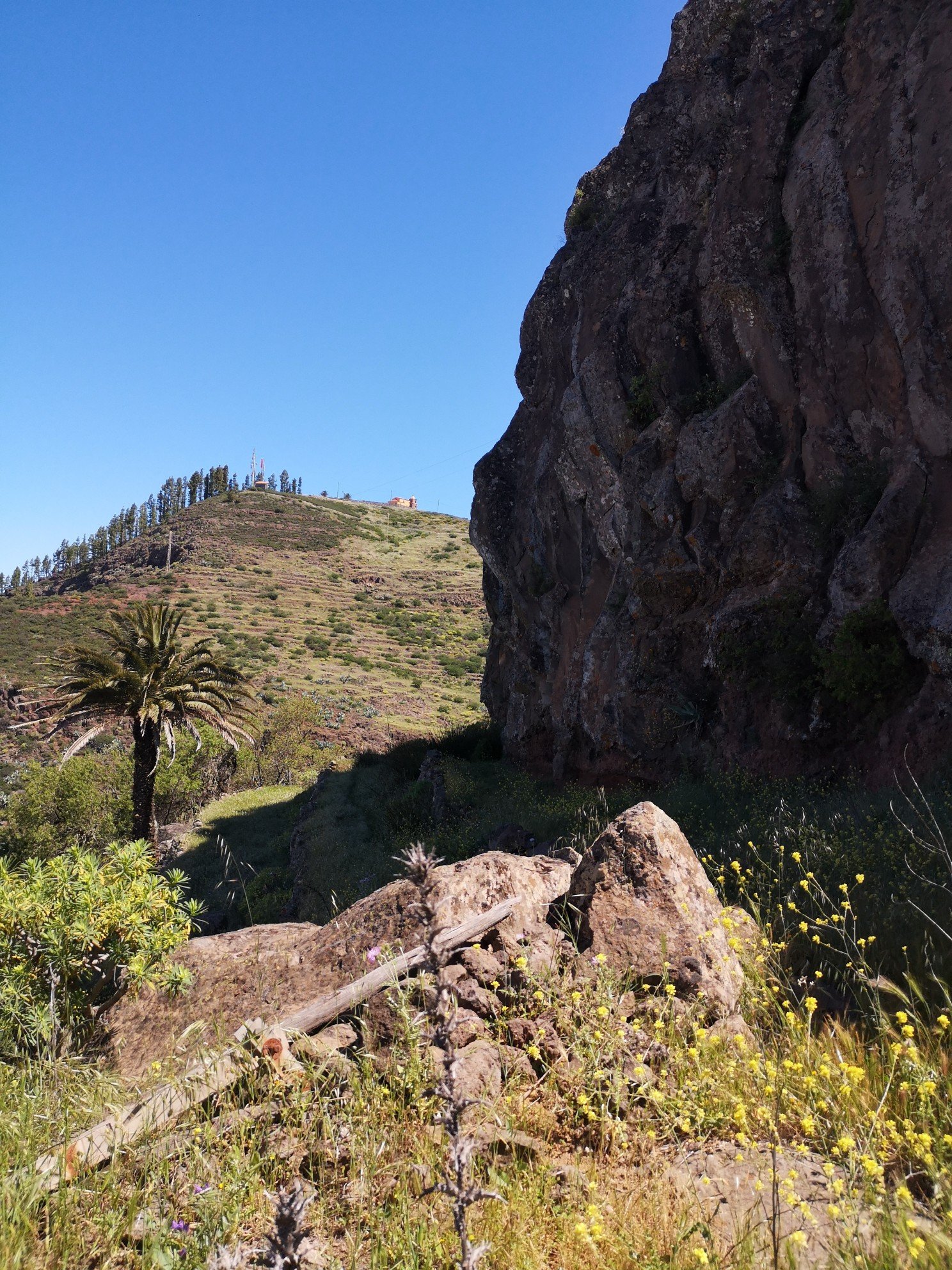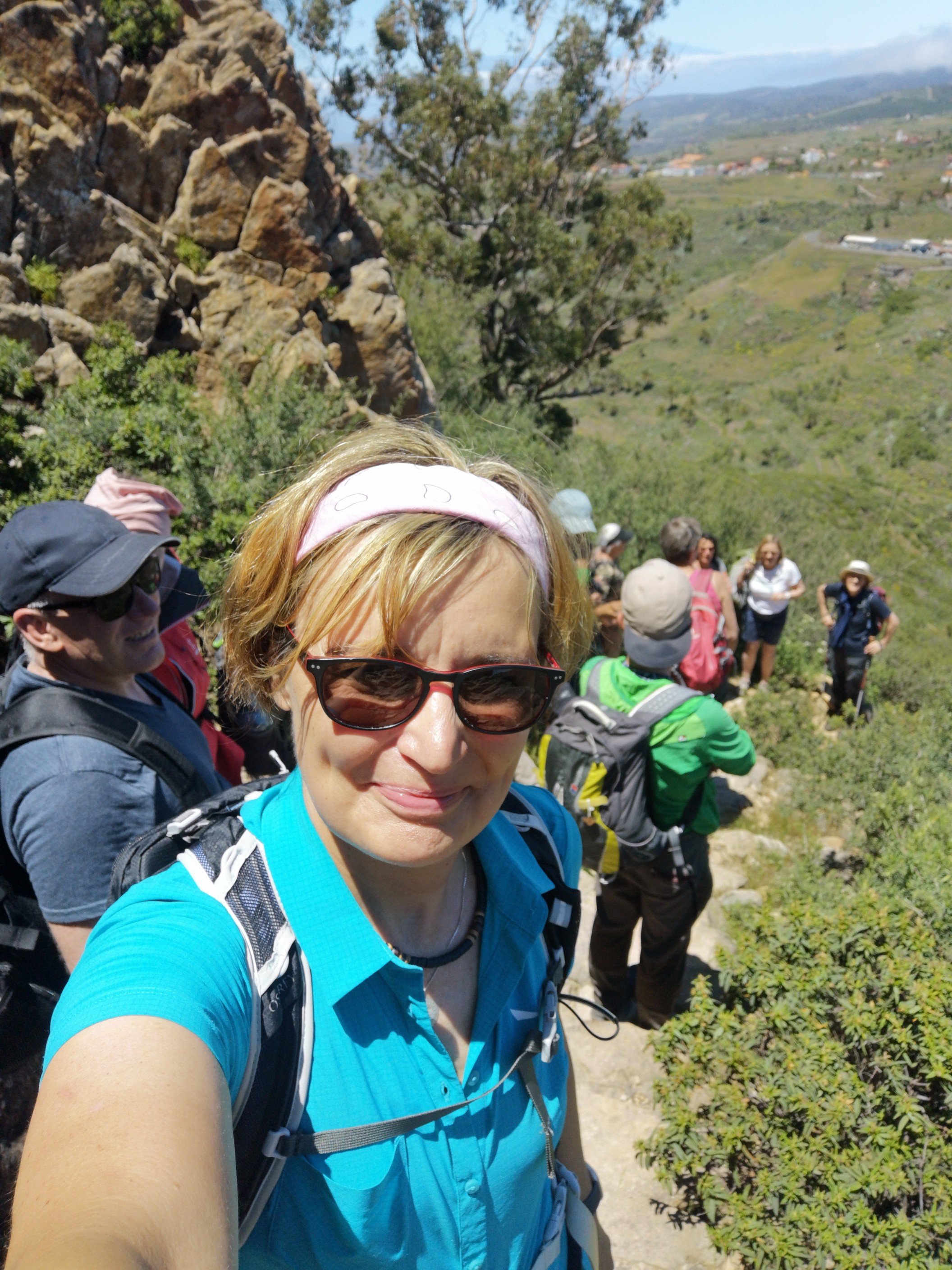 Die erste Tour führte eine noch internationale Gruppe von etwa 15 Personen aus Dänemark, England, Österreich jund Deutschland (der Großteil) zum Tafelberg. Auch Gomera hat einen solchen, und der ist sogar 200 m höher als der in Kapstadt. Auf der Website von Timah wird die Route so beschrieben: ‚Folgen Sie uns heute durch das Canyonland von La Gomera, vorbei an Palmen, Agaven, Feigen- und Mandelbäumen hinauf zum höchst gelegenen Dorf der Insel nach Igualero und weiter bis zum alten Kultberg der Gomeros: La Fortaleza. Auf dem Weg dorthin wandern wir entlang einer bizarren, fast alpinen Gebirgslandschaft, deren tief abfallende Berghänge uns beeindrucken und den einzigartigen Inselaufbau erkennen lassen. Nach der Brotzeit wandern wir auf dem eindrucksvollen Pfad weiter Richtung La Fortaleza, unserem heutigen Tagesziel, die je nach Wetterlage bestiegen wird. Zum Abschluss der Tour erfrischen wir uns in einer Bar.‘