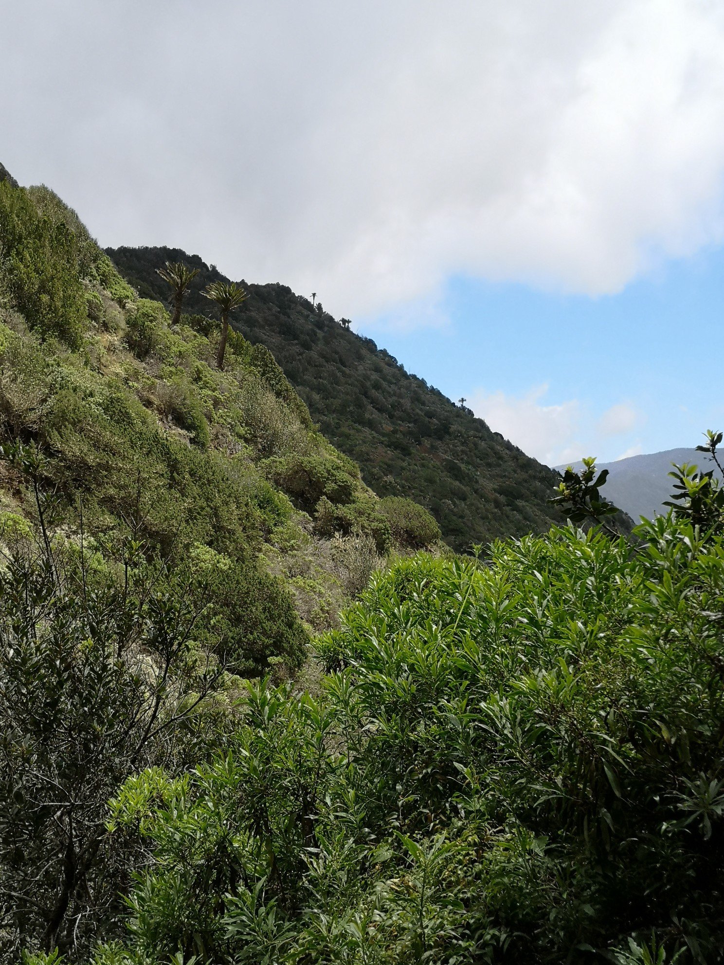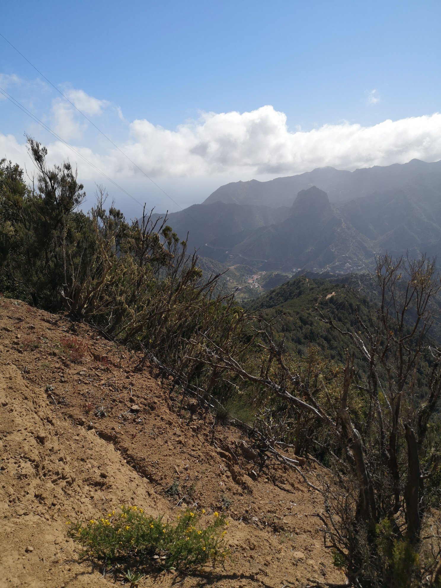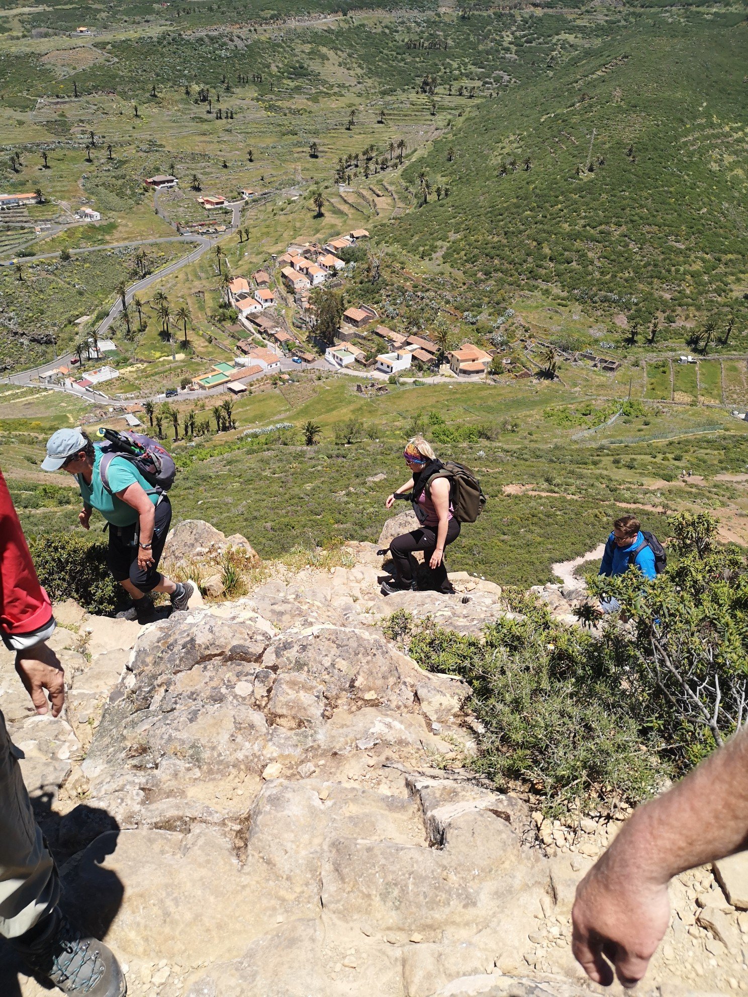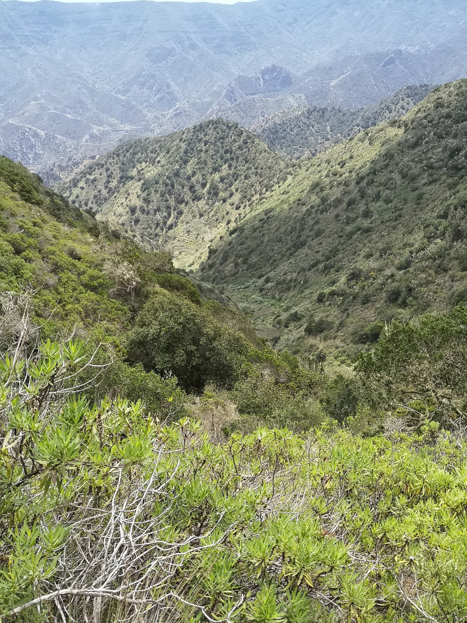 Hike leader was Carlo again and this time he did not need to translate, because all participants were from the DACH area. Some familiar faces from the previous day were there again. The weather was quite good again. Only once a thick cloud, which the trade wind drove over. Before the spectacular view could be enjoyed, we went through the laurel forest again with various explanations about plants and their uses or uselessness. I learned, for example, that the eucalyptus is actually a weed. It only draws water from the soil and serves no one else. It rather favours the danger of forest fires. See Australia. Only the koalas benefit from it. And there are no koalas on La Gomera. At least I haven’t seen any animals other than rabbits, partridges and geckos. Today, at the Santa Klara chapel, we were joined by three cats and two roosters. The most spectacular part for me was the descent over 600 metres in altitude. I was already feeling a little uneasy beforehand, or rather my ankle was. Utmost concentration was called for. We crossed thickets in parts. Carlo used his walking stick as a machete to make room. To the right and left, the grass, bushes, ferns and various flowers grew chest-high. And there were stumbling blocks hiding on the ground. But it remained a gradual descent, not such a hammering as the day before.