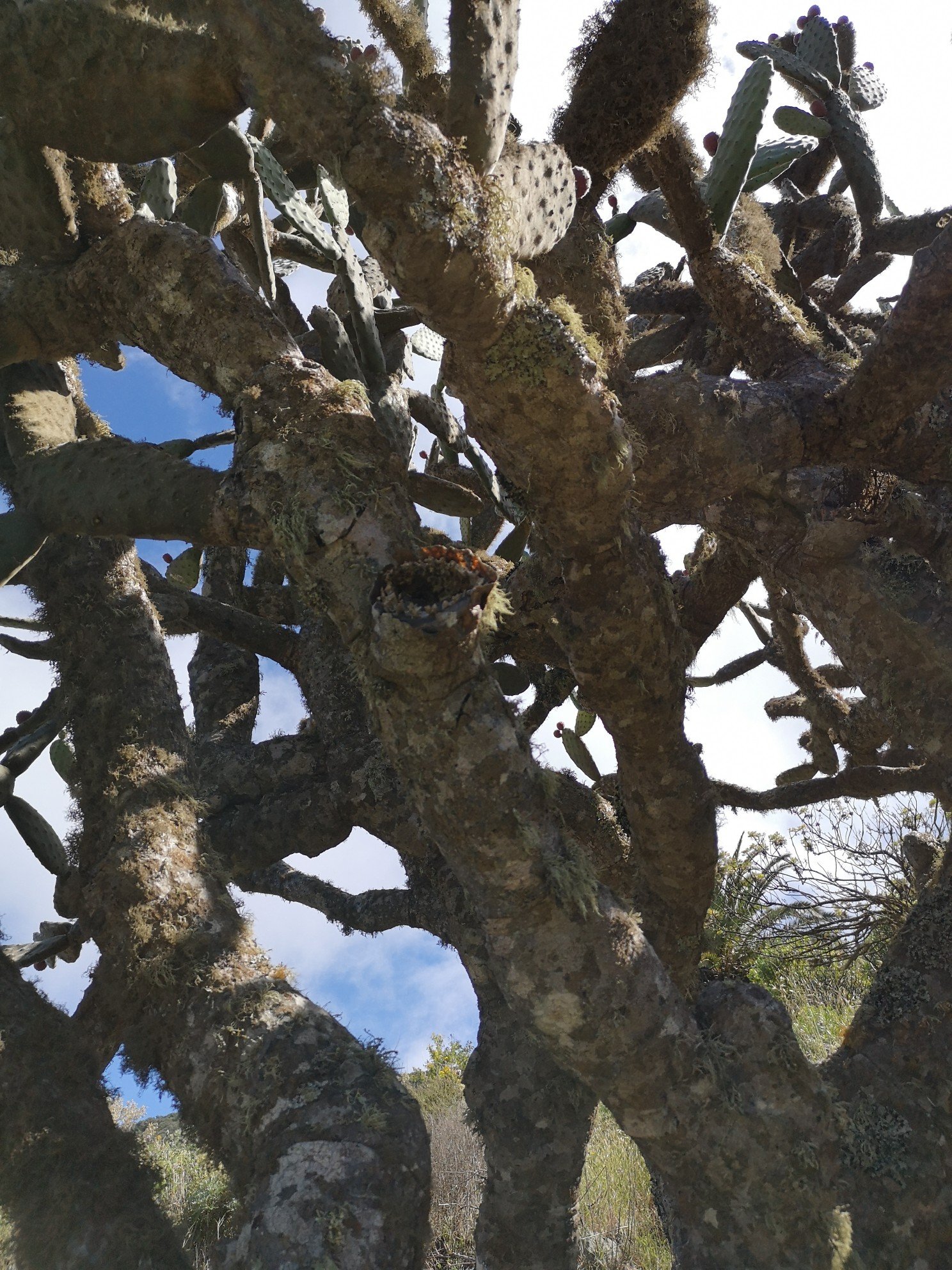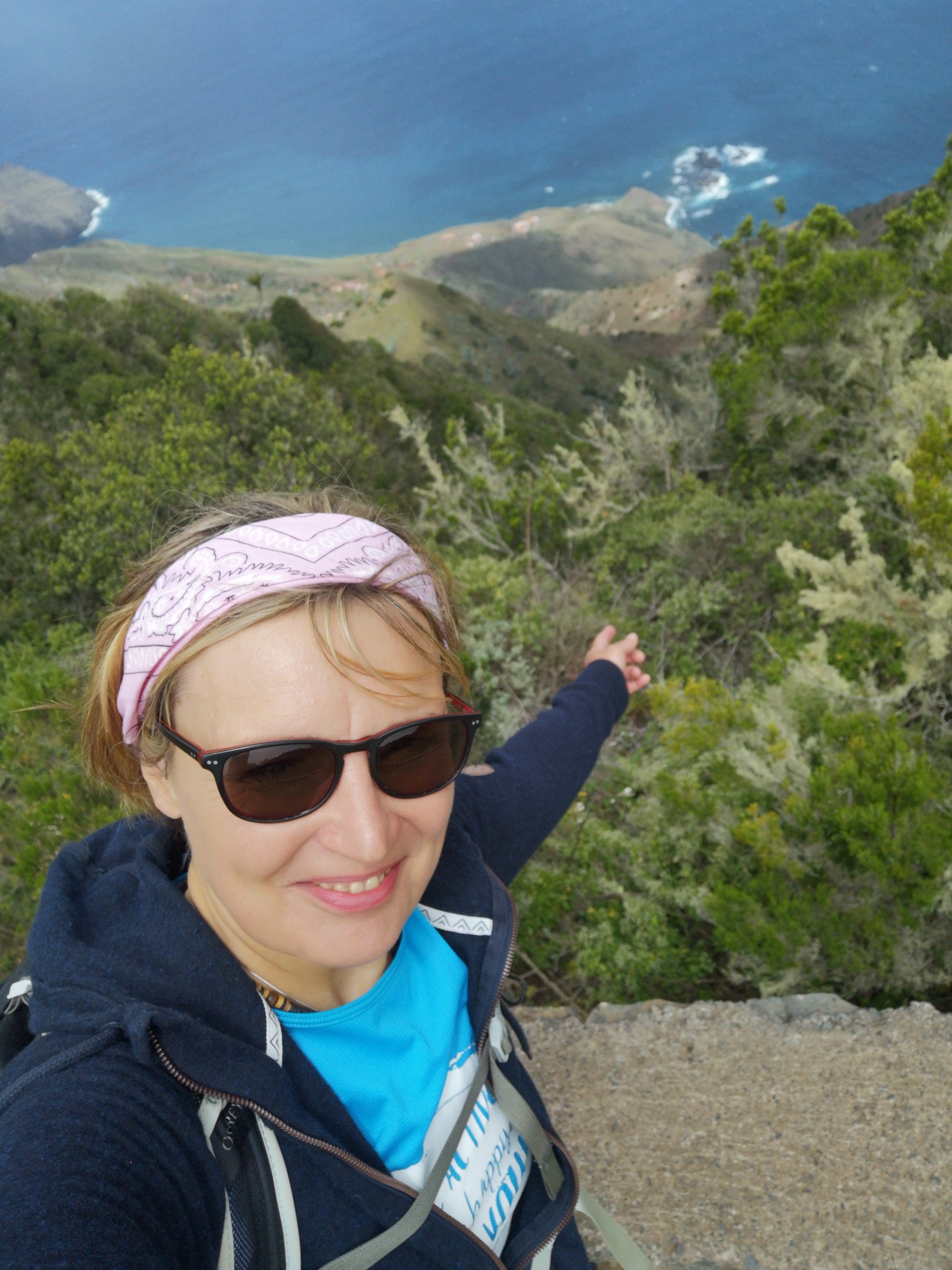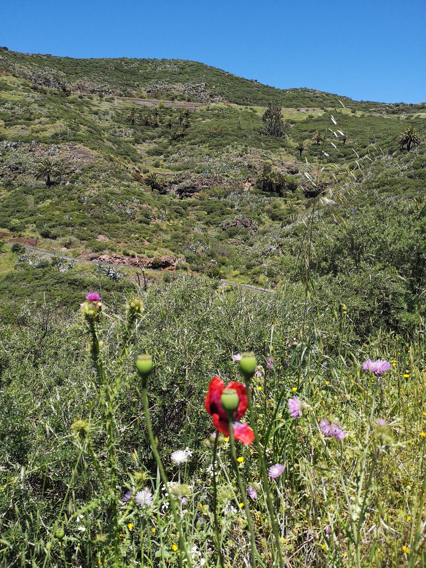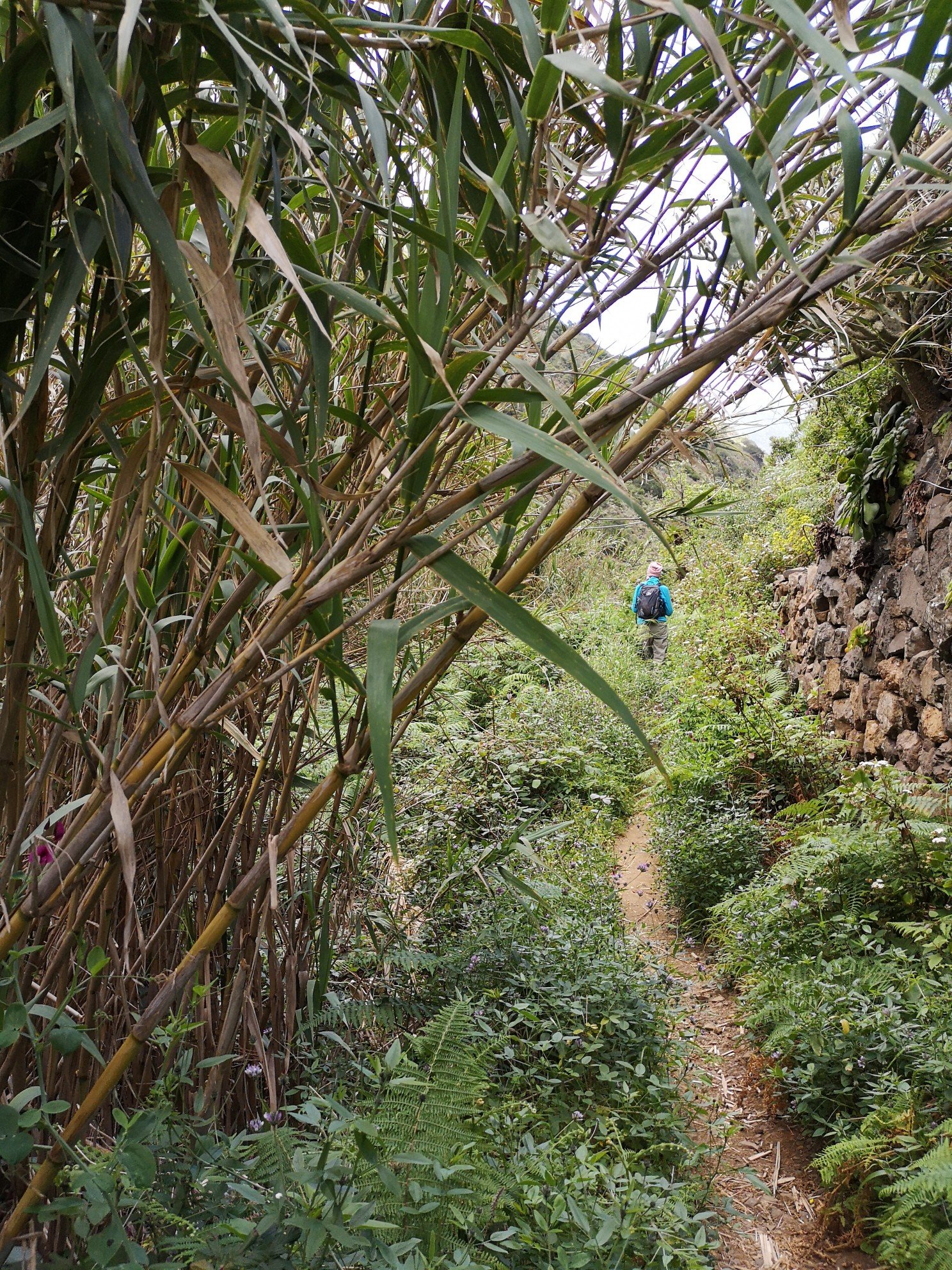 Hike leader was Carlo again and this time he did not need to translate, because all participants were from the DACH area. Some familiar faces from the previous day were there again. The weather was quite good again. Only once a thick cloud, which the trade wind drove over. Before the spectacular view could be enjoyed, we went through the laurel forest again with various explanations about plants and their uses or uselessness. I learned, for example, that the eucalyptus is actually a weed. It only draws water from the soil and serves no one else. It rather favours the danger of forest fires. See Australia. Only the koalas benefit from it. And there are no koalas on La Gomera. At least I haven’t seen any animals other than rabbits, partridges and geckos. Today, at the Santa Klara chapel, we were joined by three cats and two roosters. The most spectacular part for me was the descent over 600 metres in altitude. I was already feeling a little uneasy beforehand, or rather my ankle was. Utmost concentration was called for. We crossed thickets in parts. Carlo used his walking stick as a machete to make room. To the right and left, the grass, bushes, ferns and various flowers grew chest-high. And there were stumbling blocks hiding on the ground. But it remained a gradual descent, not such a hammering as the day before.