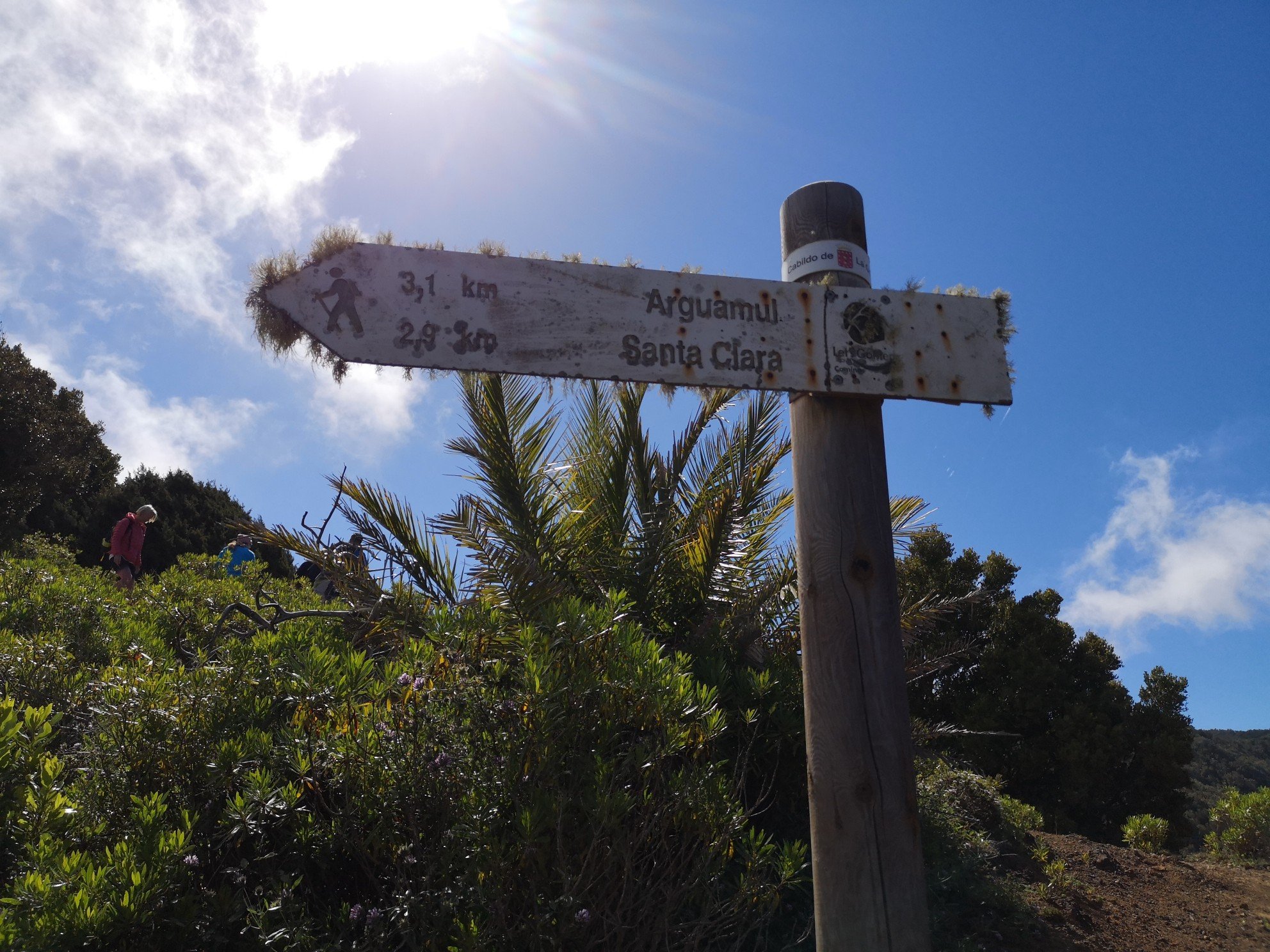 Wanderführer war wieder Carlo und diesmal brauchte er nicht übersetzen, denn alle Teilnehmer waren aus dem DACH Raum. Einige bekannte Gesichter vom vorhergehenden Tag waren wieder dabei. Wieder recht gutes Wetter. Nur einmal eine dicke Wolke, die der Passatwind herüber trieb. Bevor die spektakuläre Aussicht genossen werden konnte, ging es durch den Lorbeerwald wieder mit diversen Erklärungen zu Pflanzen und deren Nutzen bzw. Unnutzen. Ich erfuhr zum Beispiel, dass der Eukalyptus eigentlich ein Unkraut ist. Er entzieht der Erde nur das Wasser und dient sonst niemanden. Begünstigt eher die Waldbrandgefahr. Siehe Australien. Nur die Koalas haben was davon. Und die gibt es auf La Gomera nicht. Zumindest habe ich noch keine anderen Tiere außer Hasen, Rebhühner und Geckos gesehen. Heute kamen der Kapelle Santa Klara noch drei Katzen und zwei Hähne hinzu. Das spektakulärste Stück war für mich der Abstieg über 600 Höhenmeter. Mir wurde schon vorher etwas unbehaglich, oder besser meinem Knöchel. Höchste Konzentration war angesagt. Wir durchquerten zum Teil Dickicht. Carlo nutzte seinen Wanderstock als Machete, um Platz zu machen. Rechts und links wuchsen das Gras, die Büsche, Farn und diverse Blumen brusthoch. Und am Boden versteckten sich Stolpersteine. Es blieb aber ein allmählicher Abstieg, nicht so ein Hammer wie am Tag zuvor.
