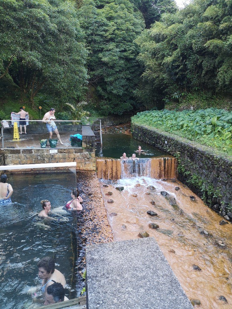 I actually wanted to go to the Terra Nostra Park, where there are also thermal springs with bathing facilities. But unfortunately I was half an hour too late. At 16.30 clock it was already closed. Oh how stupid. In Furnas, however, there are several such hot springs and so I picked the closest one. Wow! That was like a real swimming pool. And I didn’t find it that small with six pools. I worked my way from the back (coldest at 28° C) to the front (39° C). In an hour and a half I basked in the warmth and stretched my legs and arms in all directions. And almost fell asleep. My legs were all red from the iron. Funny. Red from the iron, not from the sun.