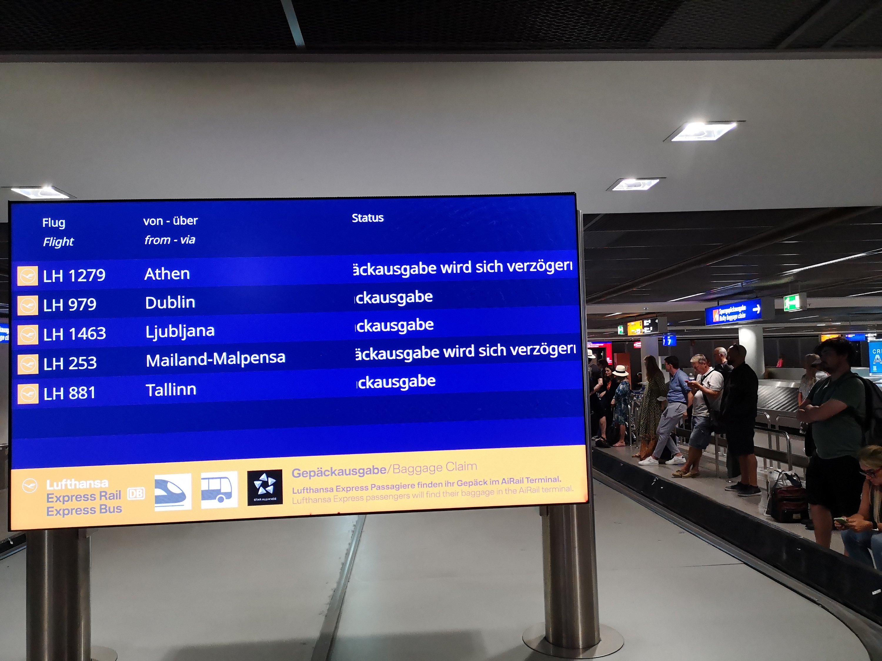 Finally arrived at baggage claim, searched for the Athens baggage carousel. Somewhere almost at the end, where four suitcases had probably been doing their rounds for hours. And I thought my suitcase would already be bored. Nope, suitcases from five planes were supposed to be unloaded here. Apparently Dublin, Ljubljana and Tallinn had already gone through. Milan was hanging in the loop. Athens – nothing was moving yet. After about 20 minutes I went to a toilet and freshened up. It could take a while, so I had to use the time. Maybe they should install a few showers here. When I came back, there was at least one piece of information on the board: Baggage claim will be late. I look for a place to sit, because it can only be a matter of hours now. There wasn’t much left, because the people from the Milano plane were also waiting. My bench neighbour, from New York, looked a bit desperate. He had actually been waiting for an hour. OMG, wasn’t it!!! He actually wanted to fly directly from New York to Frankfurt. Flight cancelled. They were rebooked via Milan, are going to a wedding tomorrow and are waiting for their suitcases. I tried to cheer them up and after a few minutes appeared: Athens – in 5 minutes. Milan still delayed. After 5 minutes they changed to: In a few minutes. And then in 2 minutes. And at some point it said: It’s on. Nothing was running. The clocks here somehow run very very slowly. Sometime after an hour I had my suitcase. The Milan plane was still delayed. I felt so sorry for them and I just hope they didn’t have to spend the night in baggage claim.