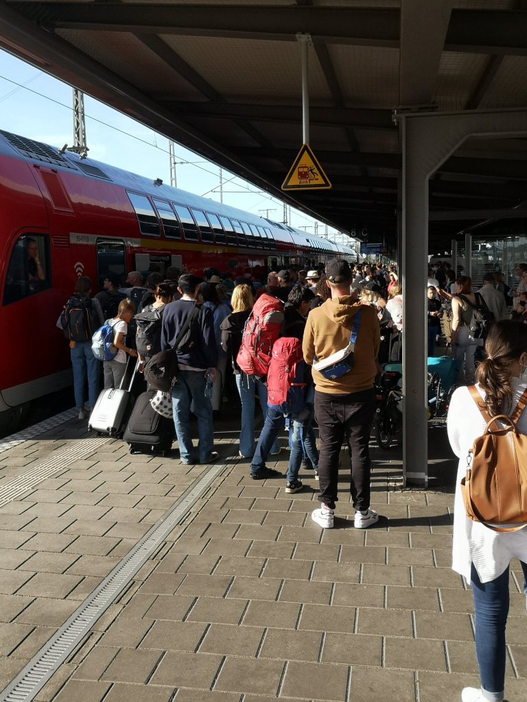 After my odyssey from Frankfurt Airport to Bad Nauheim for the Rose Festival, I had to get back to Berlin somehow. I could have taken the ICE. But I probably would have been late again. I tested out the regional trains and arrived in Berlin almost on time. How boring, you might say. Where’s the adventure in that? But 4 becomes 8 hours – with three changes in Kassel, Sangerhausen and Magdeburg. The trains were packed. Not surprising on a Sunday. The passengers came from all age groups: Families with small children in prams, students on holiday or returning to the city, pensioners, cyclists coming back from their tour. The platform was bursting at the seams. And when the train pulled in, everything crowded up to the doors. Hardly anyone came out. Everything just wanted to get in, somehow. The train staff were extremely nervous because everything was crowded very close to the edge of the platform before the train pulled in.