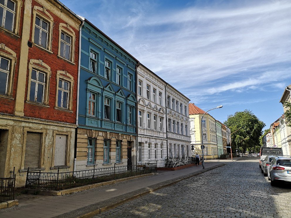The remaining 12 km were mostly over the dyke. Quite early in the afternoon I reached the former industrial town of Wittenberge, where I moved into a cabin at the Pension zum Tivoli. Wittenberge is famous for the Singer sewing machine factory, which Isaac Singer founded here at the beginning of the 20th century. From far away you can see the famous clock tower. The clock face is said to be one of the largest in Europe. It’s even bigger than Big Ben’s. Along the harbour, the brick buildings (warehouses, harbour buildings, old mill) have been reconstructed. A real promenade. Only the city centre still lacks investment. The once magnificent neoclassical residential buildings are largely empty and left to their own devices.