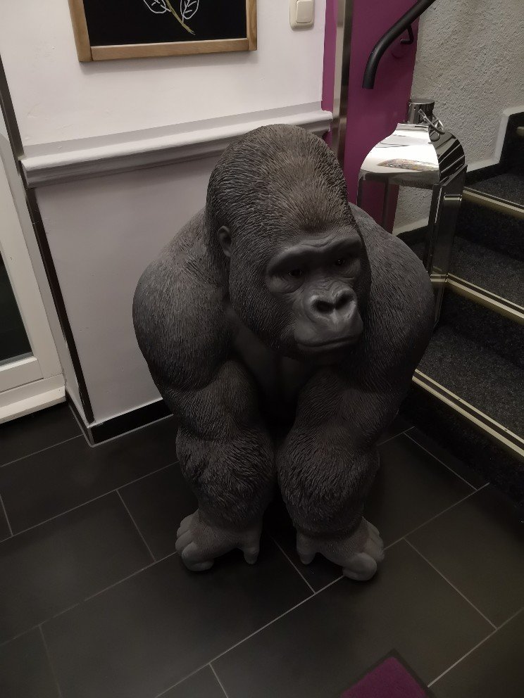 Our hotel (Hotel Mason) is actually worth an extra blog. I have never seen anything like it. And I still wonder now what the style was. Two spidermen hung on the façade, probably dusted off from the cinema. In the foyer, a plastic monkey statue greeted us. There was glitter everywhere. Chairs with glittering stones, colourful pictures. Style??? Completely mixed up. In my room, there were golden curtains, a skull and crossbones on the desk, the bedside lamp was mounted on a dog, there were brightly coloured Donald Duck pictures on the wall. The toilets were jet black. Wallpaper dark. OMG! I hope I don’t get nightmares. After the restless night, to breakfast. Again, complete overstimulation of all senses. Skulls on the buffet. Golden and black spoons, pictures of various stars without any relation to each other … I can’t even put it all together anymore. But the most blatant was the PUR concert of 2007, which is probably broadcast on several screens every morning. With Karel Gott singing Maya the Bee. So, if you’re coming to Altenburg, I’m warning you. On the other hand, this establishment is also unique.