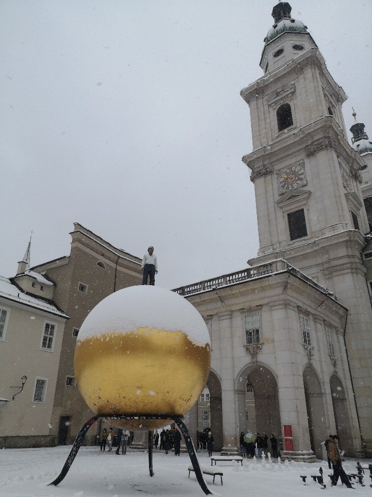 I had enough time to explore Salzburg. I spared myself the Mozart Houses, because there were crowds of tourists in front of them. You probably have to book in advance online for these. I was drawn through the winding alleys of the old town, to the cathedral through deep snow. Children were building snowmen in the squares. Due to a lack of gloves, I refrained from doing so and instead photographed the art objects that were being created and praised the little architect.