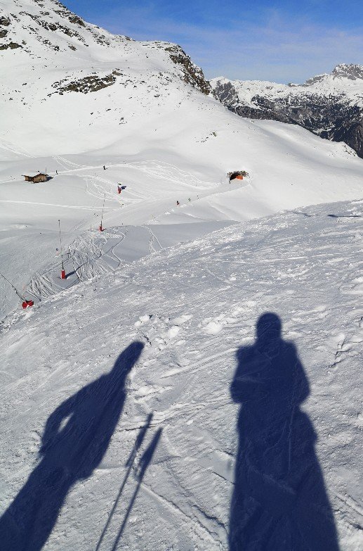 Some people probably think: How boring! Not at all for us. We only stay on the blue slopes, the sky-blue ones if we can. In between, it gets jerky and slippery. Snow is missing.