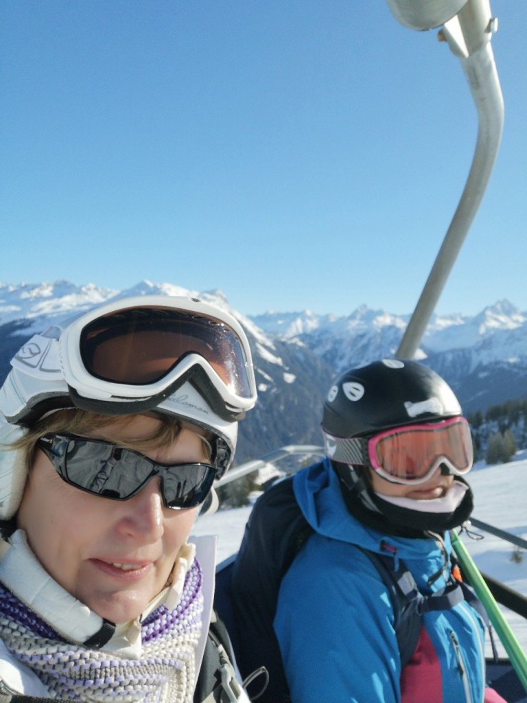 And that felt strange. You’re driving up there all alone, without a chaperone, and you don’t really know what to expect up there. There’s no familiar person skiing in front, who you can follow. I had a bit of a queasy feeling in my stomach. But once up there, there’s no turning back. For a moment I enjoy a breathtaking view of the mountains, the valley. Forget my fear for a moment and use it, gather my courage and down I go, right into that valley below. I stay on blue, almost sky-blue slopes. I promised this not only to my family, my friends, Heidrun , but also to myself. Not to take too much risk!!! I want to go home with my bones intact.