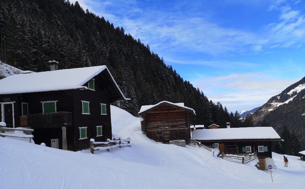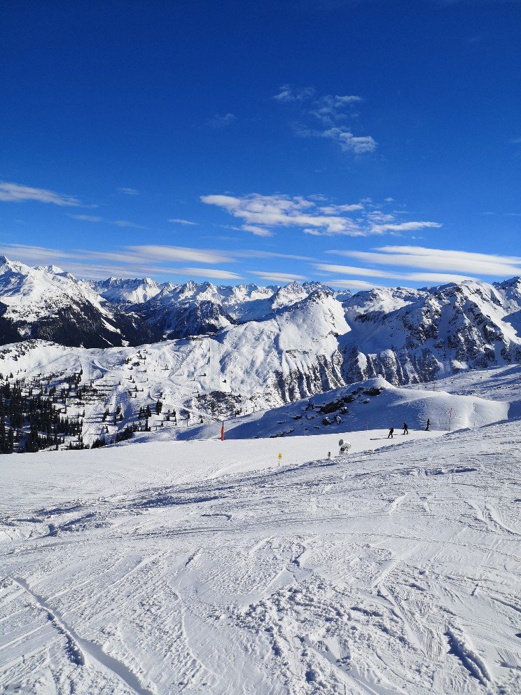 Der Schnee wurde weniger, die Sonne ließ sich ab und an mal blicken. Doch es wurde ziemlich windig. Der Schnee wirbelte wie Sand in der Wüste. Es fühlte sich wie Nadeln im Gesicht an. Schnell wieder runter ins Tal. Auf der Talabfahrt ist es windstill und die ist himmelblau. Ich saß häufig allein auf den Liften. Der Wind hat alle verscheucht. Keine Liftgeschichten heute.