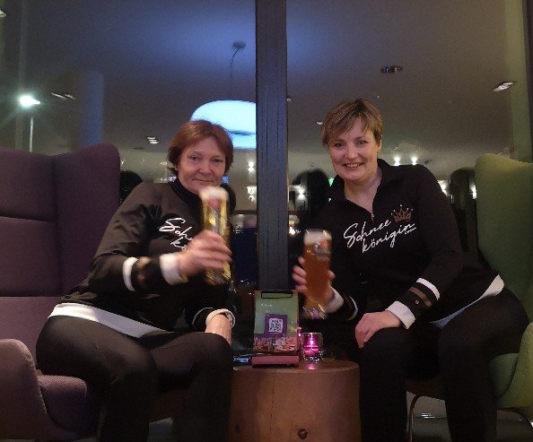 A day alone on the slopes is quite an experience. And what is Heidrun doing? She’s also on her own. I’m a little worried. But she takes them away from me and texts me her exact situation. On the first day of the tour, she broke off the tour because she thought she wouldn’t make it back by 3 pm. When she got back, she realised that she had almost reached her destination. She came back completely exhausted and soaked. She had neither food nor drink with her and fed on snow. Help, Heidrun. You probably need a chaperone, too. The next day she took on the same piece again, this time with tea. And I snatched a pretzel from the breakfast buffet to give to her. Two crazy women on the road without men. This is what comes of it. We can laugh at ourselves, that’s the most important thing.