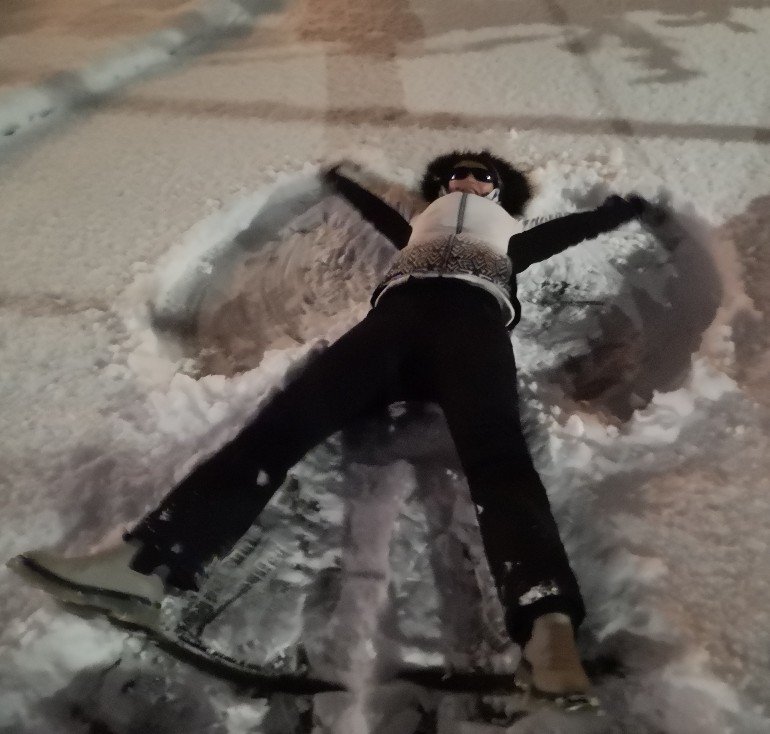 But we had other fun. We sat in our regular chairs in the bar, sipping Apperol Sprizz and looking at the snow enveloping the trees. I really felt like doing the angel. We put on our ski gear, posed in the snow outside the hotel. I threw myself into the pile and enjoyed. We laughed as loud as the ladies in the restaurant. It was just infectious. What a wonderful lazy fun day.