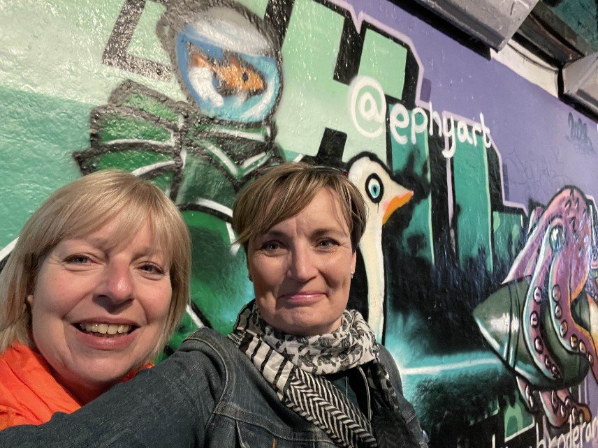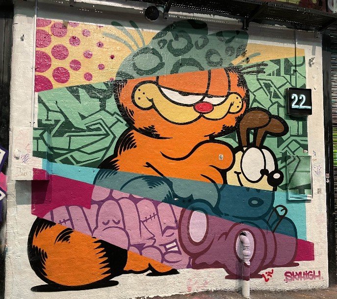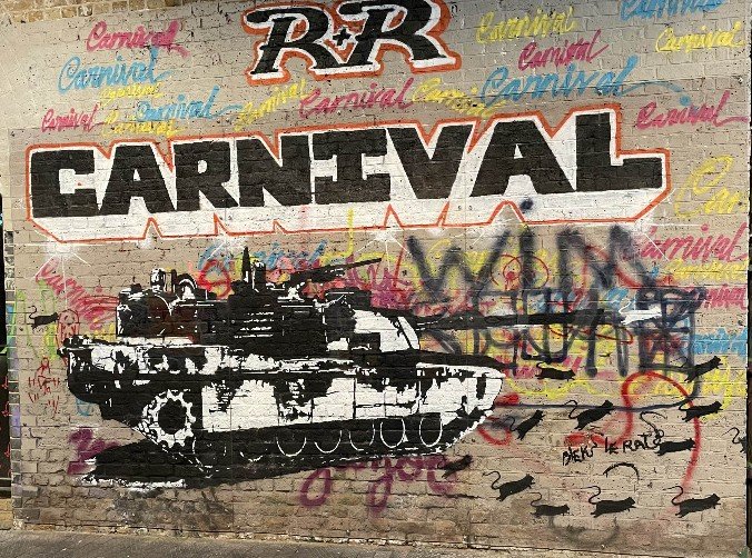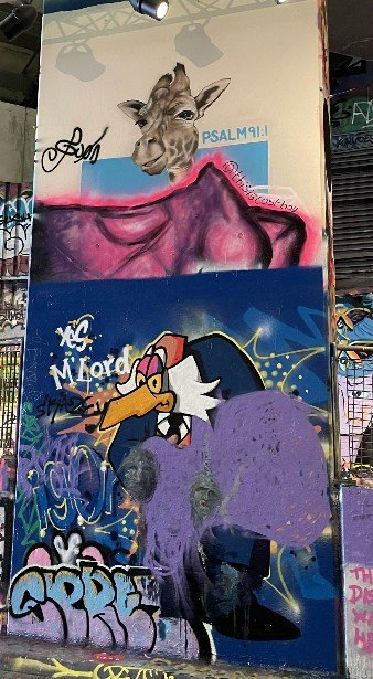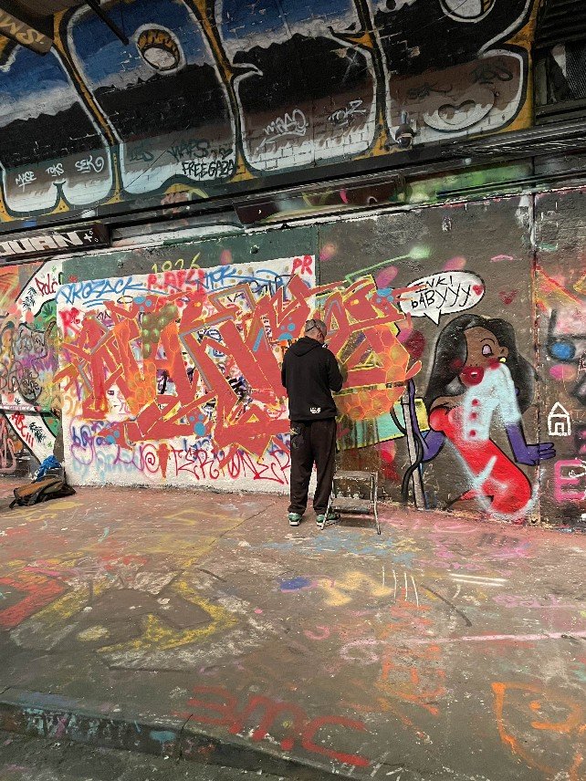 We started with the Leak Street Tunnel, which stretches behind Waterloo Station. A former underground tunnel, converted into a graffiti mile. Street artists are legally allowed to let off steam here. And Banksy has made a start with his work CARNIVAL – the only work that is protected under glass. All the other graffiti can apparently be sprayed over. It smelled of turpentine, three artists were at work armed with spray cans hidden under FFP3 masks. What can you get out of such an old grey tunnel?! The colours glowed from everywhere, the walls, the floor, the ceiling. A real little gallery. You can go through it several times and always find something new. There is also a library in the tunnel where you can borrow various board games and try them out on the spot. You sit comfortably, play games and order something to eat if you get hungry. We wanted to go further. There was still so much to discover.