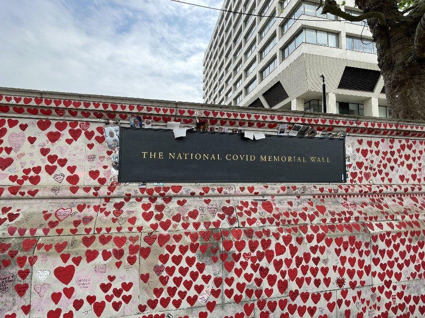 Nämlich das ganze Westminster-Viertel: Westminster Bridge, Big Ben, Houses of Parliament, Westminster Abbey, in der vor kurzem die Krönung stattfand. Es war kurz vor 12. Gleich läutet der berühmte Big Ben Gong. Wir blieben auf der anderen Seite der Themse, schauten uns in der Zwischenzeit die Covid Gedankwand an: um die 200 000 Herzen, je eins für jedes Covid-Opfer im UK, Die Füße trugen uns dann weiter über die Brücke zur Westminster Abbey. Oder besser gesagt, wir ließen uns schieben. Es war verdammt voll im ganzen Westminster Viertel. Stau auf dem Fußgängerweg. Massen an der Abbey und eine Riesenschlange davor. Und eigentlich sind die Kirchen durch die Reformation doch ziemlich schmucklos. Das ist der Hype, der hier um die Royals gemacht wird. Vielleicht hat ja Charles bei seiner Krönung irgendetwas vergessen. Wir liefen weiter zu den Horseguards an der Downing Street entland. Wir hatten Glück – es fand gerade eine Wachablösung statt. Eine Show!!! Mir taten die Pferde leid.