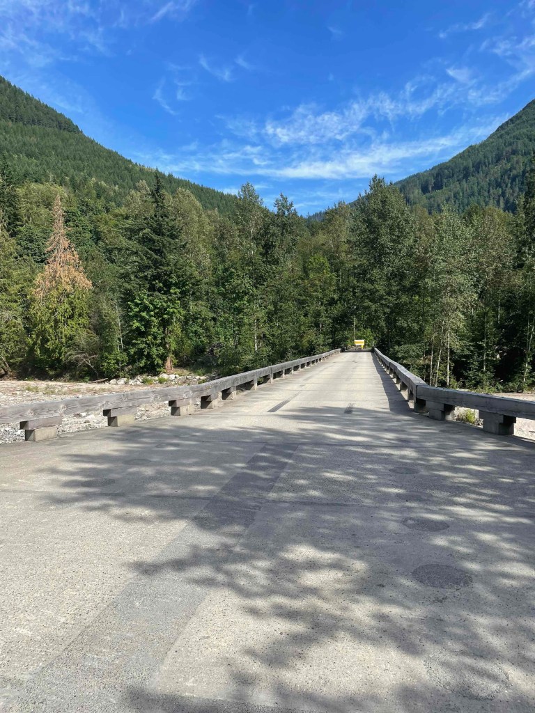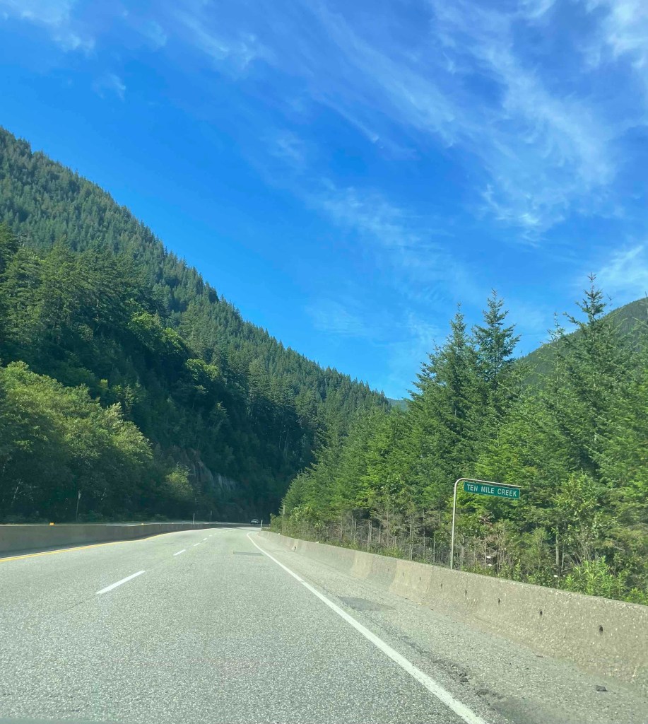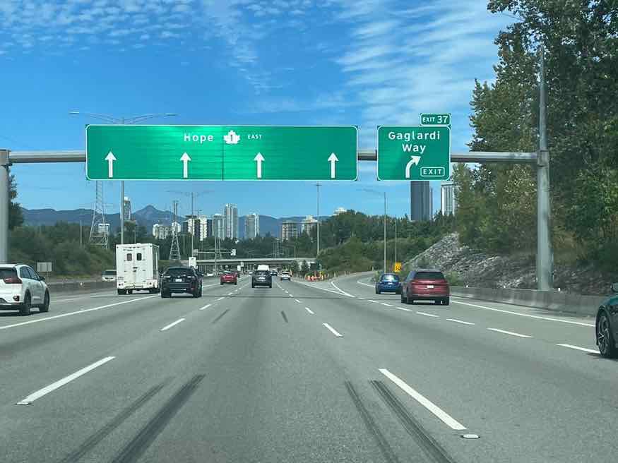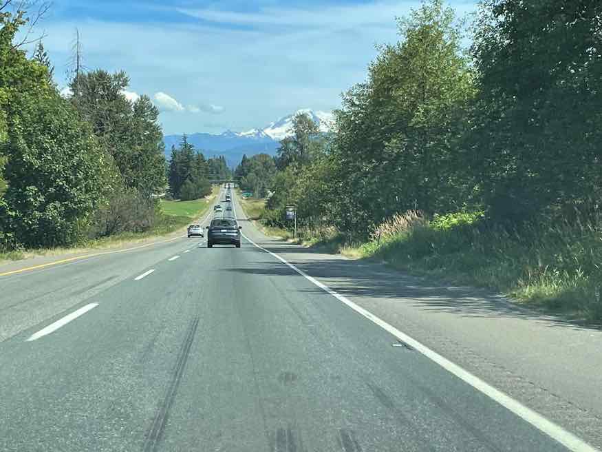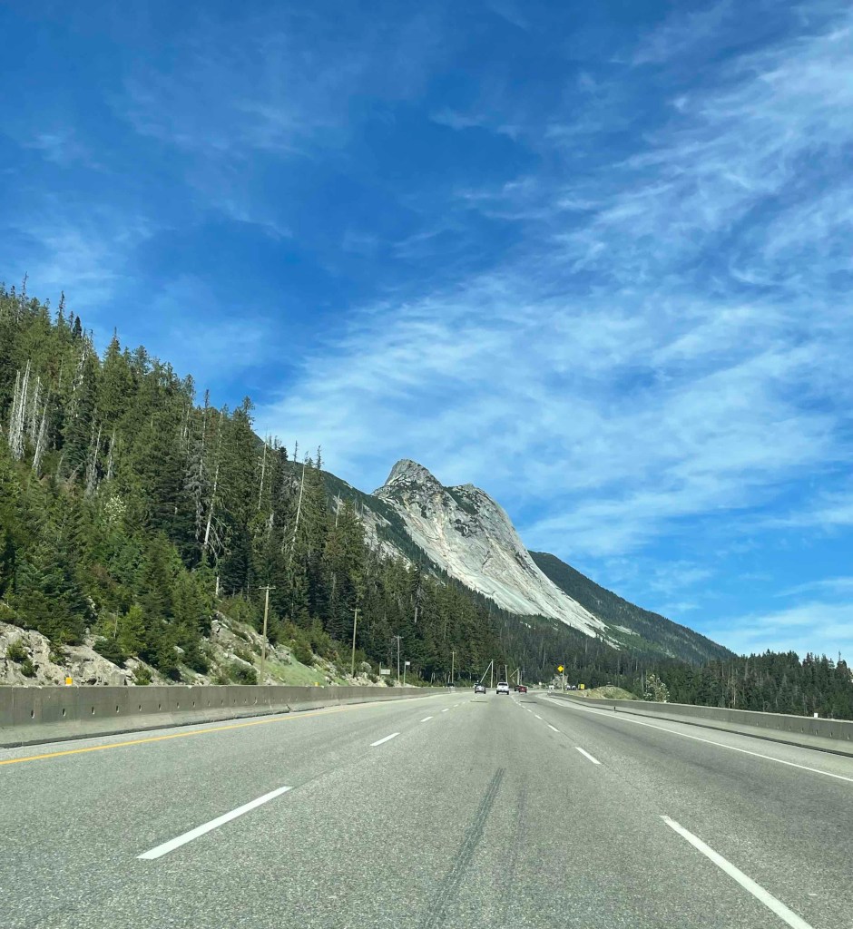 Ausgestattet mit Proviant fuhren wir los in Richtung Kamloops. 350 km von Vancouver entfernt, ca 3,5 h Autofahrt lagen vor uns. Ob wir die heute schaffen, wagte ich zu bezweifeln. Aber es lief richtig flüssig, mit ca 80 km/h aus der Stadt heraus auf dem Highway 1, durch das lange flache Stück in Richtung Berge. Ein großer weißer Klops von Gletscher vor uns, von dem wir immer noch nicht wissen, wie er genannt wird. Ich übernahm die ersten 170 km und Heidrun wechselte mitten in der Pampa. Wir wollten nach Unterkünften suchen, aber hatten dort kein Netz. Ja, wie auch. Da waren nur Bäume, Berge, Fluss und Steine.