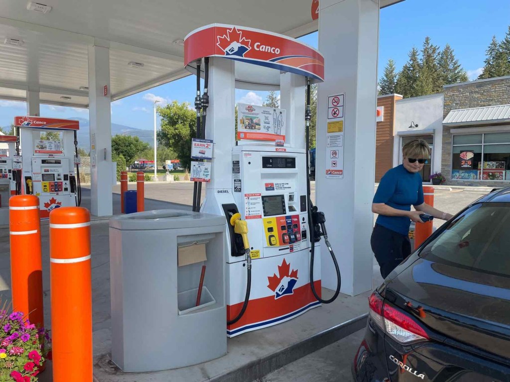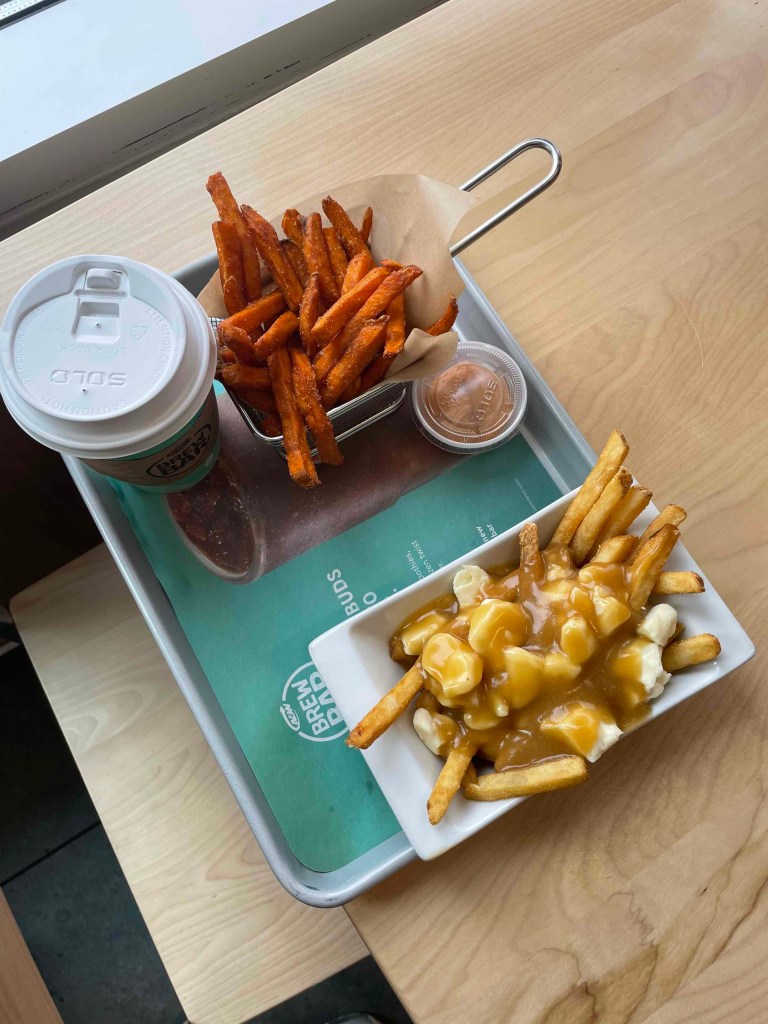 Zwischendurch gibt es eine Tankstelle mit Fast Food Restaurant. Wir machen mal kurz Pause für einen Fahrerinnenwechsel und für eine Stärkung im Restaurant. Heidrun probierte Poutine, nicht Putin. Das ist ein typisch kanadisches, ’sehr gesundes‘ Gericht bestehend aus Fritten, Käse und einer Soße. Noch ein Americano, denn der ewig lange Highway, der zum größten Teil geradeaus geht, macht müde. Das kostenlose Wifi genutzt, um Nachrichten von zu Hause zu checken und ein Lebenszeichen abzusenden. Ich hatte auf der ganzen Fahrt seit Kamloops kein Netz. Wofür braucht man das auch? Online bestellen? Amazon liefert bestimmt nicht hier aus.