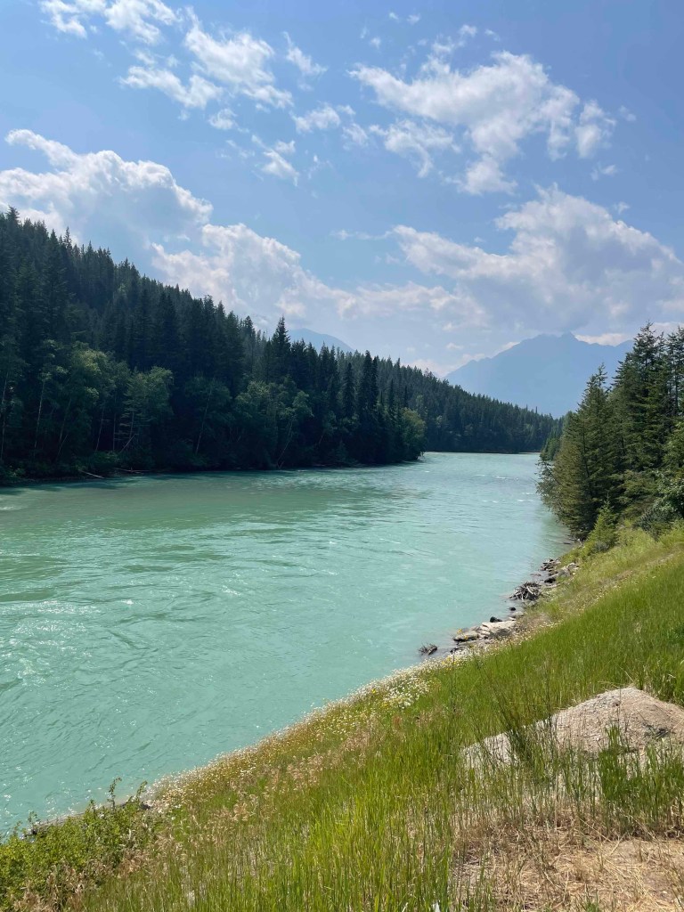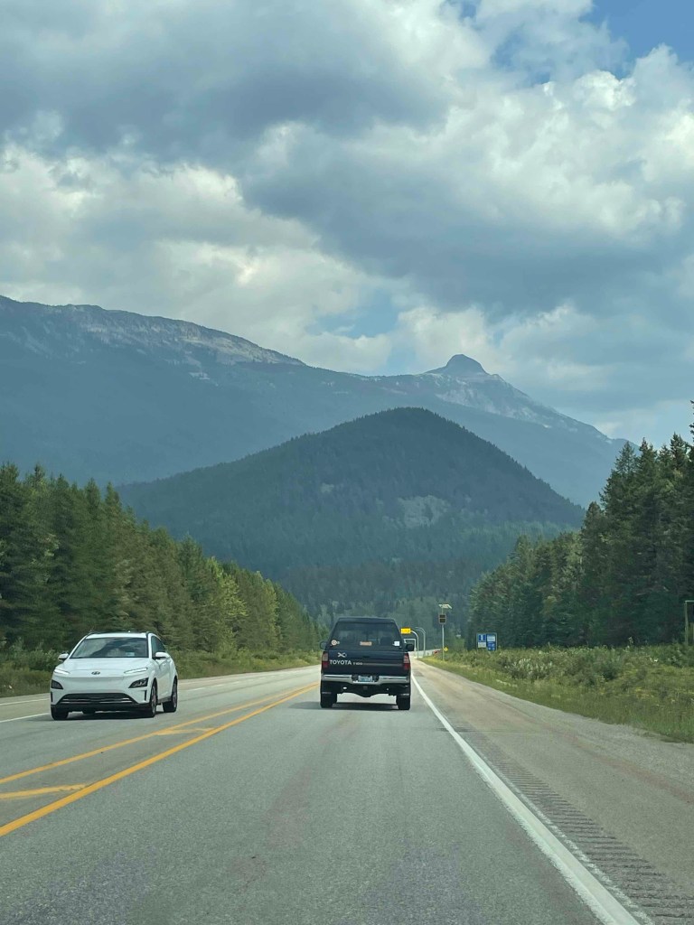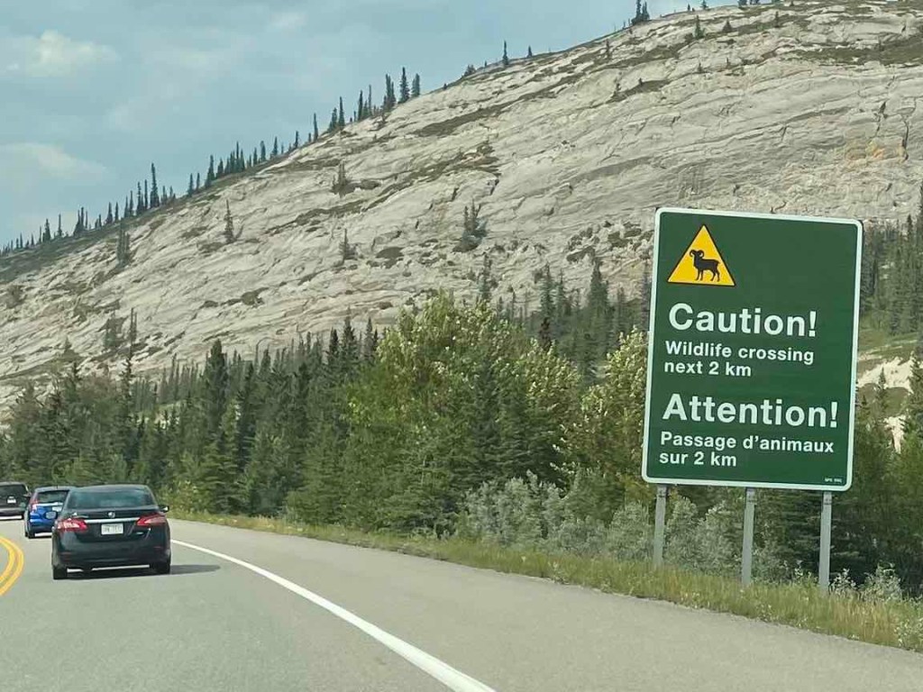 We also visited a supermarket in Clearwater to be on the safe side, refuelled and off we went through deepest Canada. Clearwater actually seemed to be almost the last place before Jasper National Park. That was my feeling. Instead of towns on the side of the highway, only construction sites on the highway testified to the existence of life. And that every 5 km or so. Sometimes a construction worker with a slow/stop sign in his hand stood at the edge of the road and we had to wait a short while. But most of the time, the traffic moved quickly and smoothly. I only wonder if the construction workers live on the building sites, because there is no house far and wide. Only deep dark forest, wild rivers and mountains, mountains, mountains – as far as the eye can see. In the middle of it all, the highway, with as many trucks as cars, driving at the same speed and sometimes faster. I felt differently when they overtook us. Huge campers, almost trucks too, had another car in tow in the back. And when I say car, I mean pickup truck. What kind of dimensions are these?